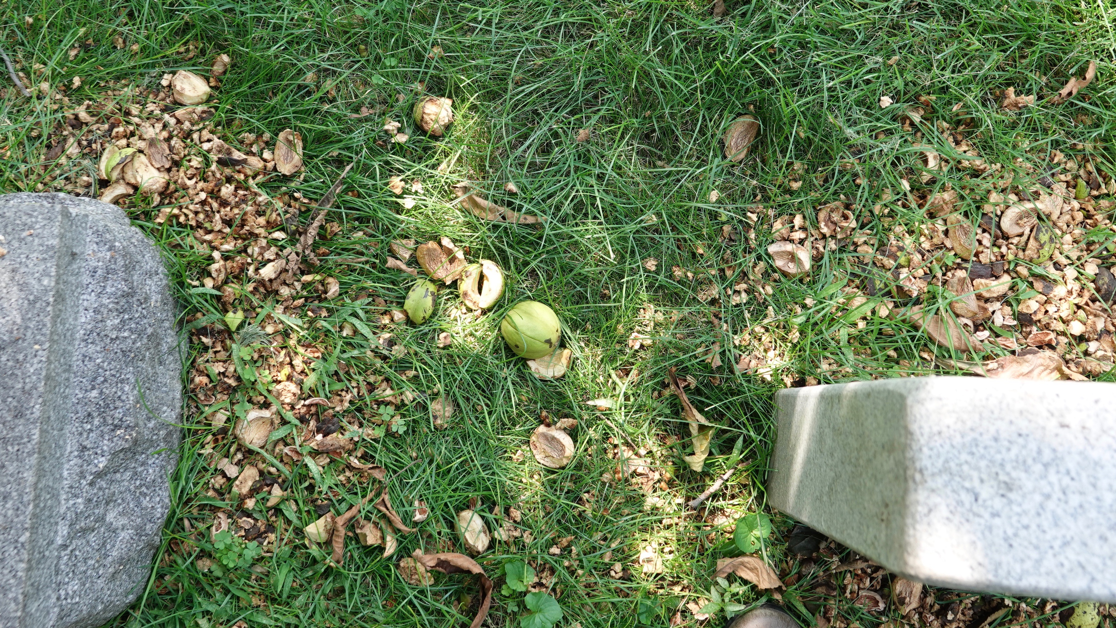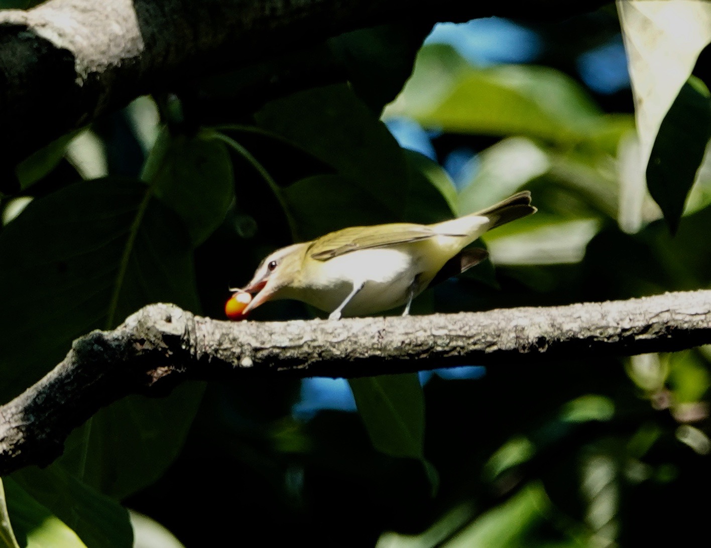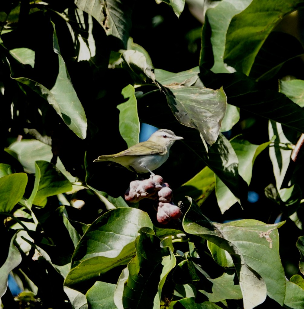 A soft rain of pieces of cucumber magnolia fruit reveals a tree, thickly cloaked in big, thick leaves, busy with Red-eyed Vireos, Catbirds, four different species of thrush. Across the road, the noisier fall of hickory husks point to squirrels at work.