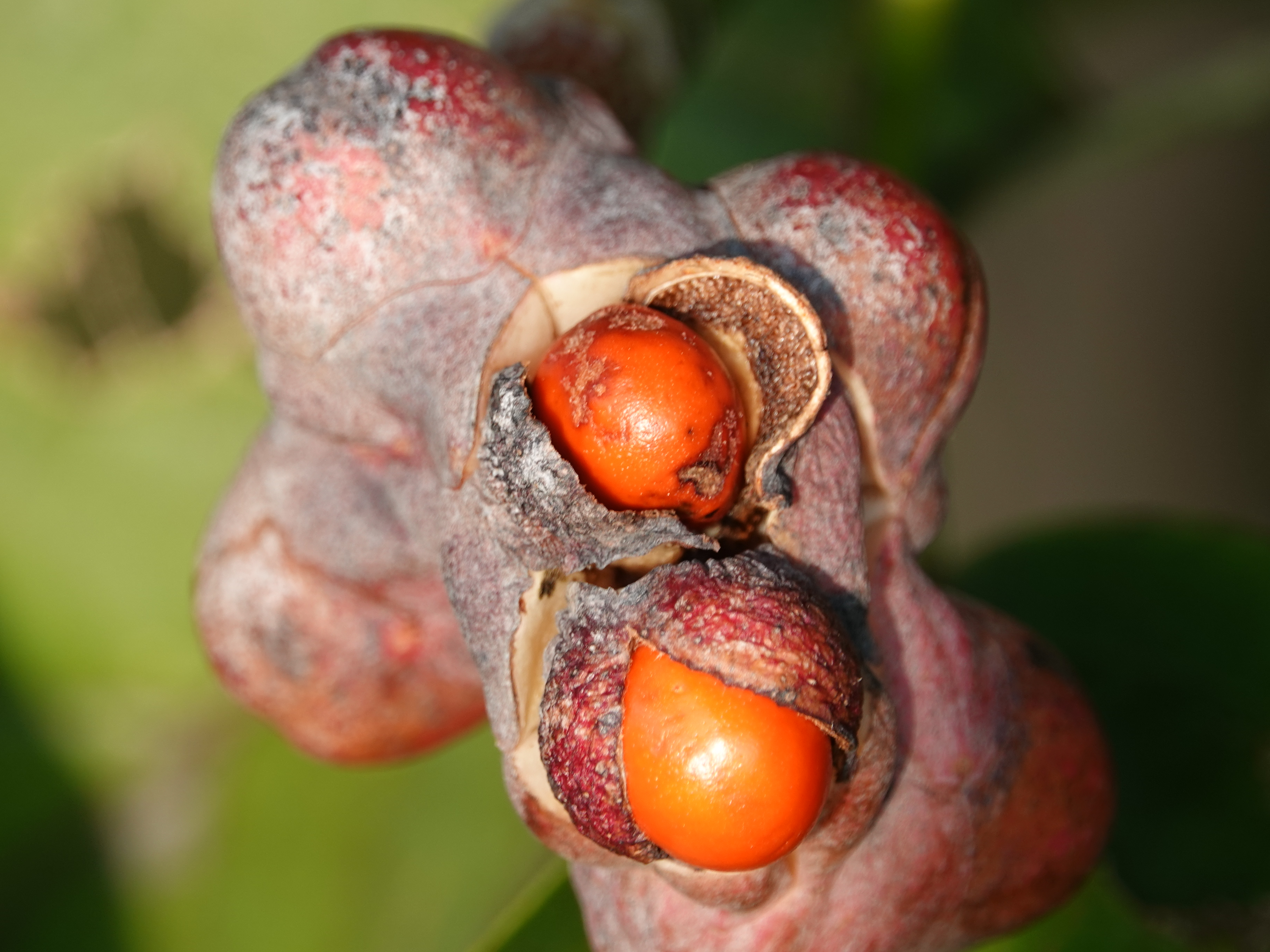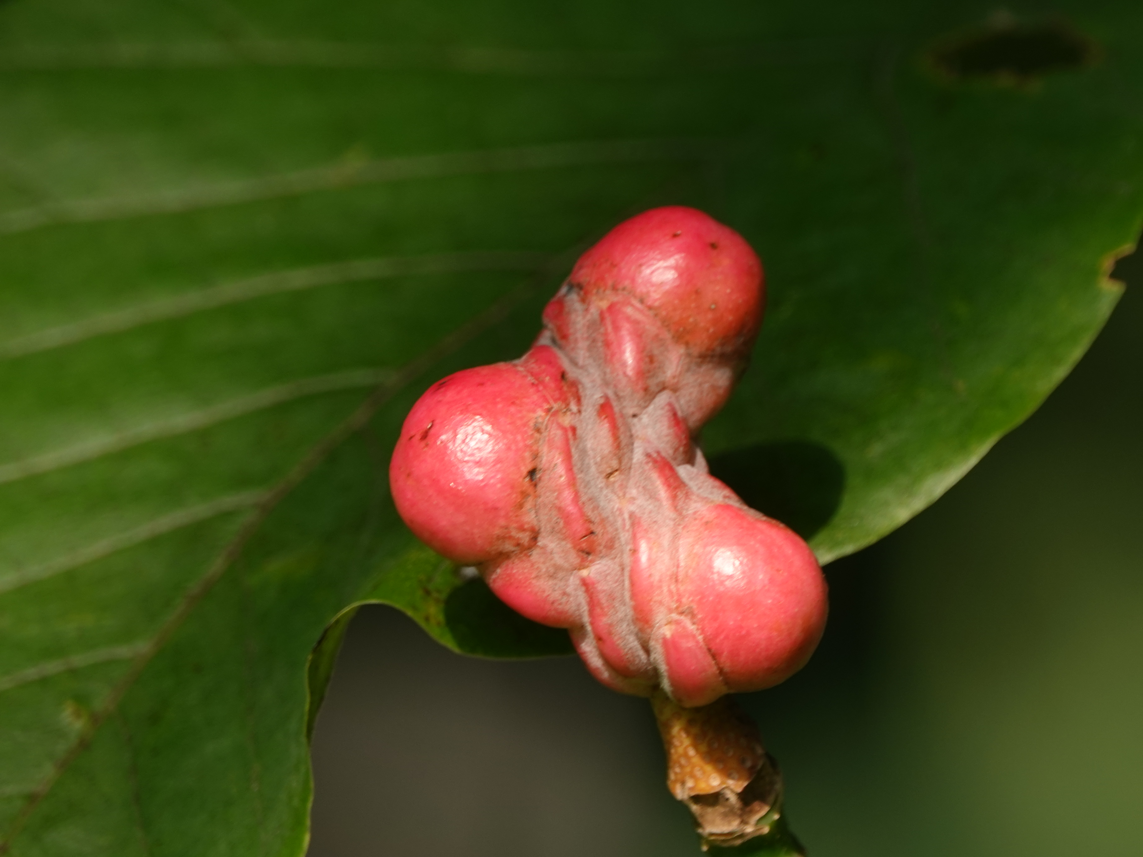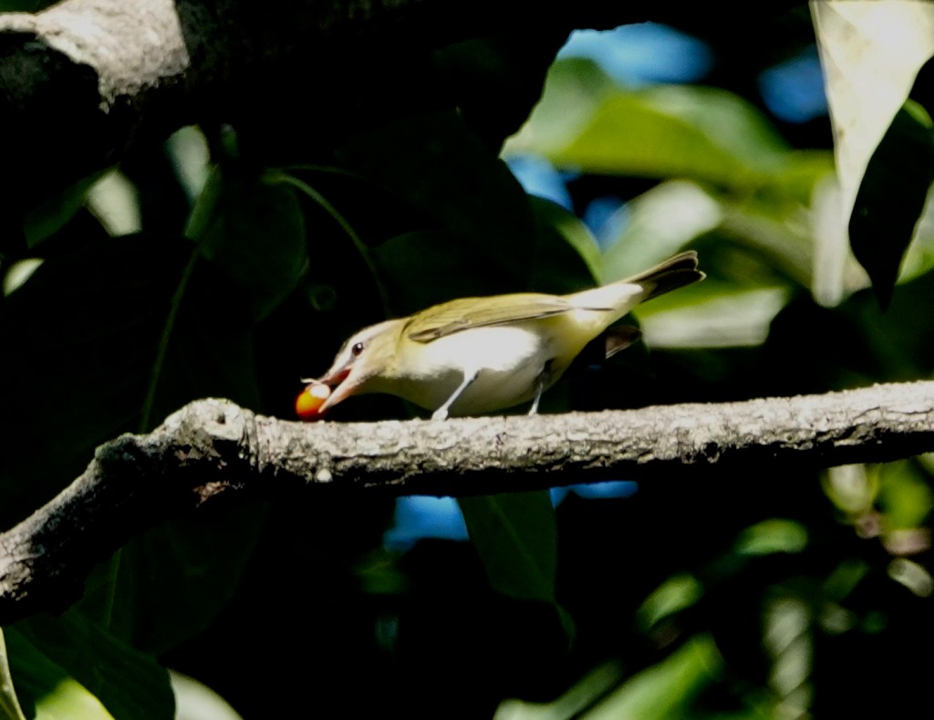 A soft rain of pieces of cucumber magnolia fruit reveals a tree, thickly cloaked in big, thick leaves, busy with Red-eyed Vireos, Catbirds, four different species of thrush. Across the road, the noisier fall of hickory husks point to squirrels at work.