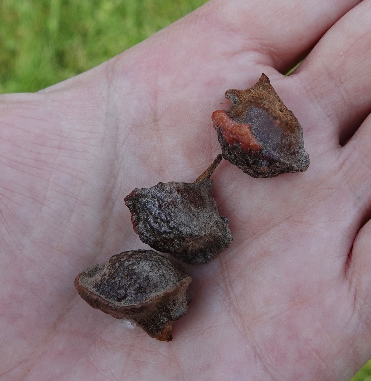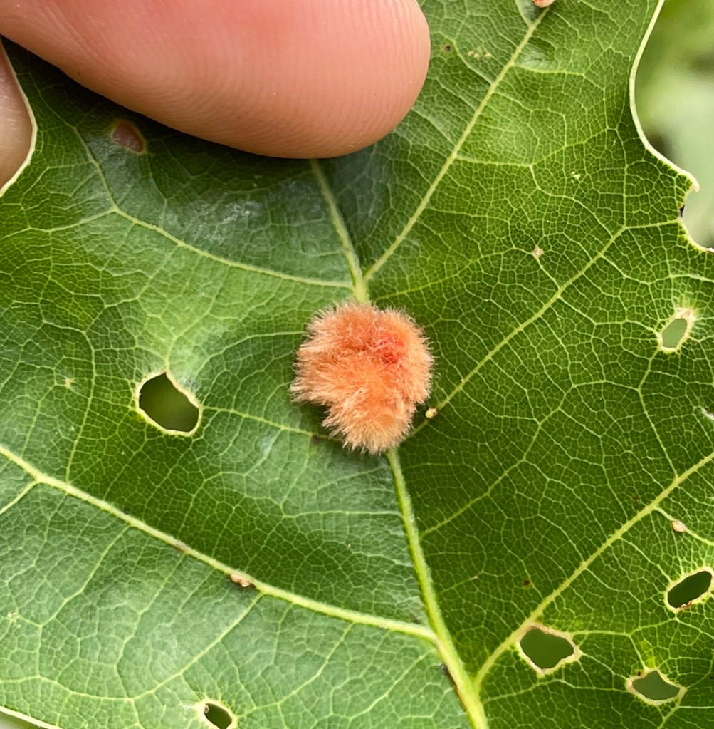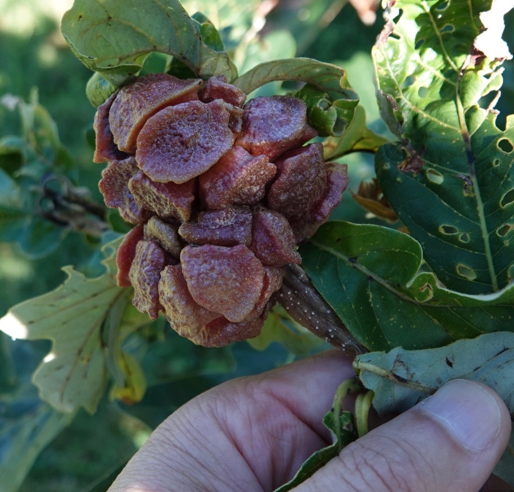 Zopheroteras guttatum on Quercus texana. Nutall oak has a common name, but the tiny wasp that commandeered the tree’s chemistry to induce this structure doesn’t. Under 2mm in size, but flamboyantly patterned. Inside is the larval wasp.Here’s another species on the same tree: Furry Oak Leaf Gall Wasp (Callirhytis furva).. And another: Oak Leaf Gall Midge (Polystepha pilulae). This one is induced by a midge, not a wasp.Lobed Oak Gall Wasp (Andricus quercusstrobilanus) on swamp white oak (Q. bicolor). One of the biggest of the 39 species of Cynipid gall wasps seen within 2.5 miles of my Brooklyn home. (Although these can be much smaller on other swamp whites here.) This one is a stem gall; the others here are leaf galls.Many of these galls are detachable; they fall of their own accord. With autumn approaching, others will come down the ground as the whole leaf falls.The larval wasp, or midge or mite, gets protection and food from these structures. What, one wonders, does the tree get out of this? Well, they do contain and isolate the pest away from the main body of the plant. Is that so galling?