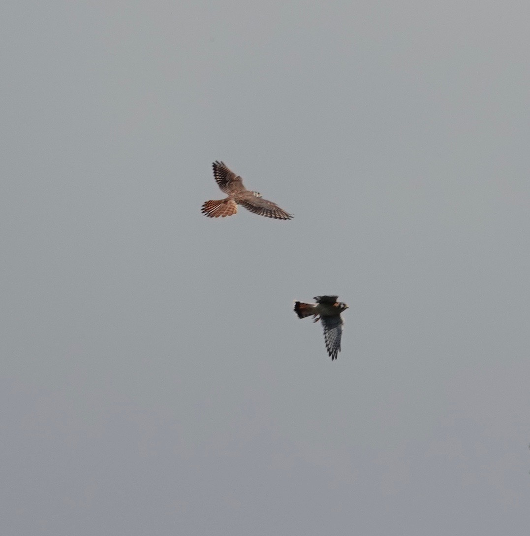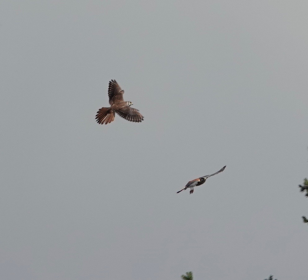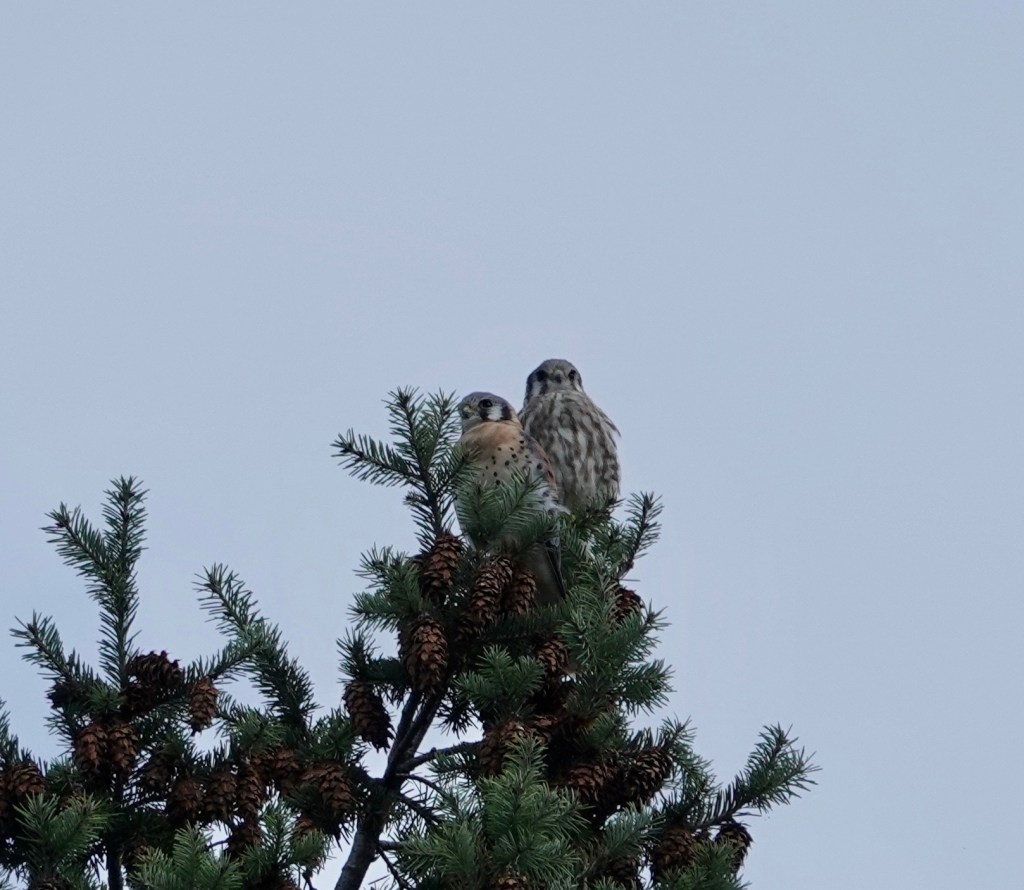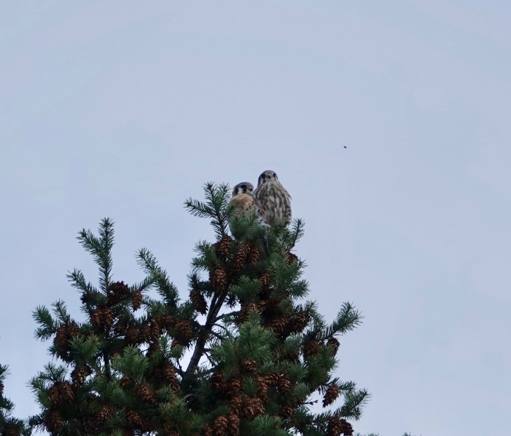 Incoming! American Kestrel pair in Green-Wood. Earlier, I’d seen a pair on the big antenna half a mile to the south of this conifer. Same or different birds? What’s their range in the city?