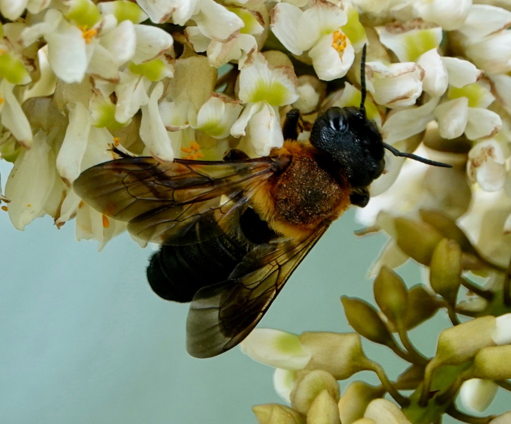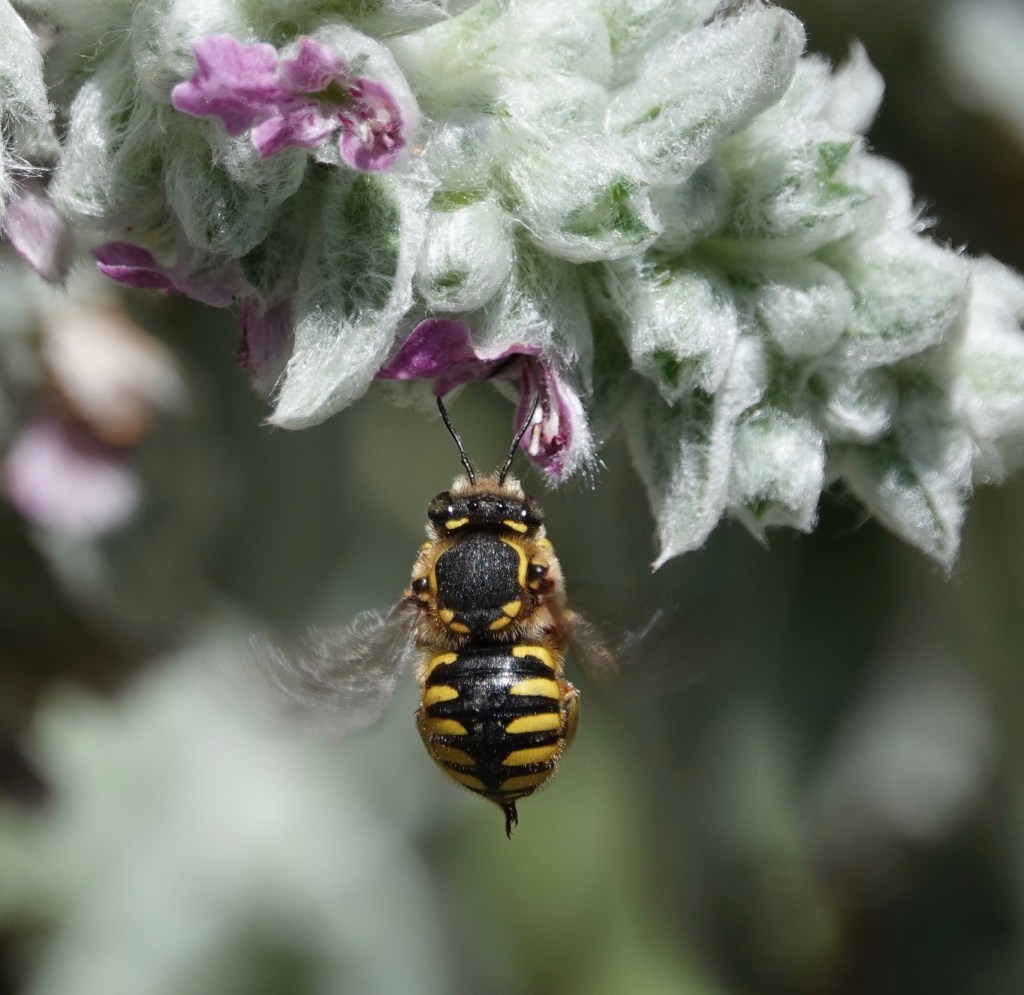 Generally speaking, both of these bees seem to thrive on non-native plants here. The big resin bees are a problem for native carpenter bees. The smaller wool-carders are ridiculously aggressive and chase off everything from their patch.