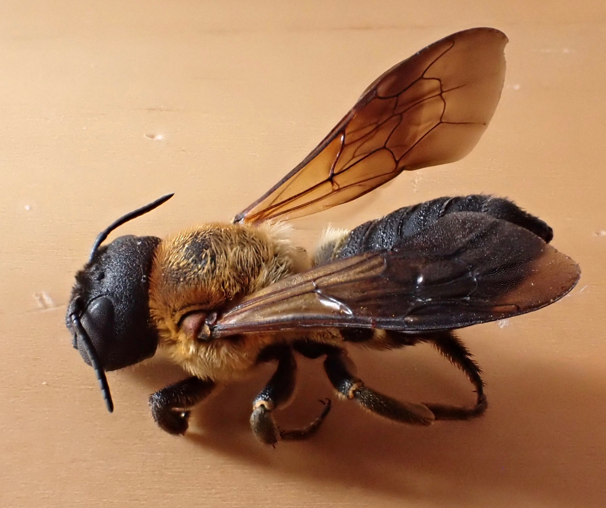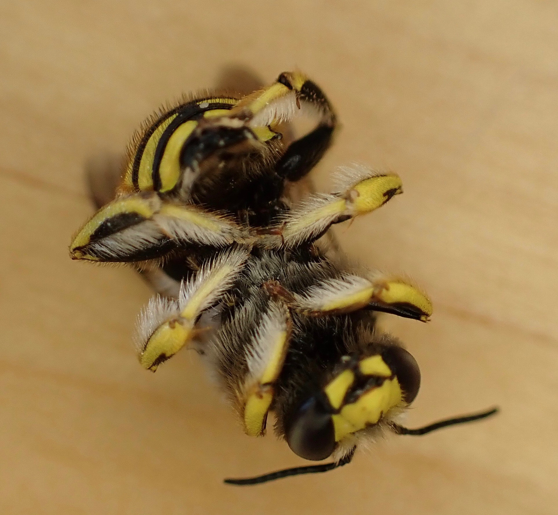 European Wool-carder Bees (Anthidium manicatum). Both of these species are native to Eurasia. The large resin bee is a relatively recent addition to North America, first being reported in North Carolina in 1994. The smaller wool-carder, so named because it gathers “wool”-like plant fibers for its nest, arrived “before 1963” — both dates from bugguide.net.