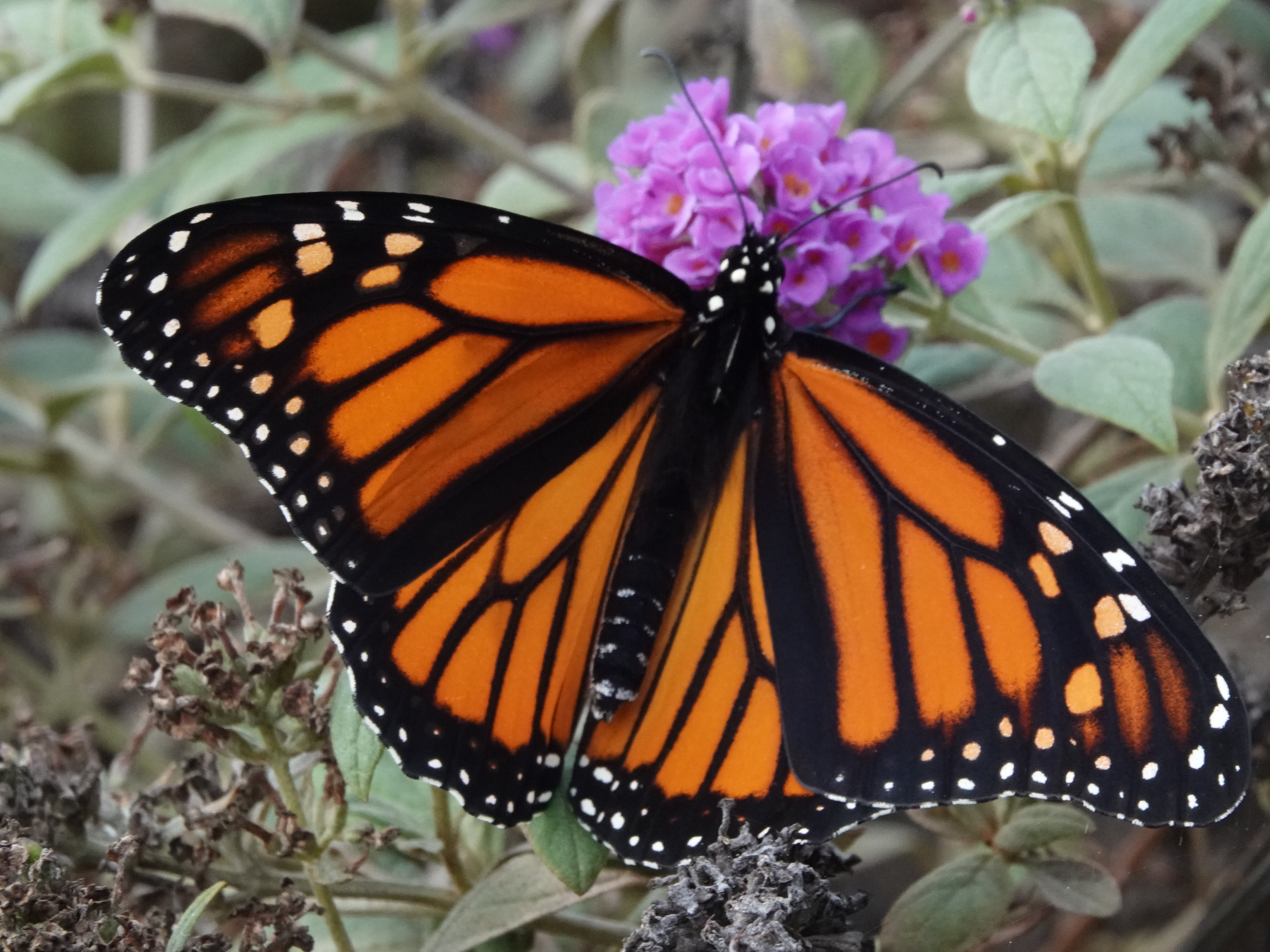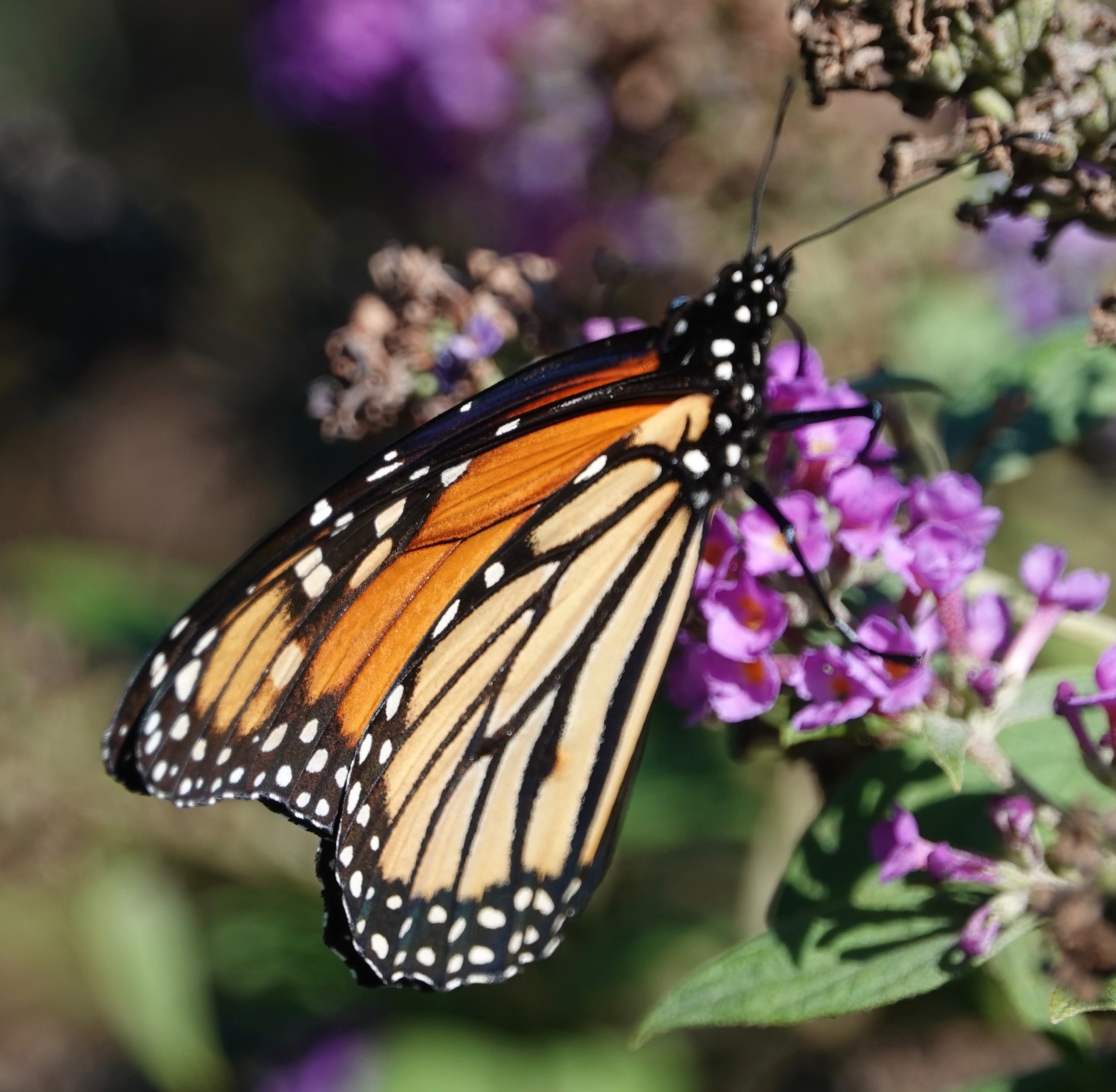 Late migrants might be taking advantage of the lack of predators to avoid. Fall migration is close to finished. This Monarch looks pristine, as opposed to many I saw earlier in the fall which had missing antennae, damaged wings and appeared much more dull in color. And those were the ones which had survived the gauntlet up to that point. If a quick freeze doesn’t kill the late migrants and enough flowers remain to fuel the journey, this might be a wise survival strategy. There is also less in the way of toxins remaining on the plants because farmers use the noxious chemicals on and around crops, most of which have already been harvested. There seems to be a significant advantage providing the bug is lucky enough to avoid severe cold and high wind.