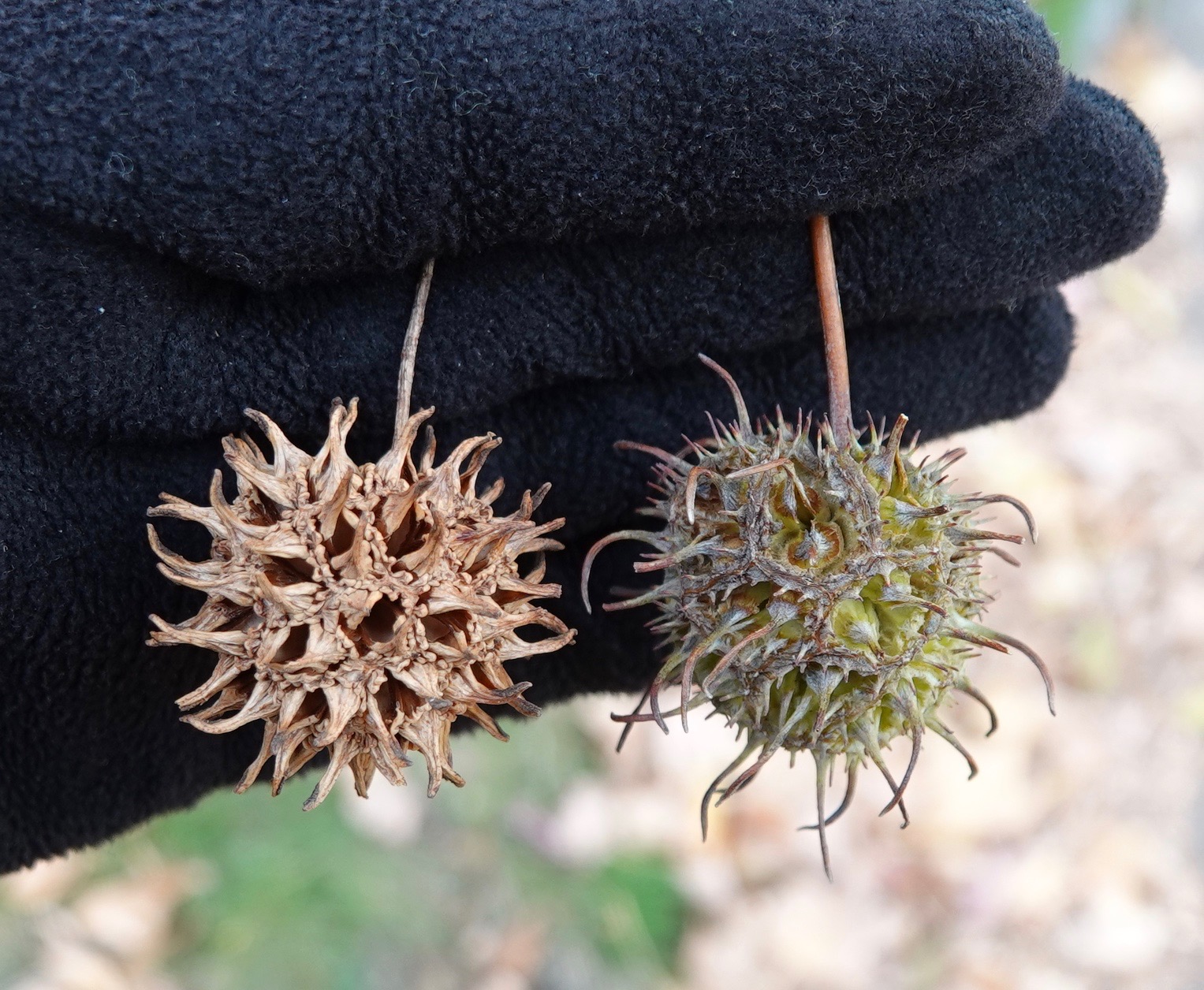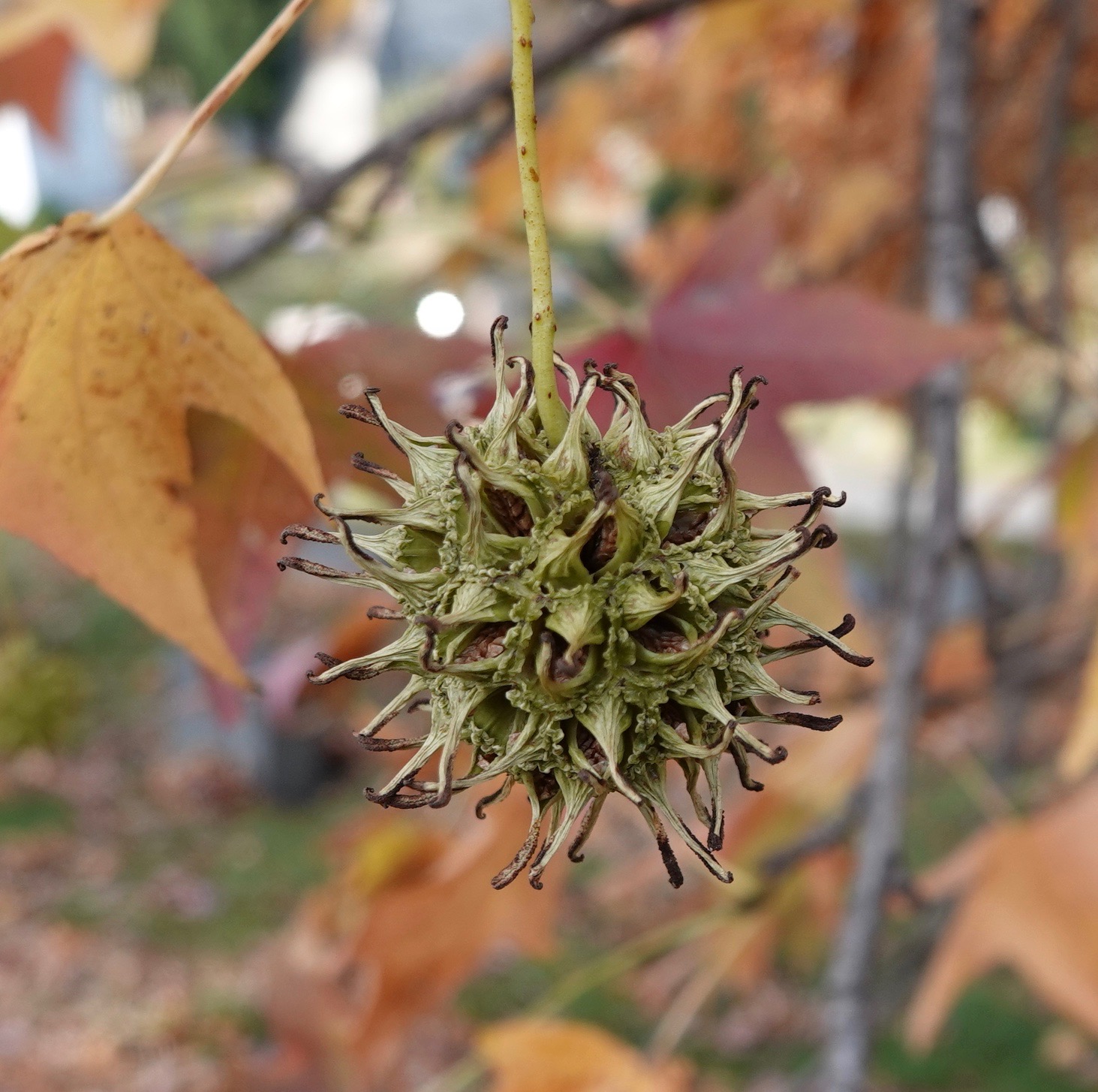 Liquidambar acalycina, which iNaturalist calls Chang’s Sweetgum. These are the Burgundy Flush variety, but this has been such a rotten year for foliage. Compared to American Sweetgum, Liquidambar styraciflua, the leaves here are different, but the smaller, longer-horned seedpod is the quickest way to tell them apart.