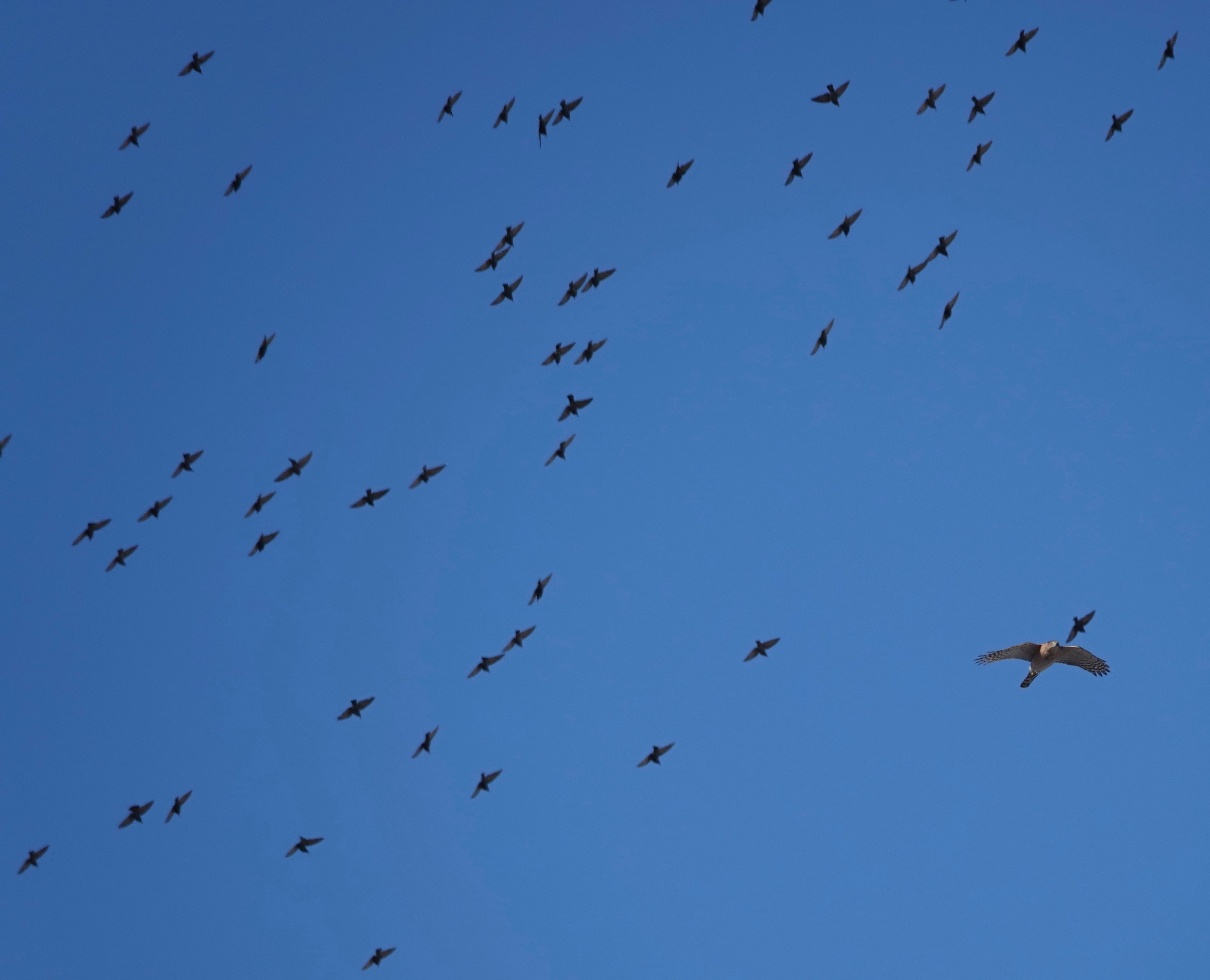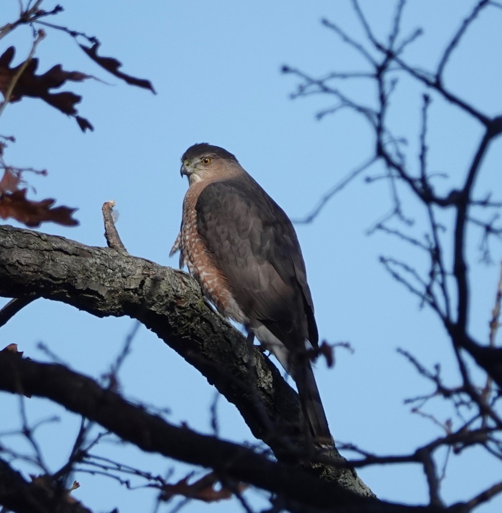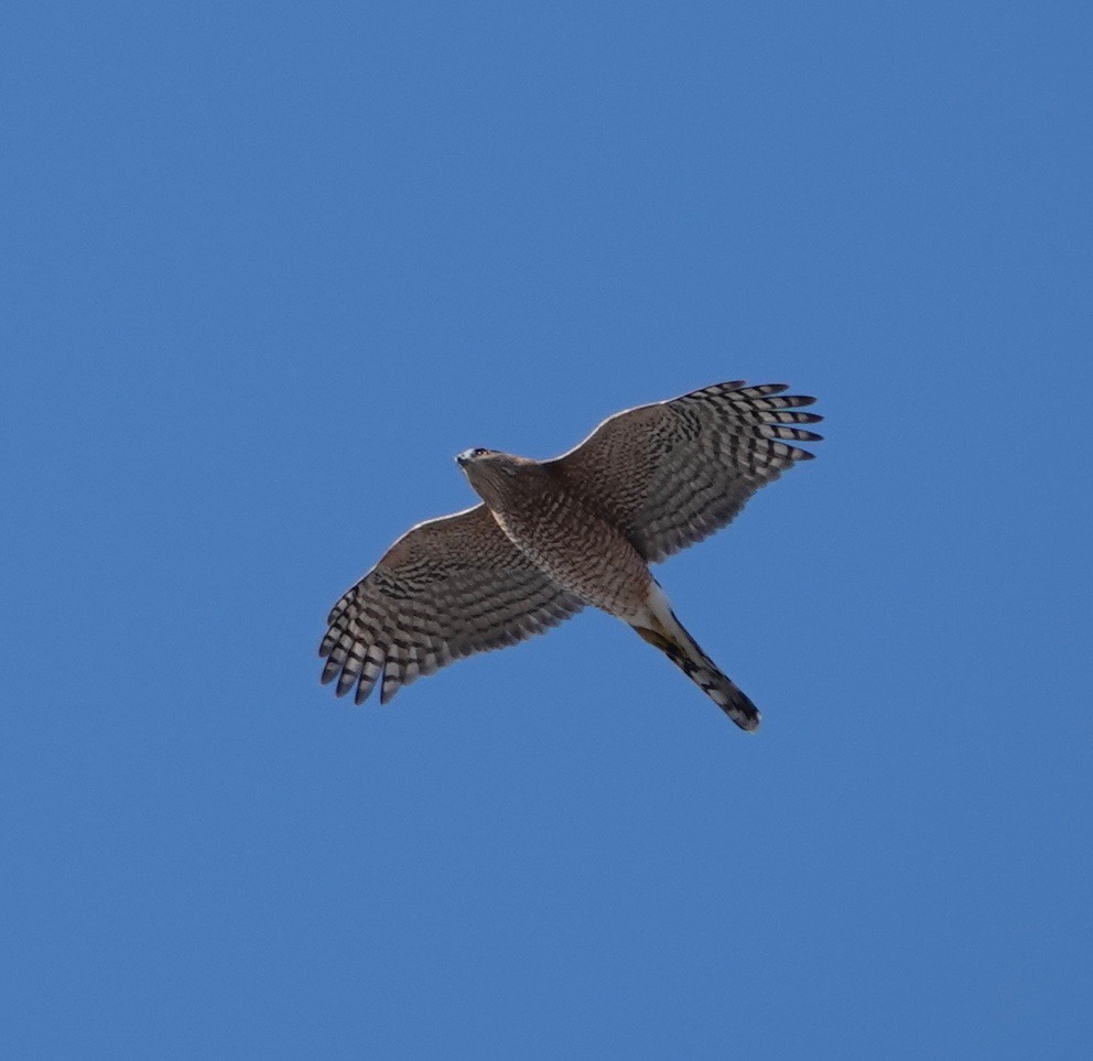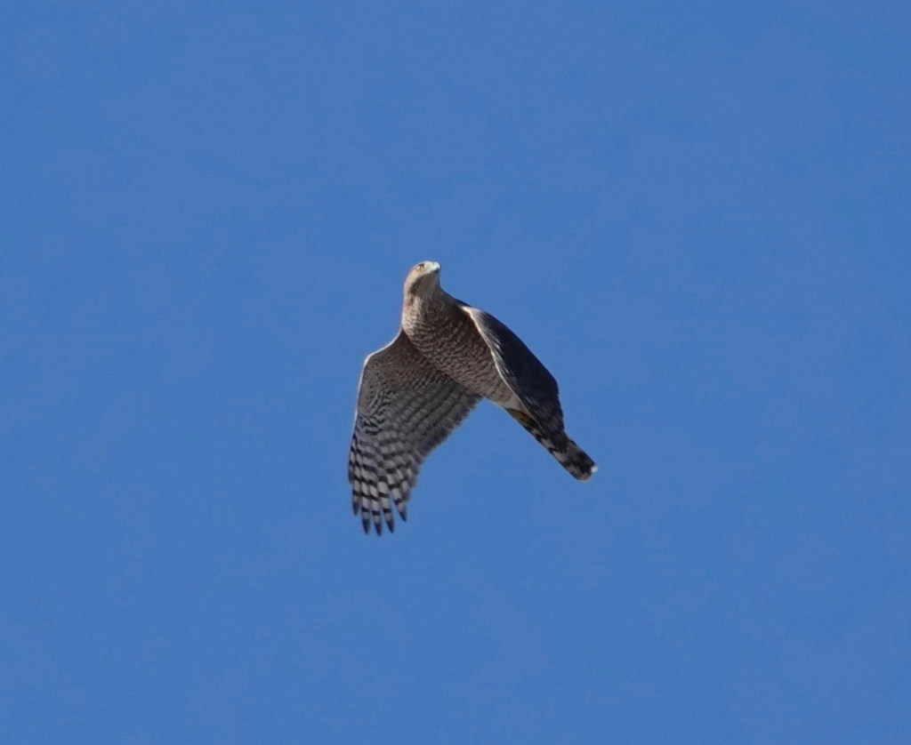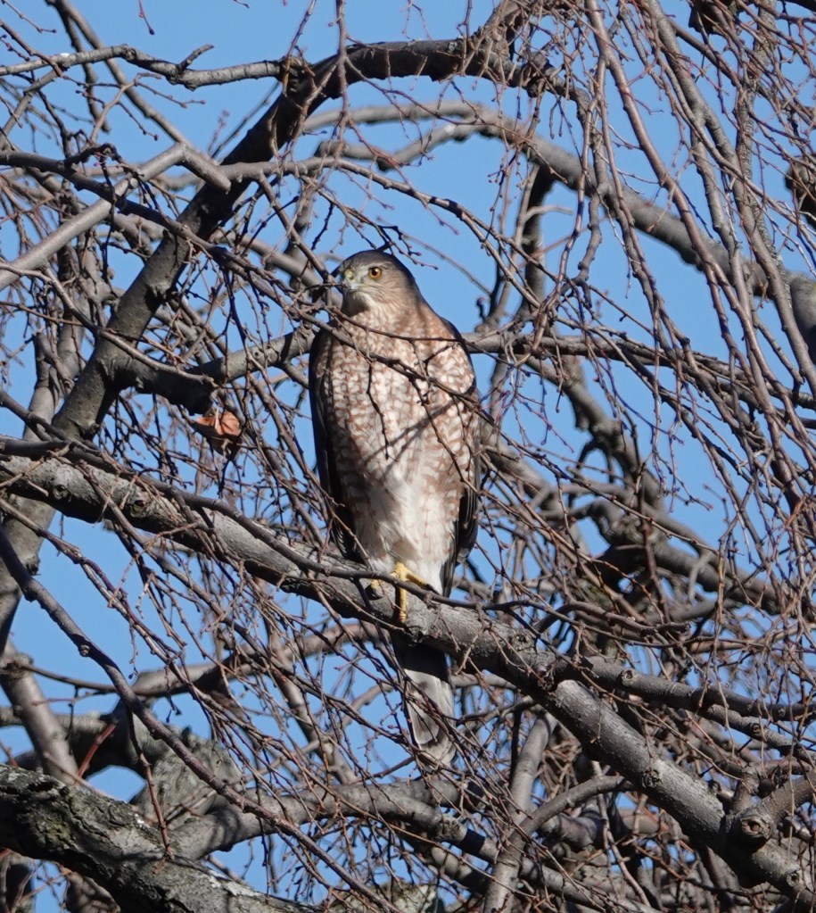 How different a mature Cooper’s Hawk is from a youngster.Two views of a youngster. Splotchy brown back, vertical streaks in front. The yellow eyes will turn orange and even reddish with age. Age also brings a blue-gray back and russet to the bird’s front.Starlings running interference. Pigeons do this, too, when a Coop is on the prowl.