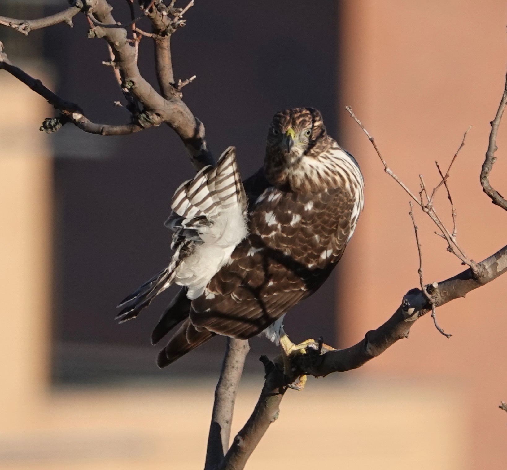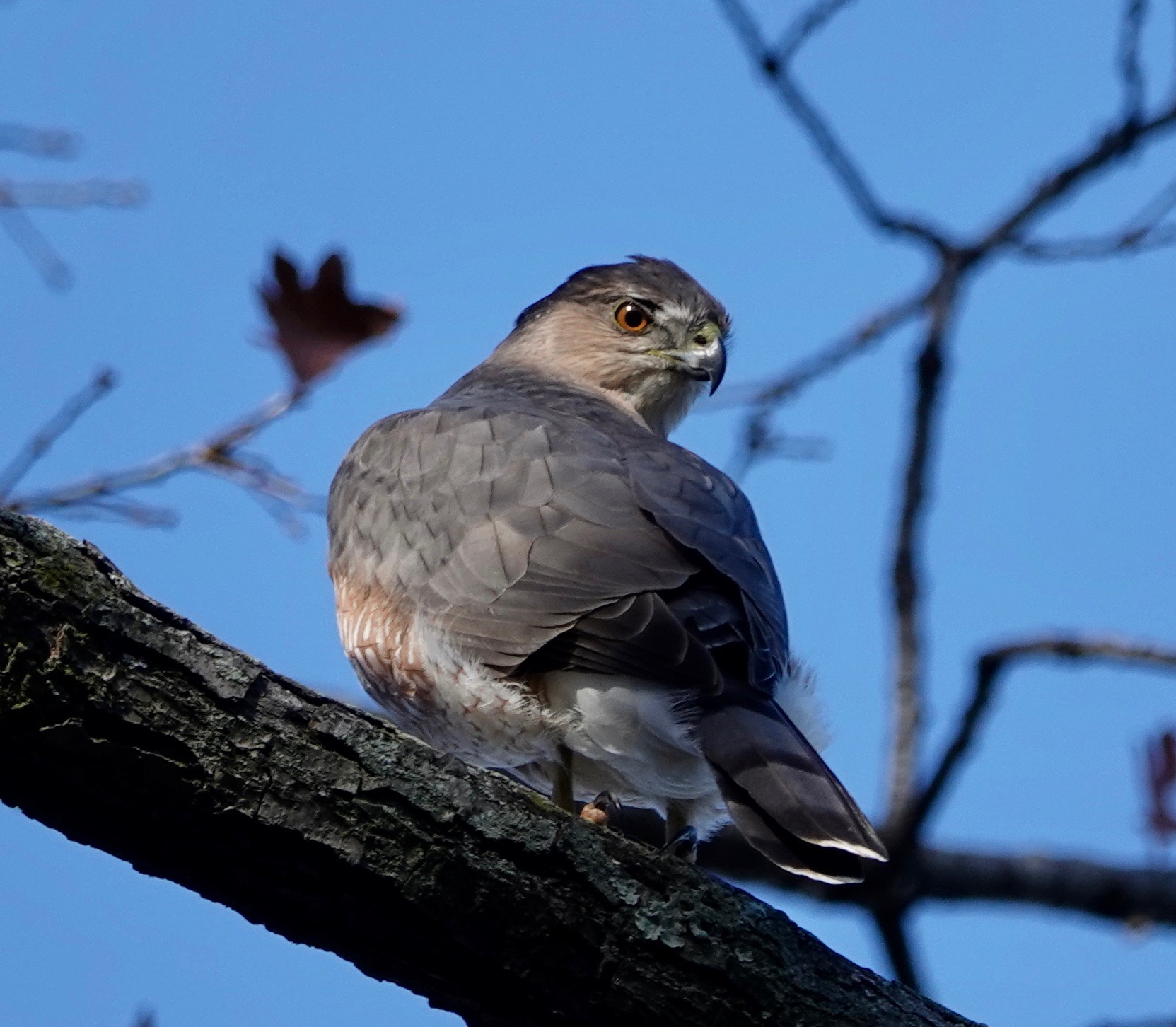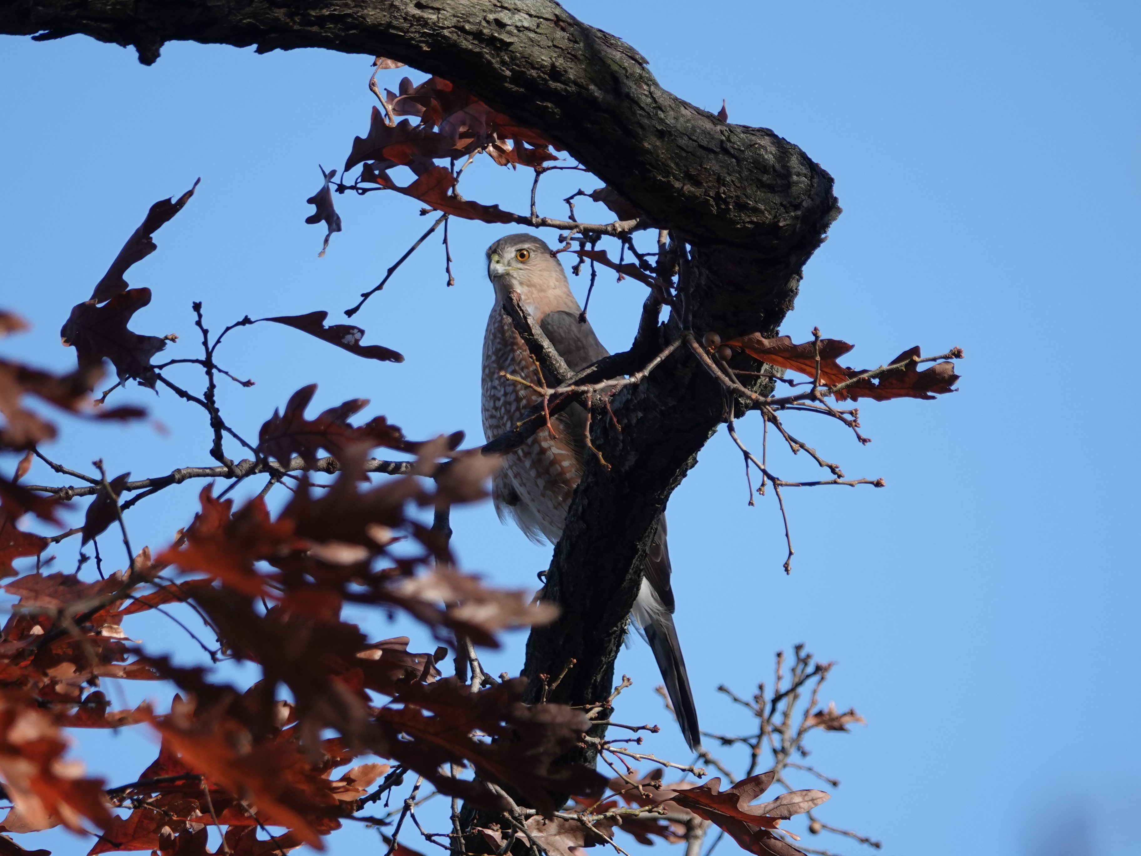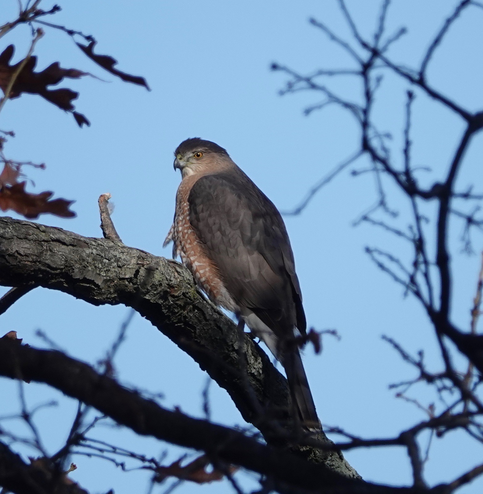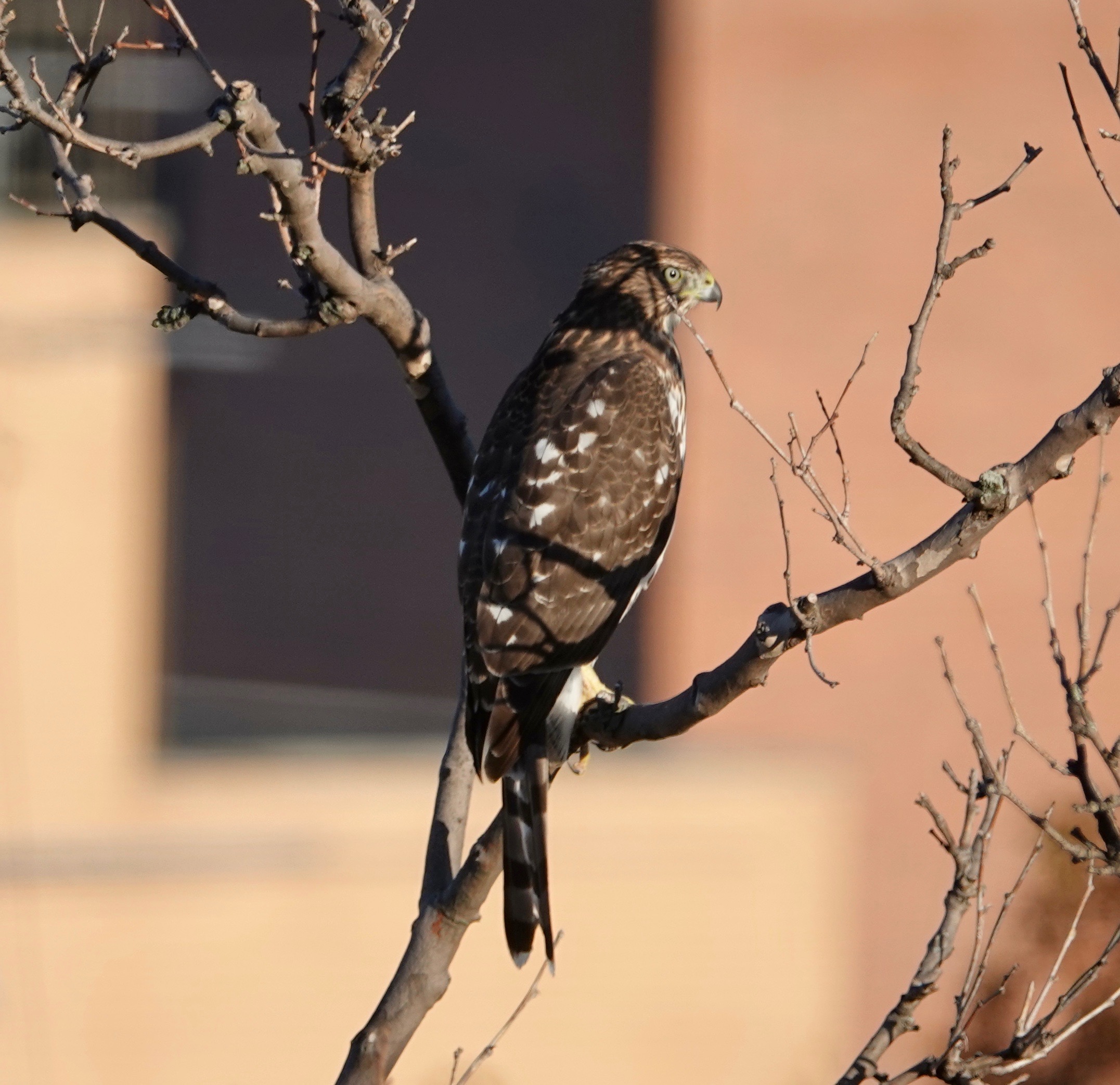 How different a mature Cooper’s Hawk is from a youngster.Two views of a youngster. Splotchy brown back, vertical streaks in front. The yellow eyes will turn orange and even reddish with age. Age also brings a blue-gray back and russet to the bird’s front.Starlings running interference. Pigeons do this, too, when a Coop is on the prowl.
