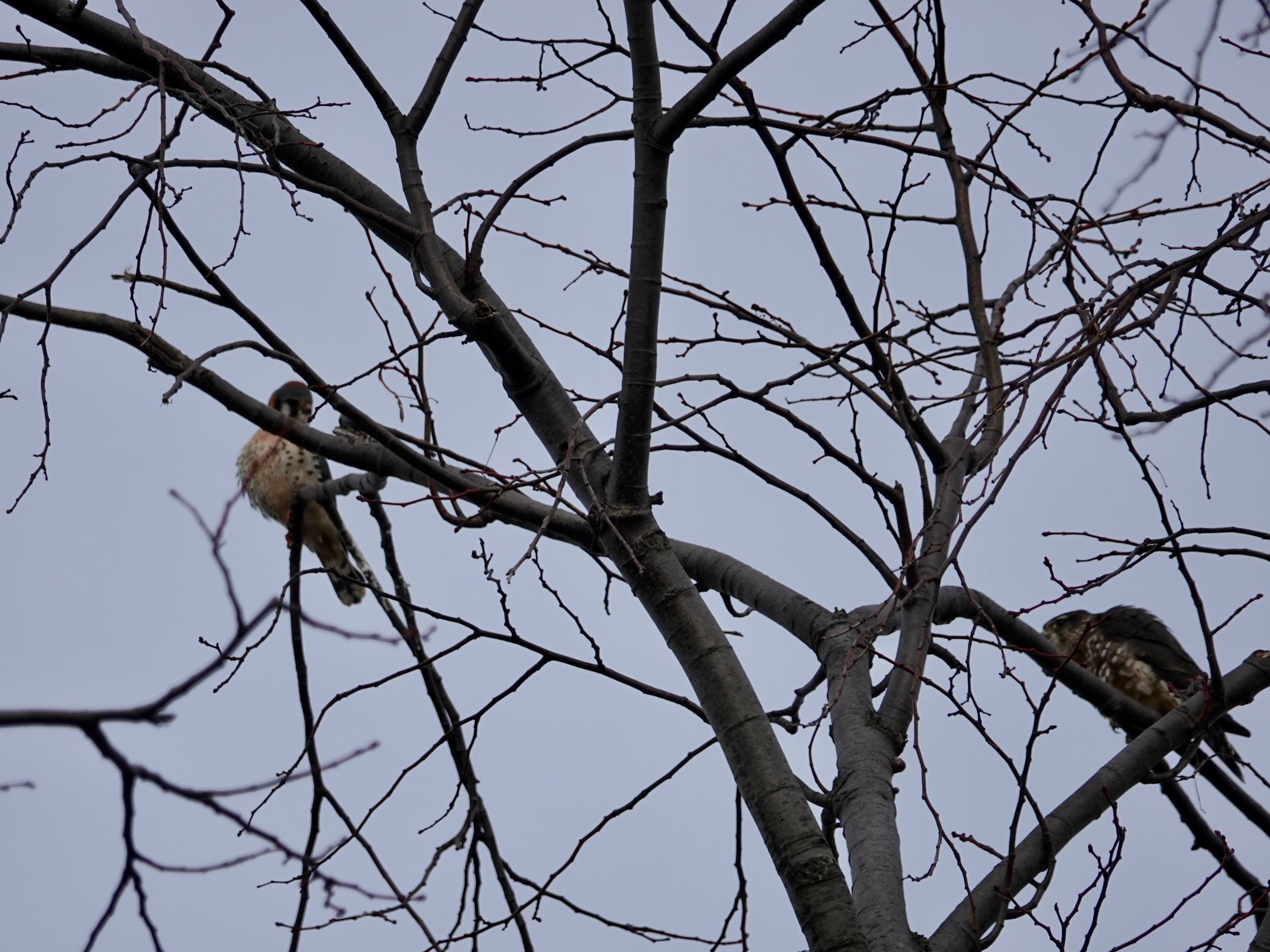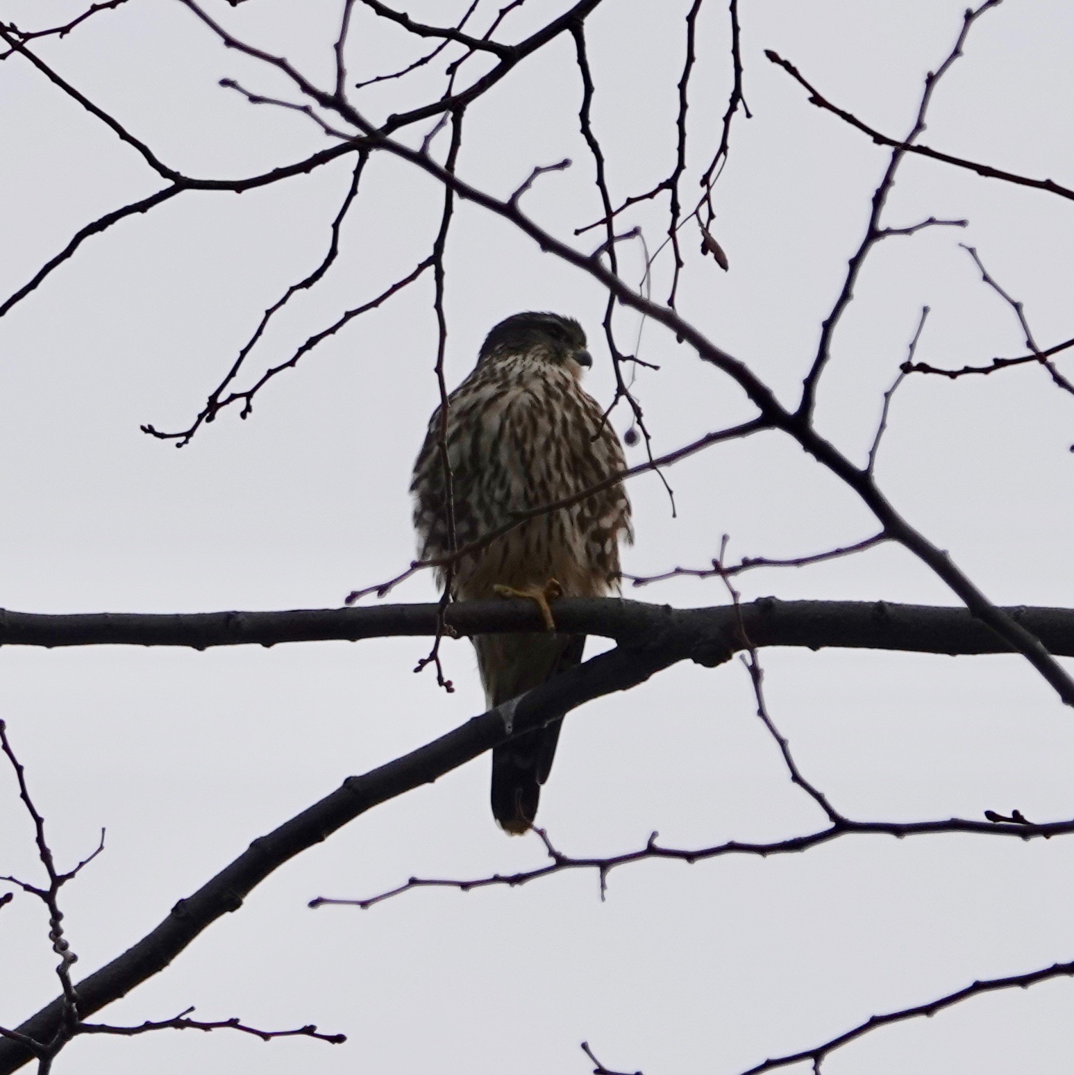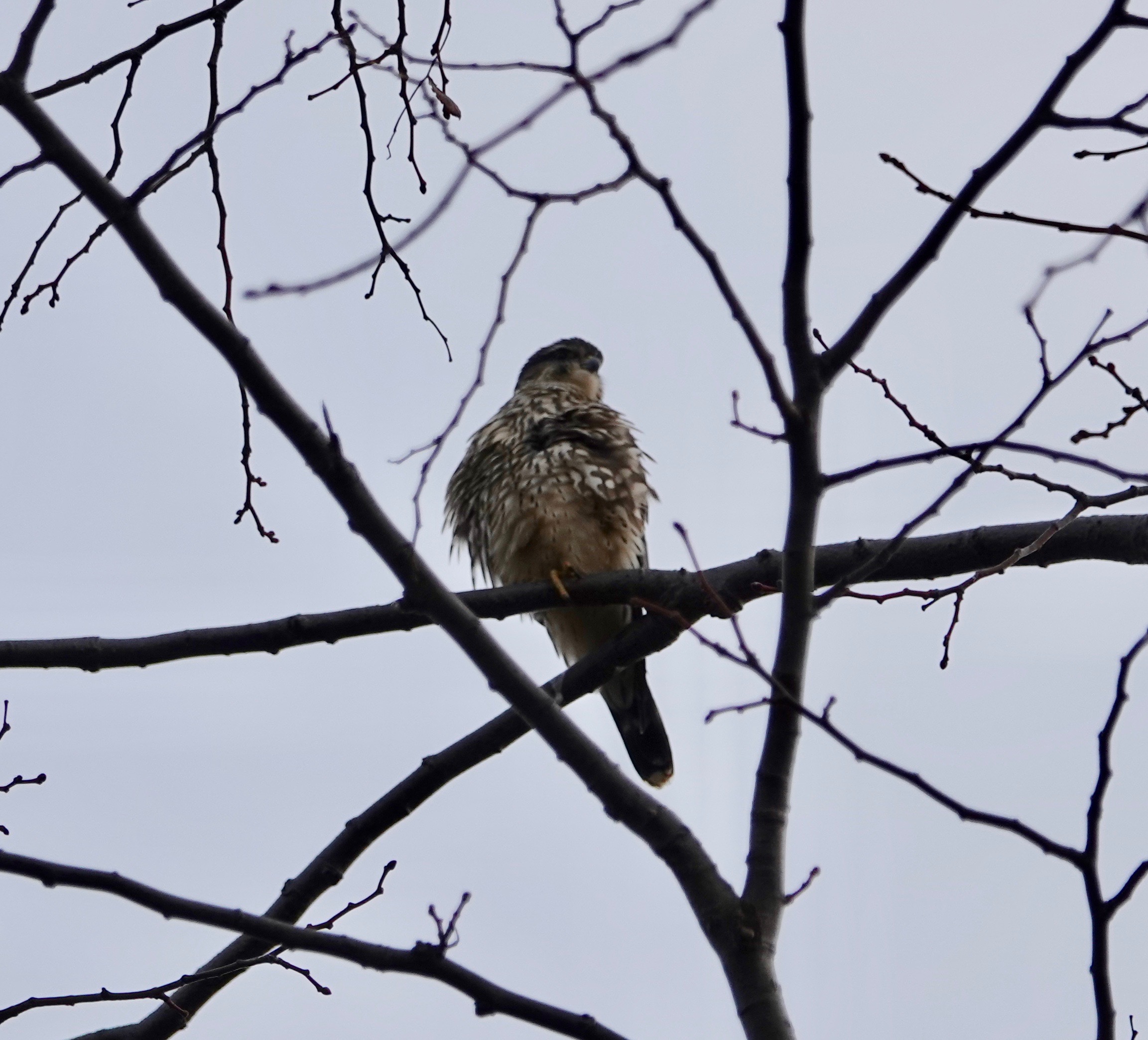 I don’t often see Merlins, but when I do, they’re often up here, in this same tree, at least for this and last winter.On this particularly dark and gloomy day, an American Kestrel male flew into the tree.There was some staring, and some flying at each other. (Damn tree was in the way for observers.)The Kestrel eventually flew and I left the Merlin as I’d found the bird, perched up there, surveying the scene.