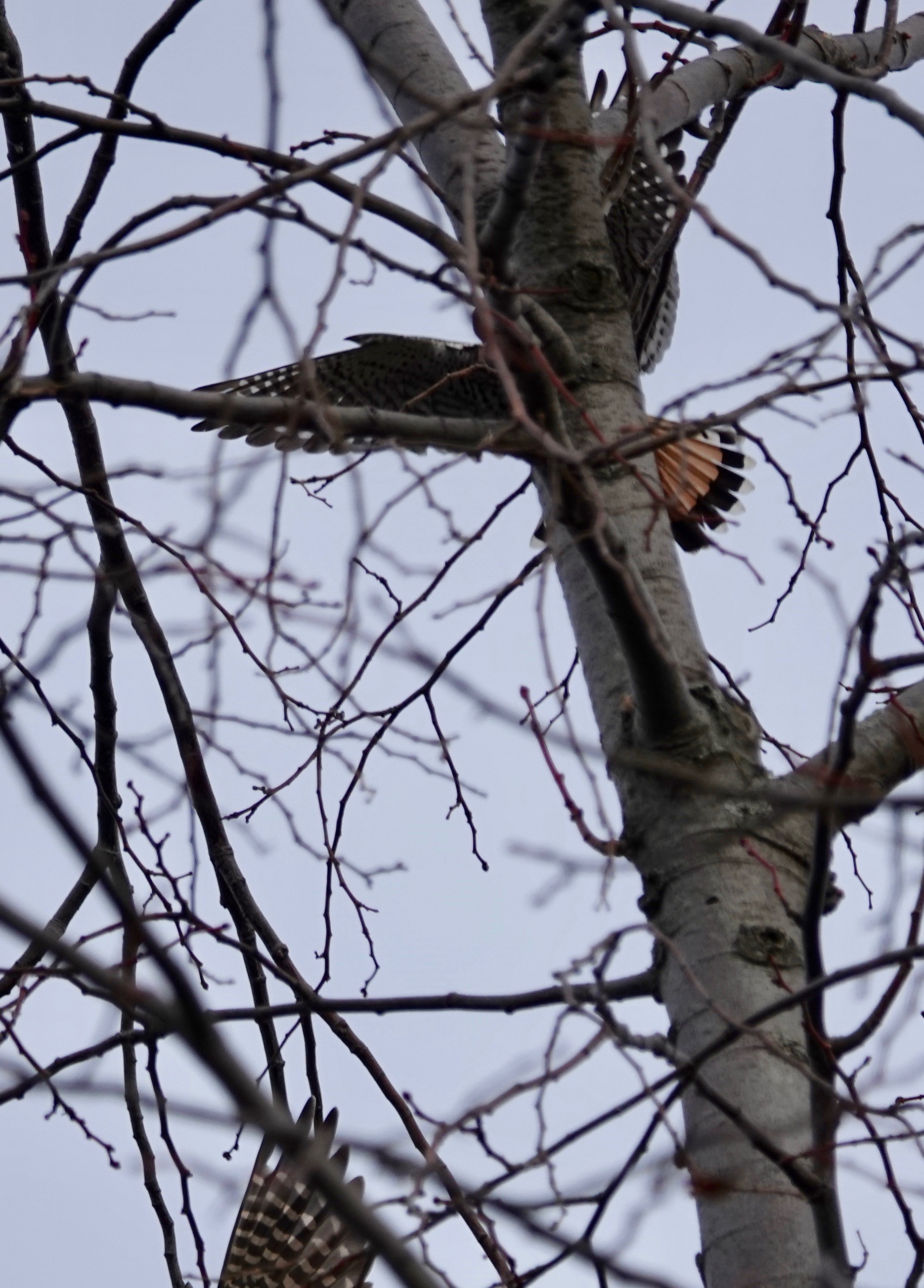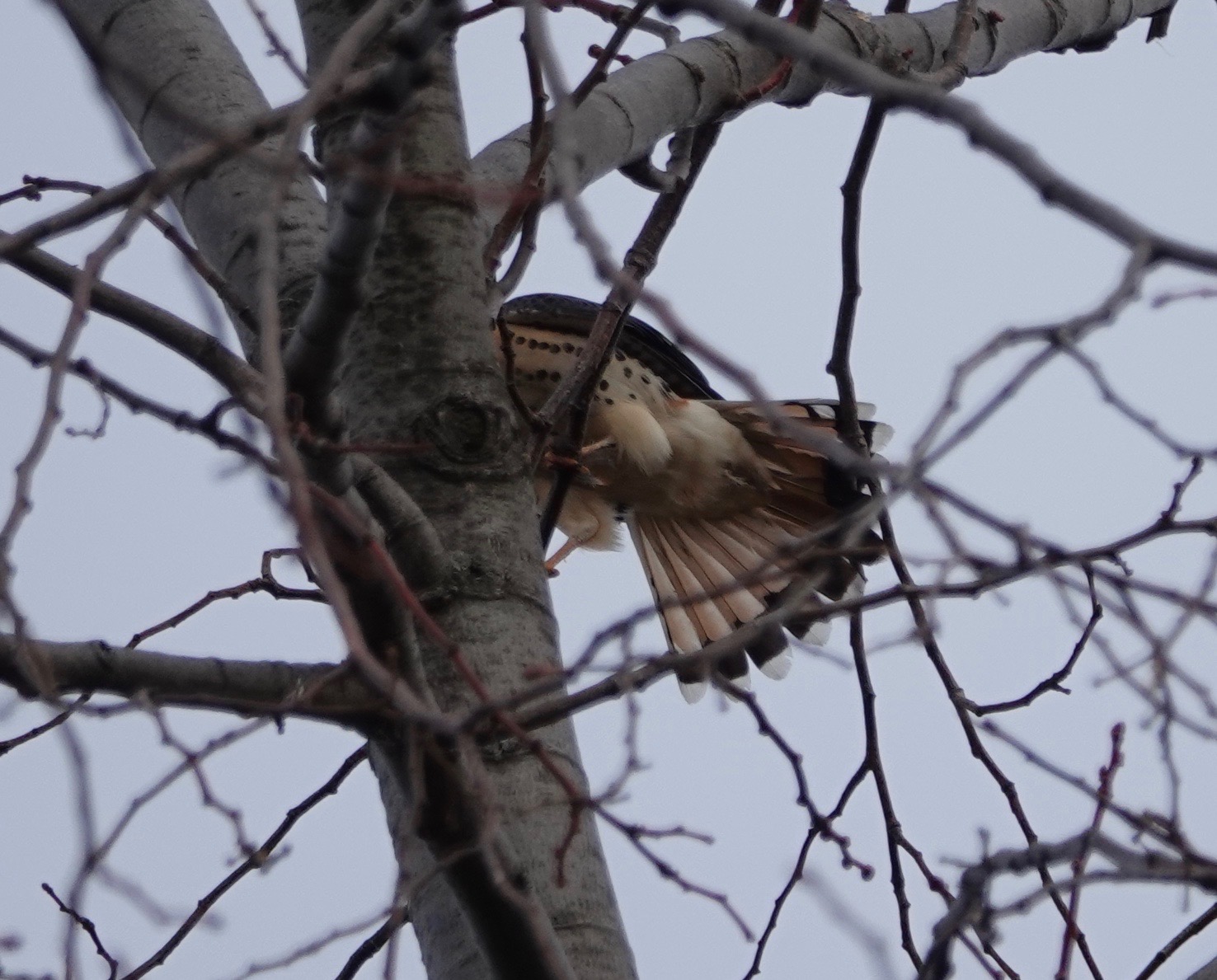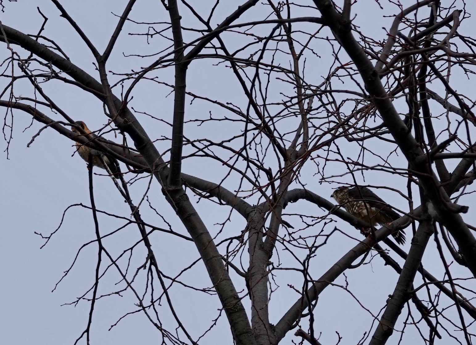 I don’t often see Merlins, but when I do, they’re often up here, in this same tree, at least for this and last winter.On this particularly dark and gloomy day, an American Kestrel male flew into the tree.There was some staring, and some flying at each other. (Damn tree was in the way for observers.)The Kestrel eventually flew and I left the Merlin as I’d found the bird, perched up there, surveying the scene.