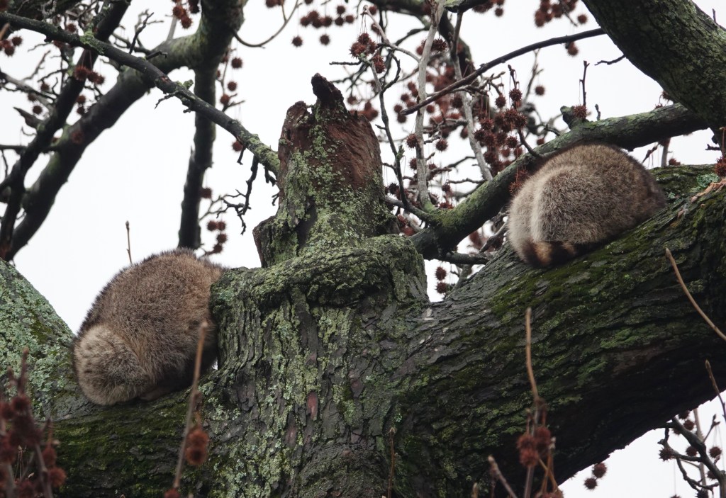Sunday night it finally got cold, dropping twenty degrees from the mid-fifties temperatures we had during the first two days of the year. Before the onset of thermometer winter, these two raccoons were sleeping al fresco in a Sweetgum.