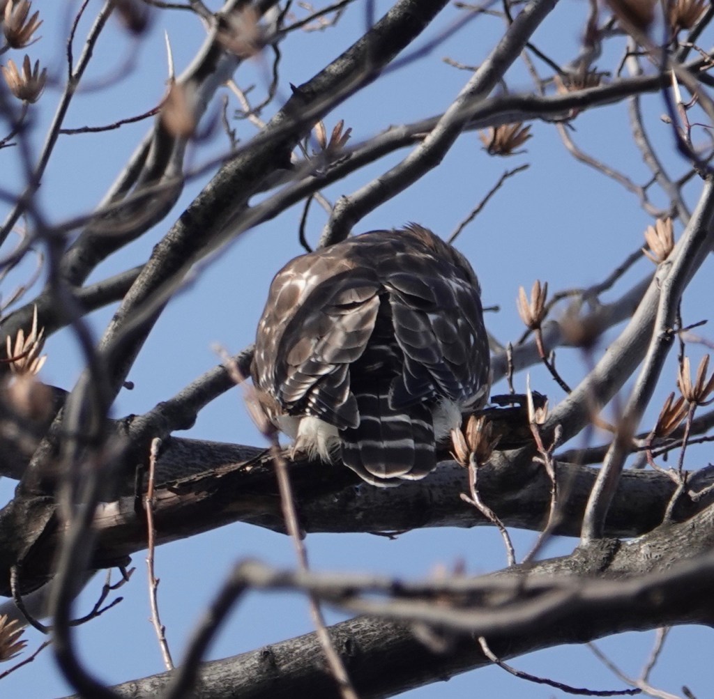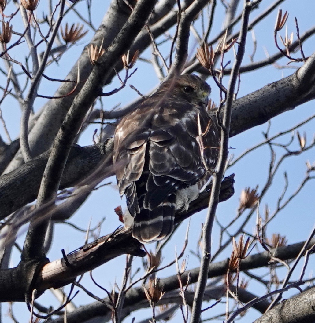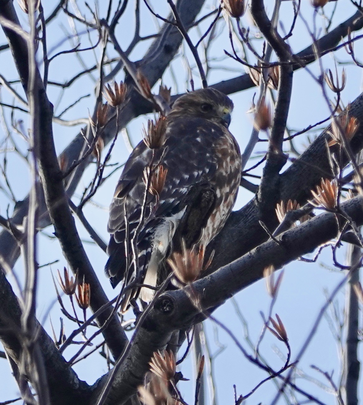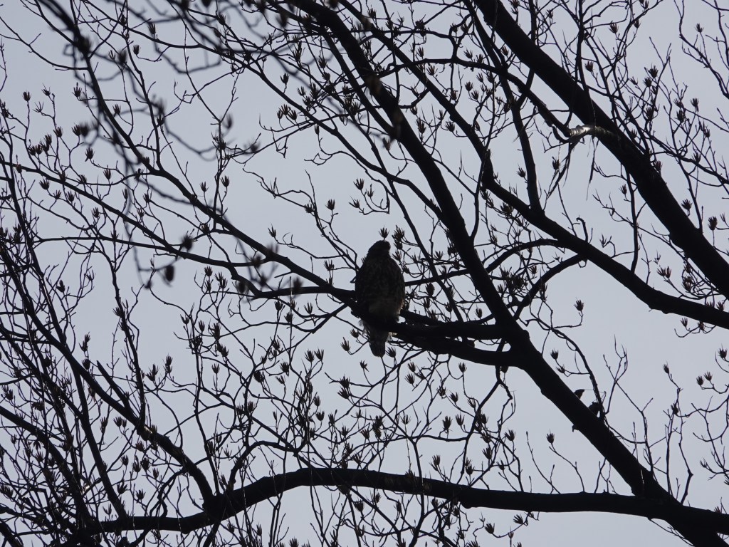 Coopers!An hour after seeing the Coopers I was thinking to myself that I hadn’t seen a single Red-tailed Hawk. Then I saw this silhouette. Buteo all-over, but, frankly, even high up in a Tuliptree it looked a little small.Well, well, well! A Red-shouldered Hawk. And not only that, but an adult one. (The immatures are rather similar to young Red-tails.) First I’ve seen this winter, which so far has been spent entirely within the narrow confines of Brooklyn. Checks notes: didn’t even see one during fall raptor migration.