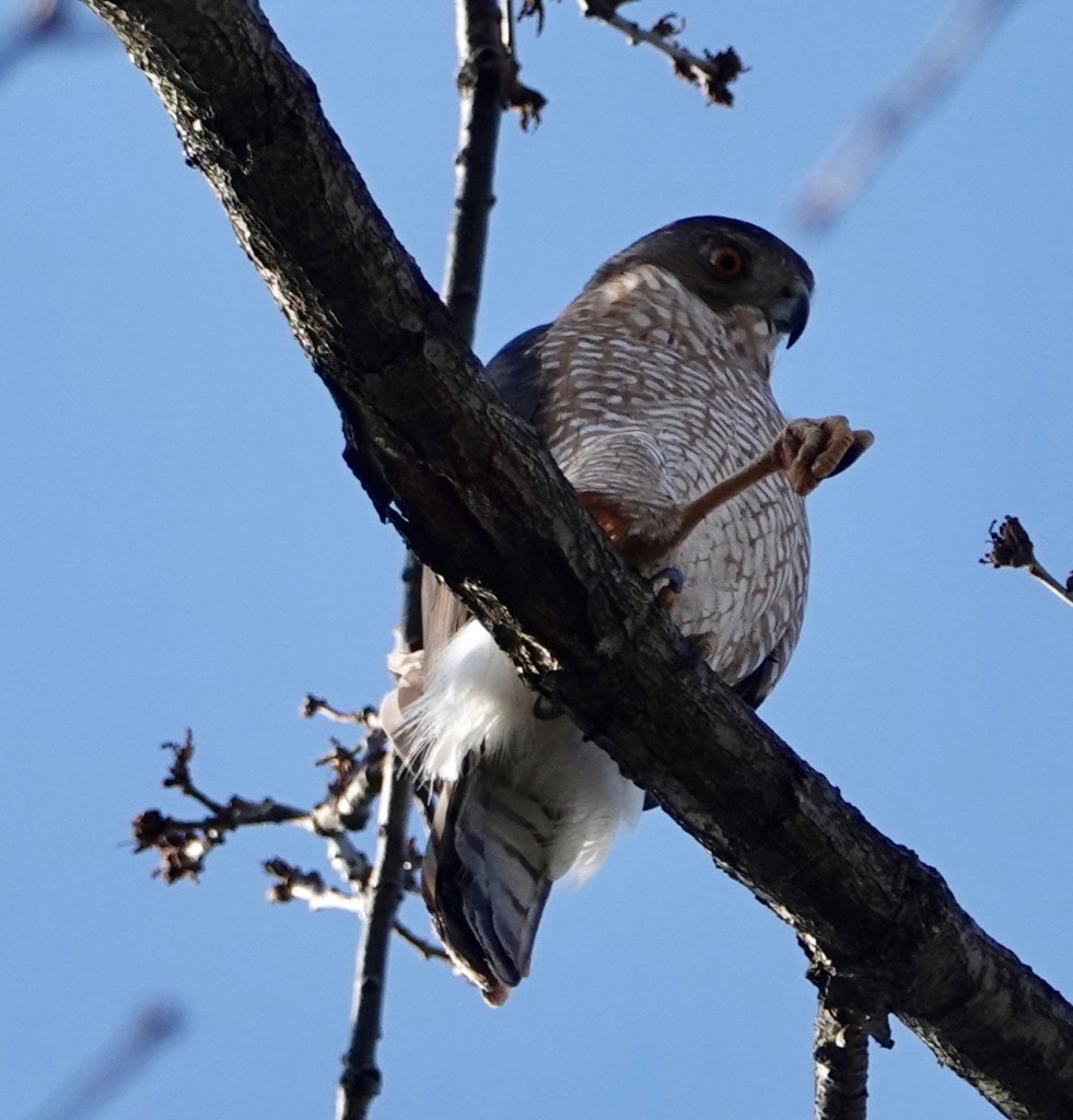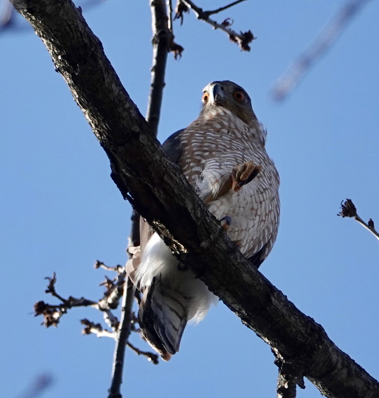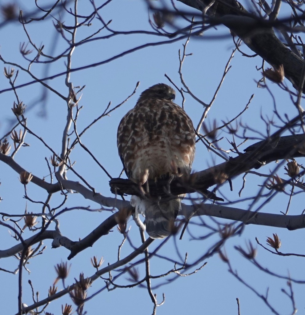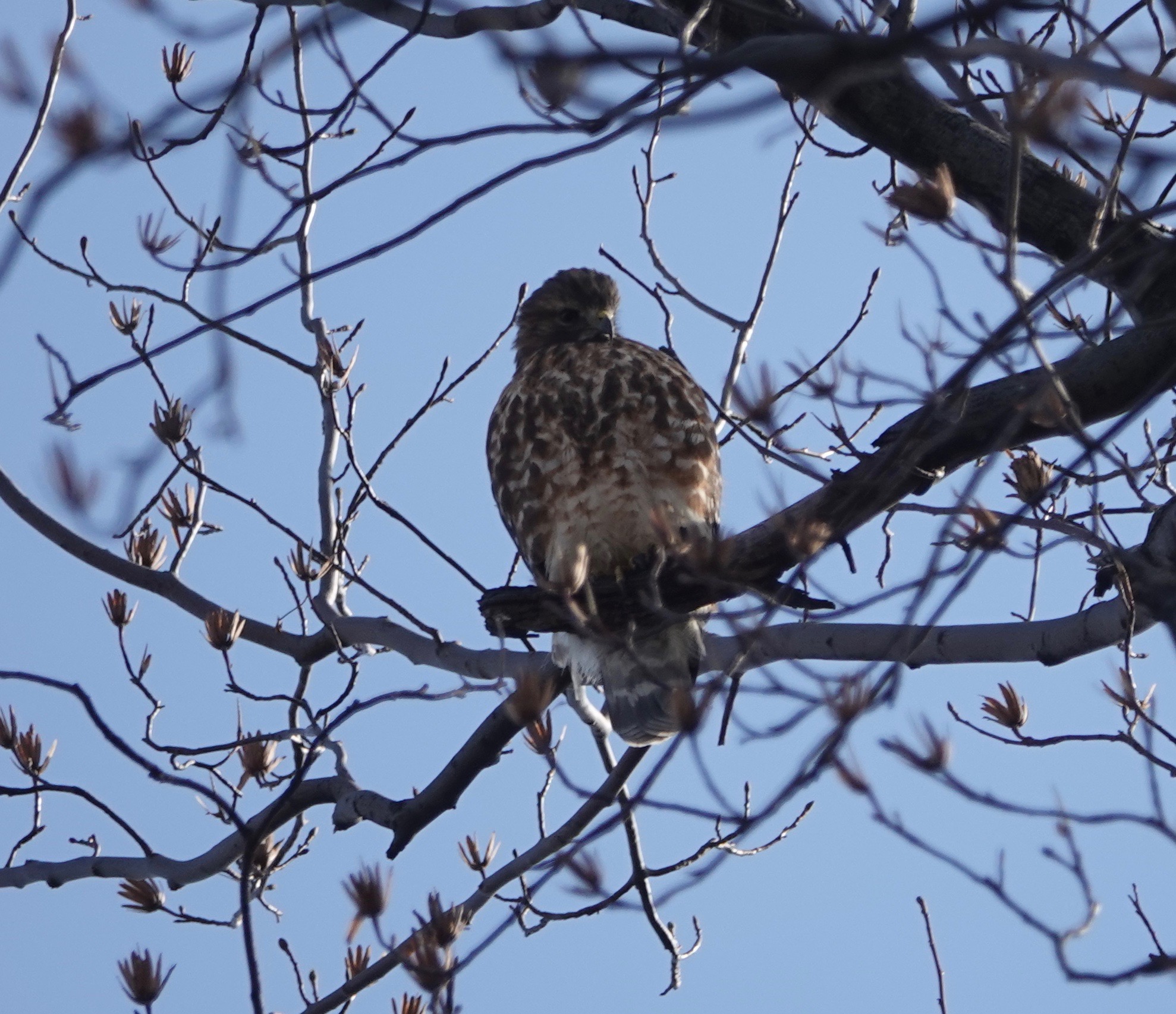 Coopers!An hour after seeing the Coopers I was thinking to myself that I hadn’t seen a single Red-tailed Hawk. Then I saw this silhouette. Buteo all-over, but, frankly, even high up in a Tuliptree it looked a little small.Well, well, well! A Red-shouldered Hawk. And not only that, but an adult one. (The immatures are rather similar to young Red-tails.) First I’ve seen this winter, which so far has been spent entirely within the narrow confines of Brooklyn. Checks notes: didn’t even see one during fall raptor migration.