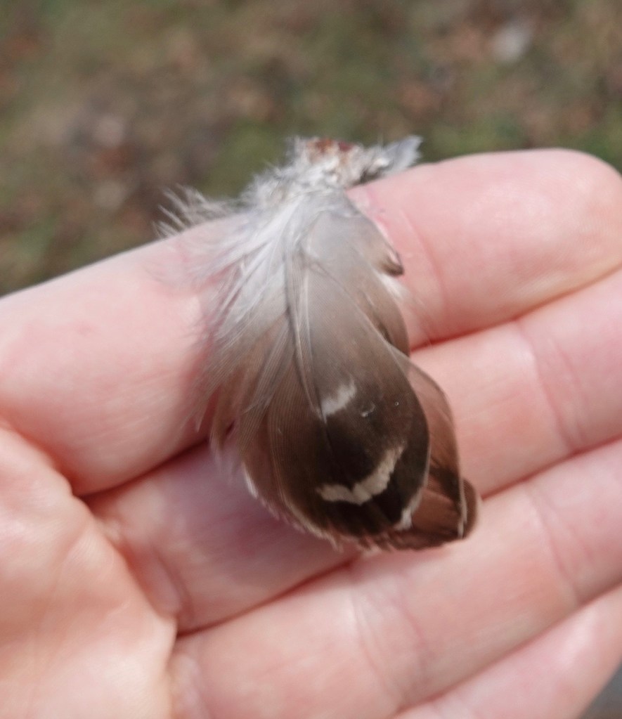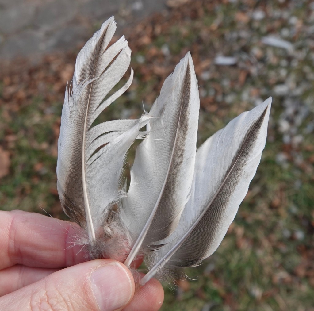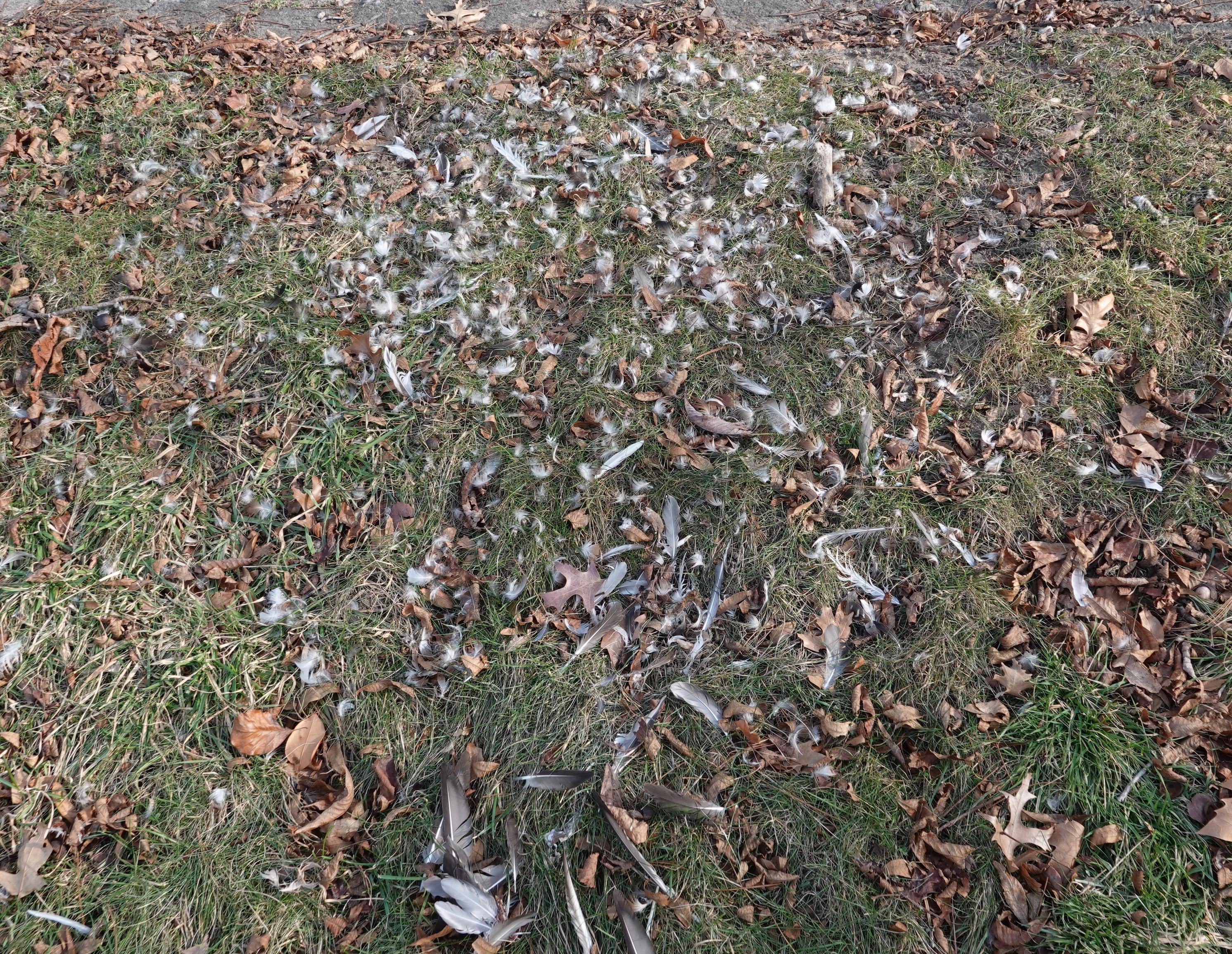 We see a lot of Coopers and Red Tail hawks picking-up-dinner from our yard. We call it a “feather bomb”. Most of the time the hawk takes his prey to-go, but I’ve seen them sit at the “bomb site” and devour it there, picking-off as many feathers as she can in the process. Not a pretty sight!
