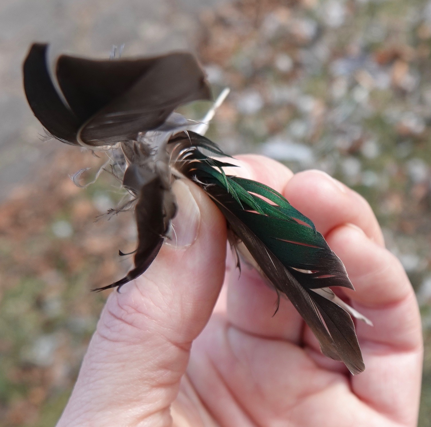 Unless it spontaneously exploded we have to assume it was intercepted en route. It would take a peregrine or larger raptor to down the duck, but we can’t tell from the debris field which species had lunch. However, successful capture locations tend to be reused, so a repeat performance is possible. Maybe somebody will get lucky.