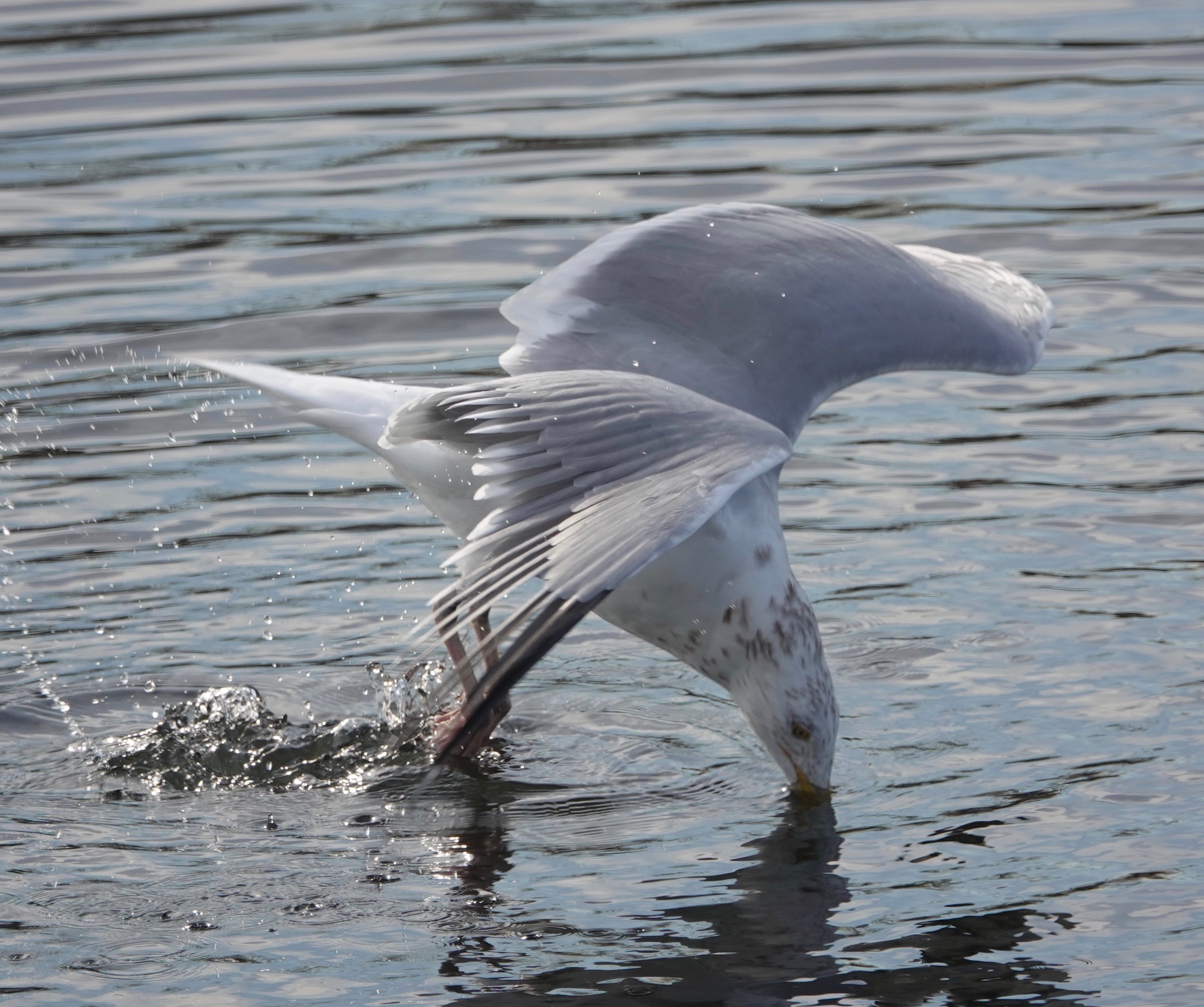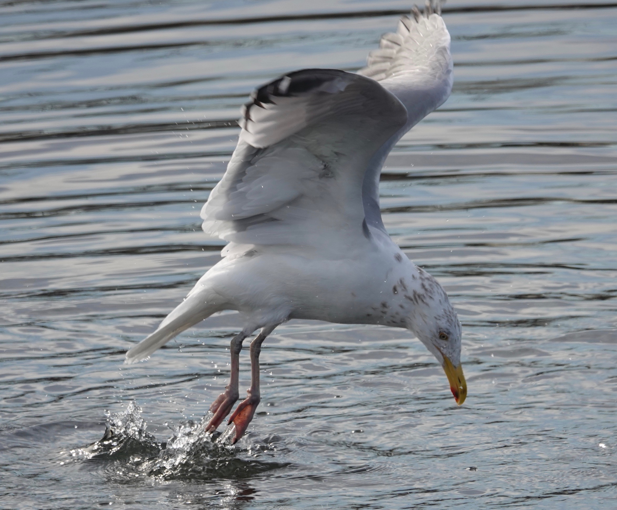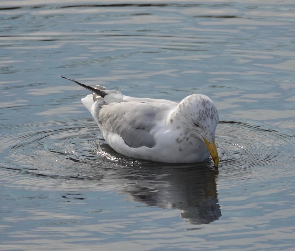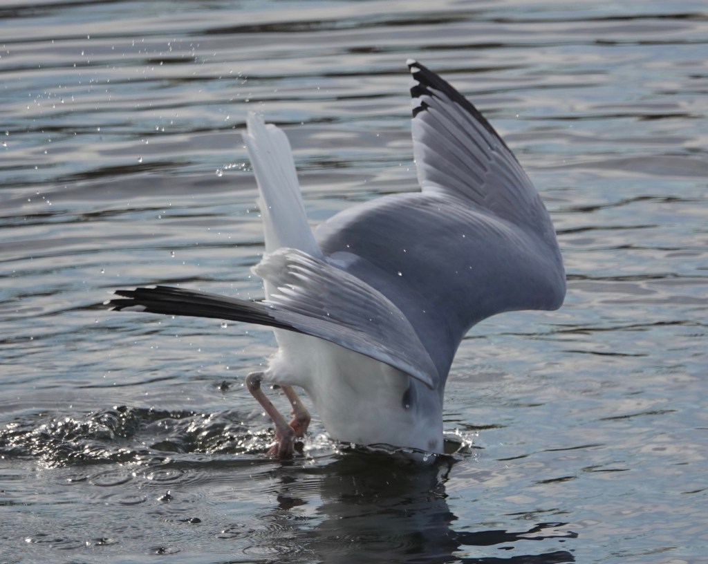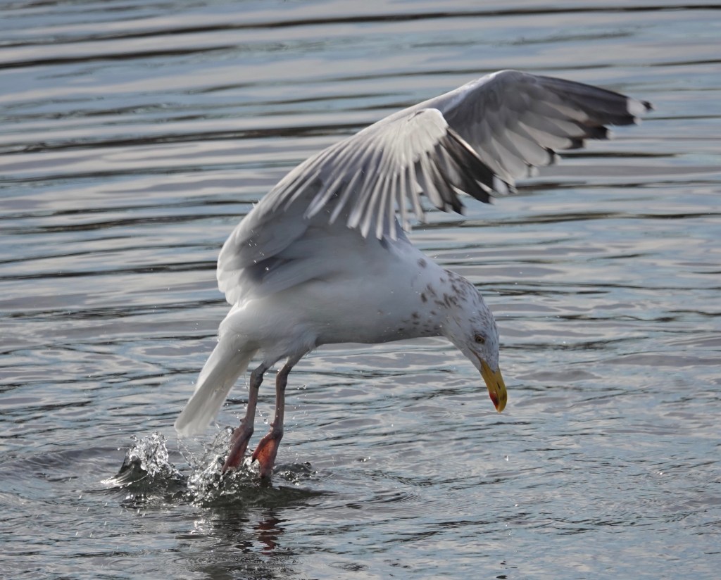 Worrying the water, and presumably the muddy rocks below, this Herring Gull was hunting for clams. From a floating position, the bird leaped up and dived, rather like a fox.Most of the dives came up empty-beaked.But three hardshell clams were grabbed while I watched from a couple of different angles. Come back tomorrow for more…