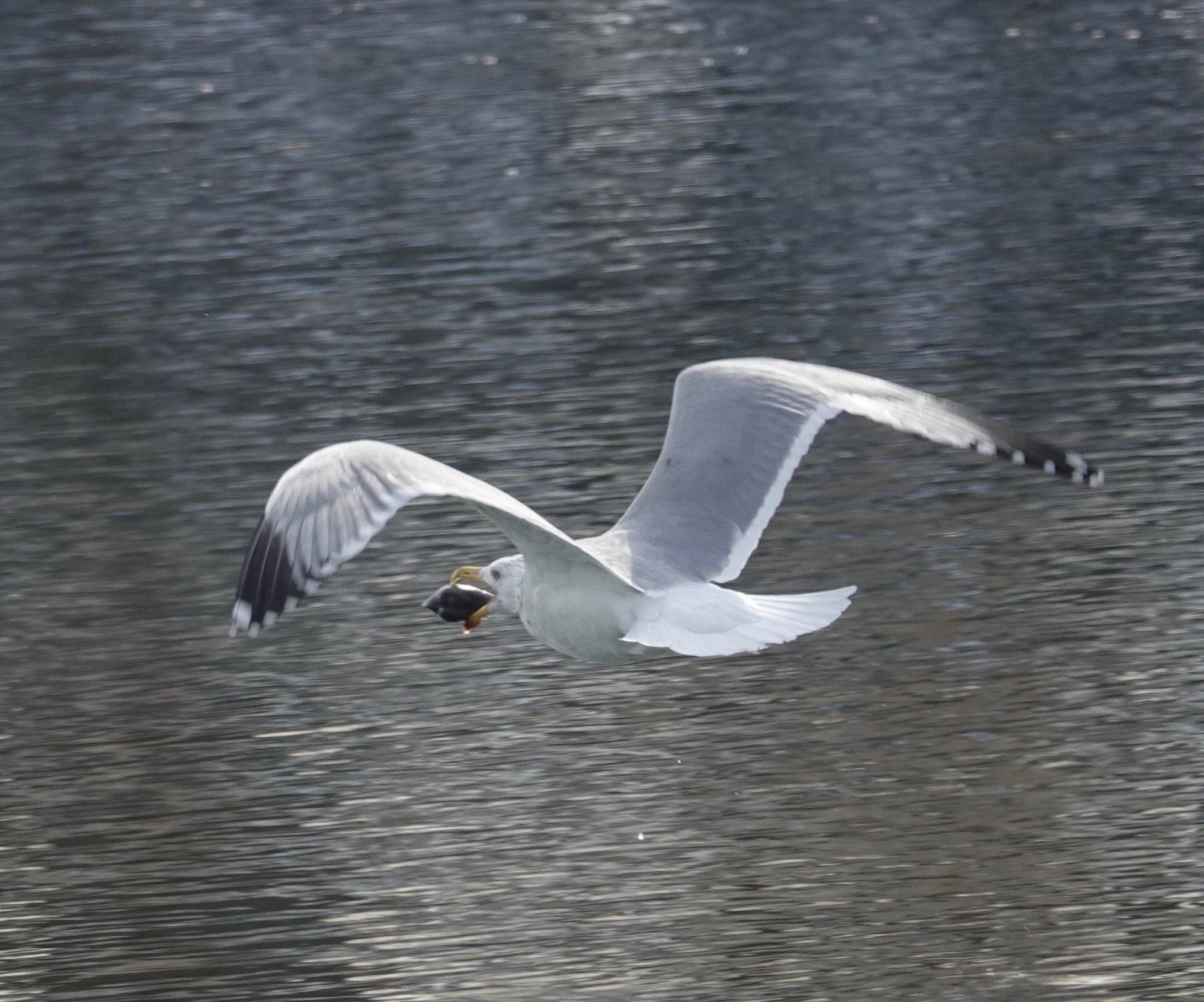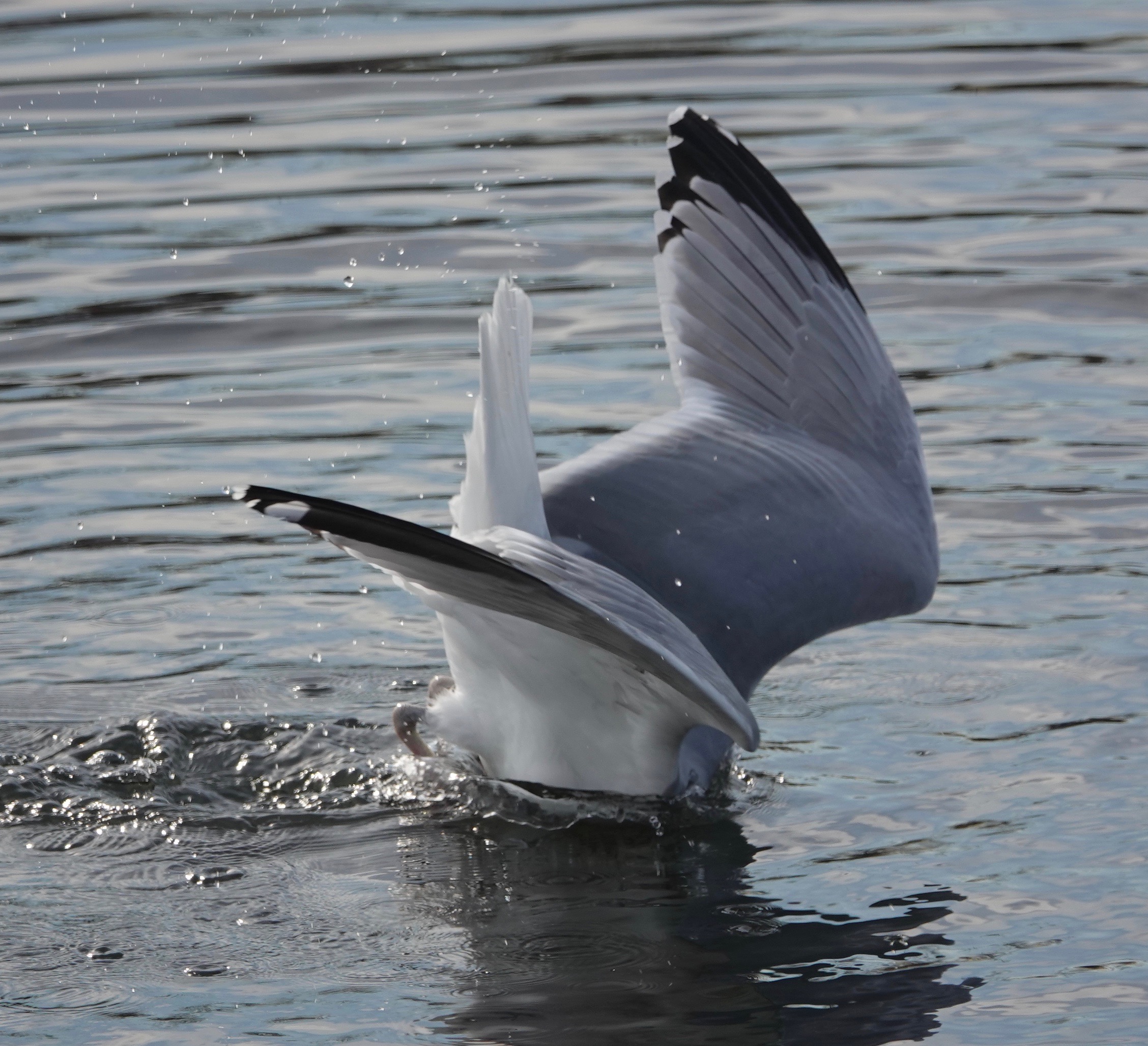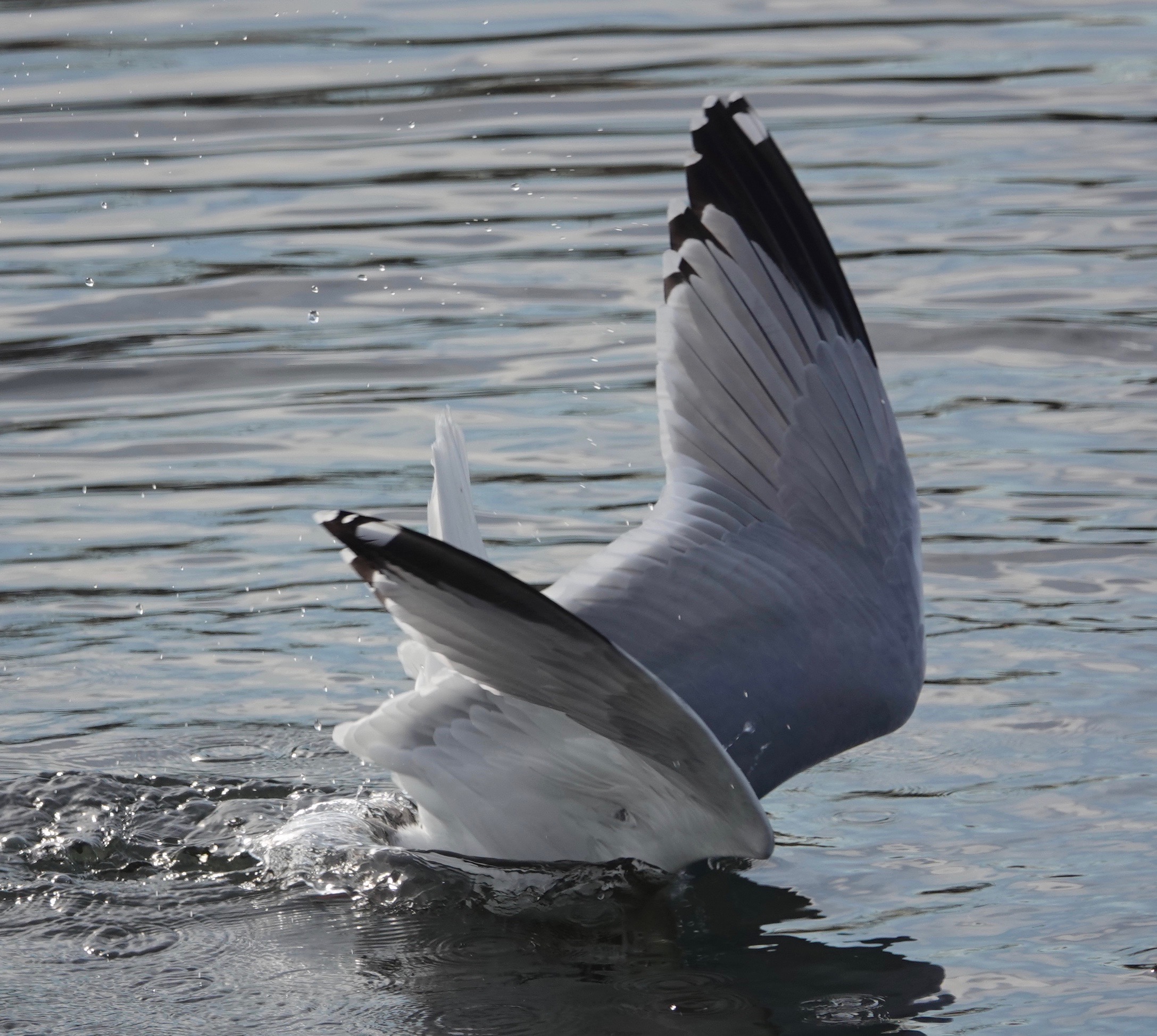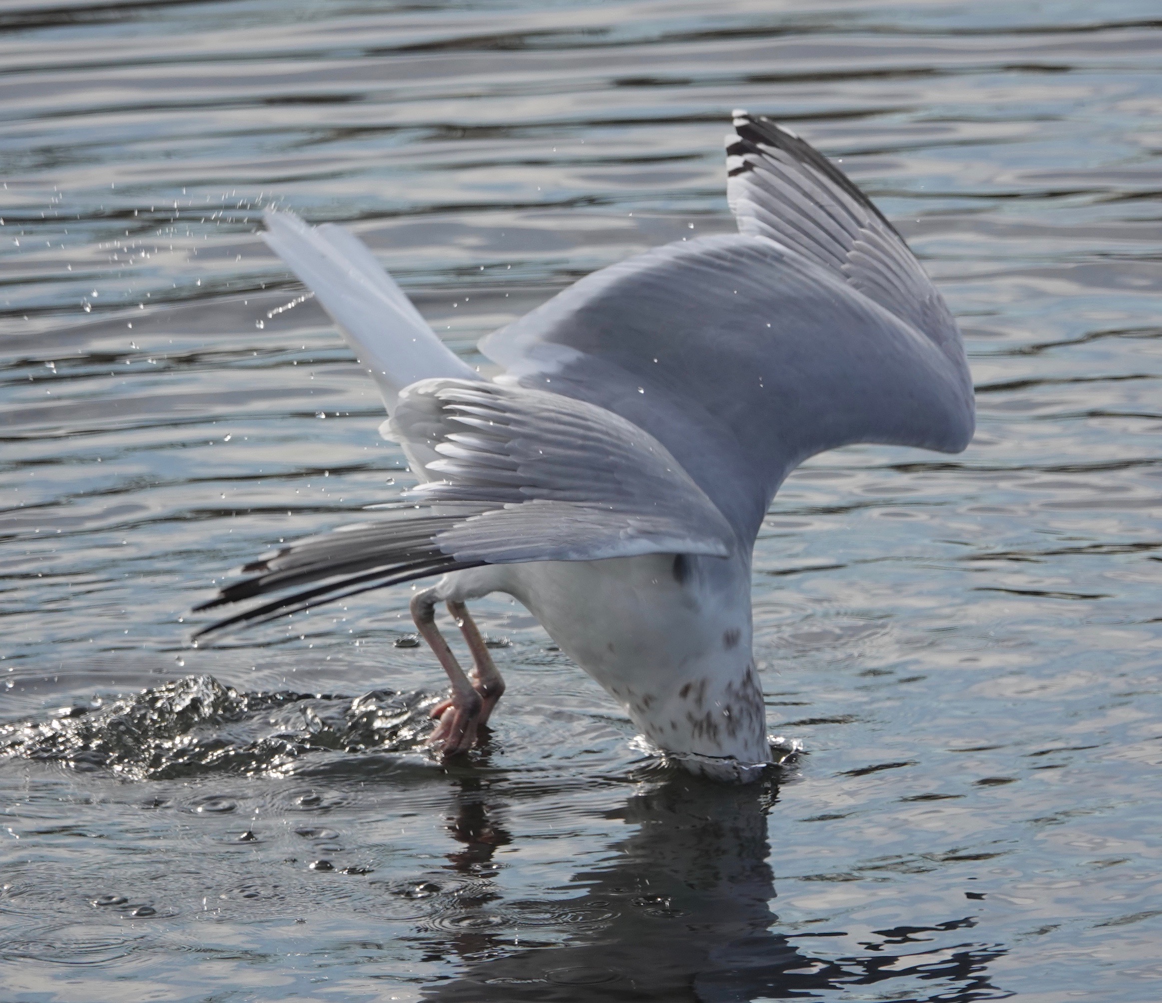 Worrying the water, and presumably the muddy rocks below, this Herring Gull was hunting for clams. From a floating position, the bird leaped up and dived, rather like a fox.Most of the dives came up empty-beaked.But three hardshell clams were grabbed while I watched from a couple of different angles. Come back tomorrow for more…