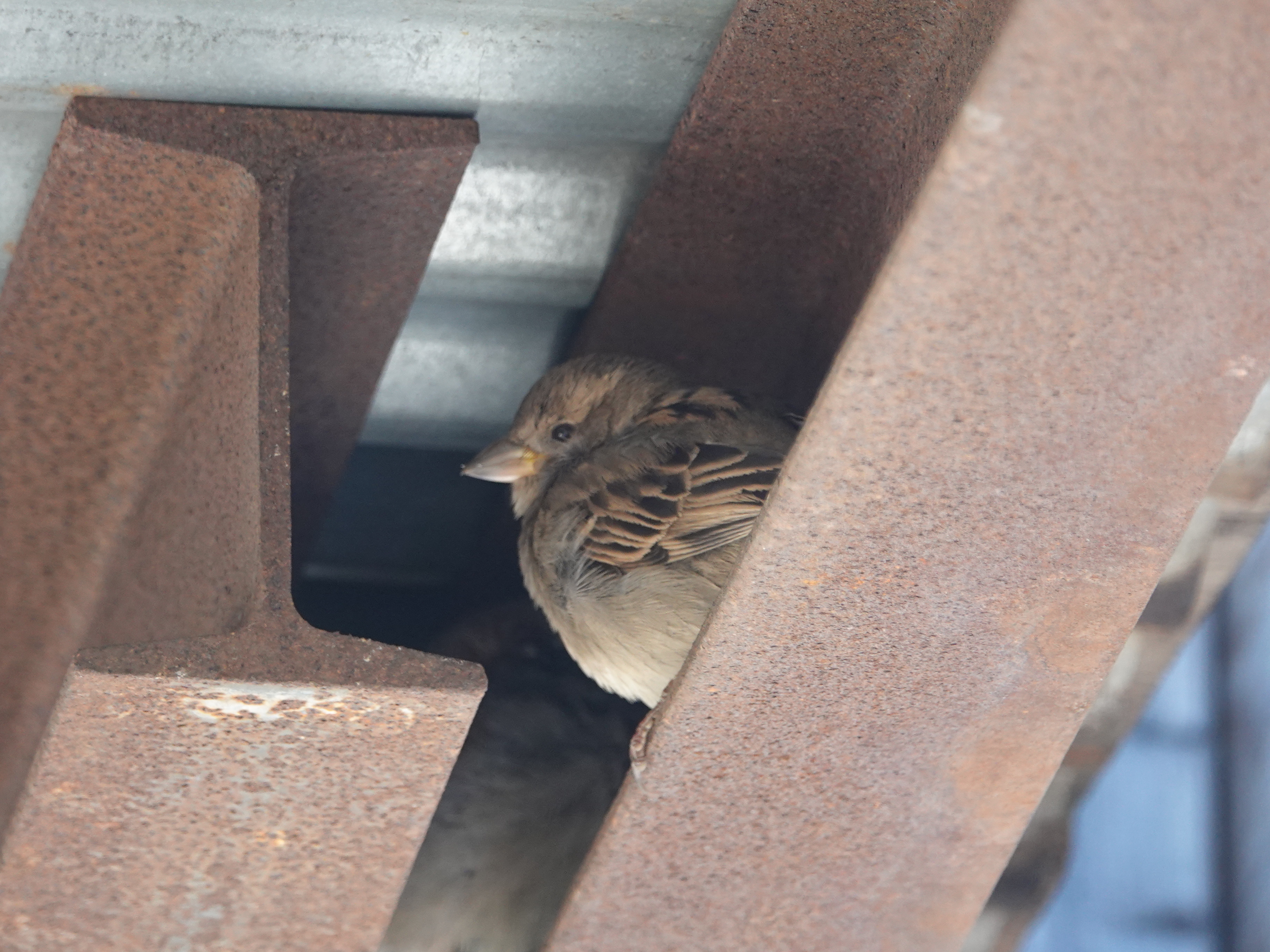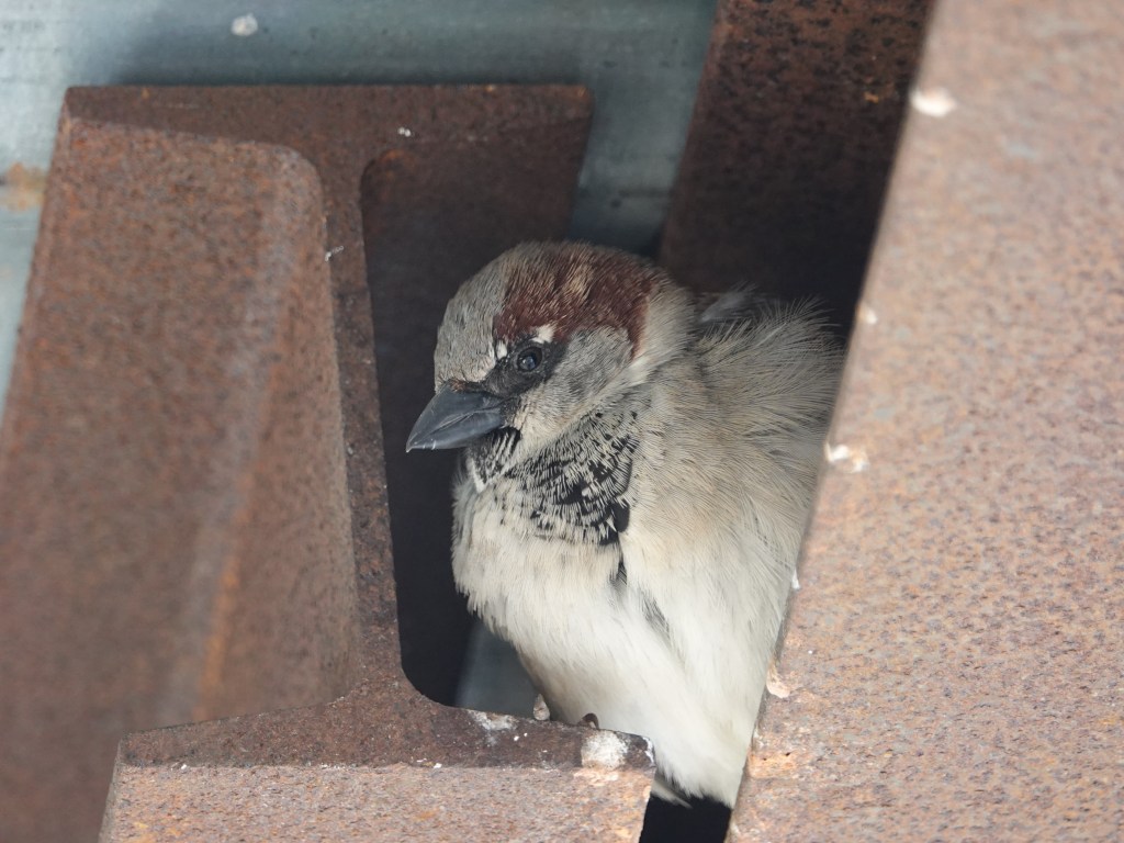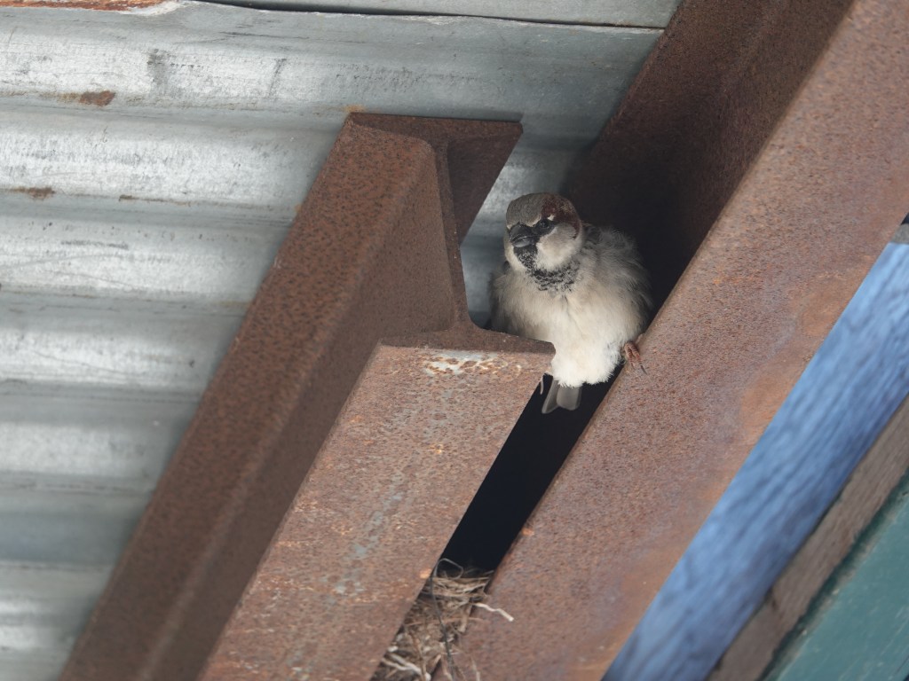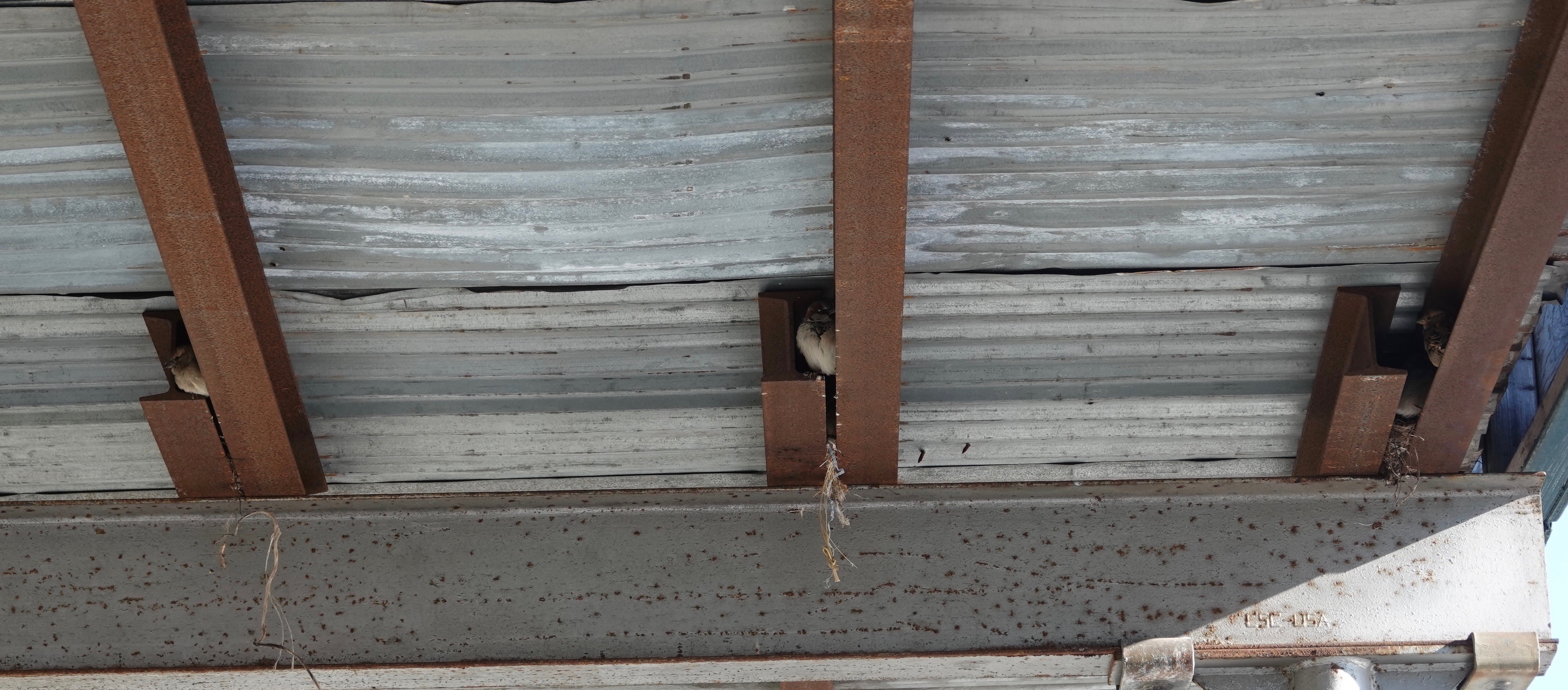 When our apartment building was surrounded by a “sidewalk shed,” or protective awning, for the duration of some work on the facade, House Sparrows started nesting in the space between the small I-beam supporting the corrugated roofing. This is another construction site on 5th Avenue. The nests here, presumably carryovers from last year, were suddenly jumping on February 1st.