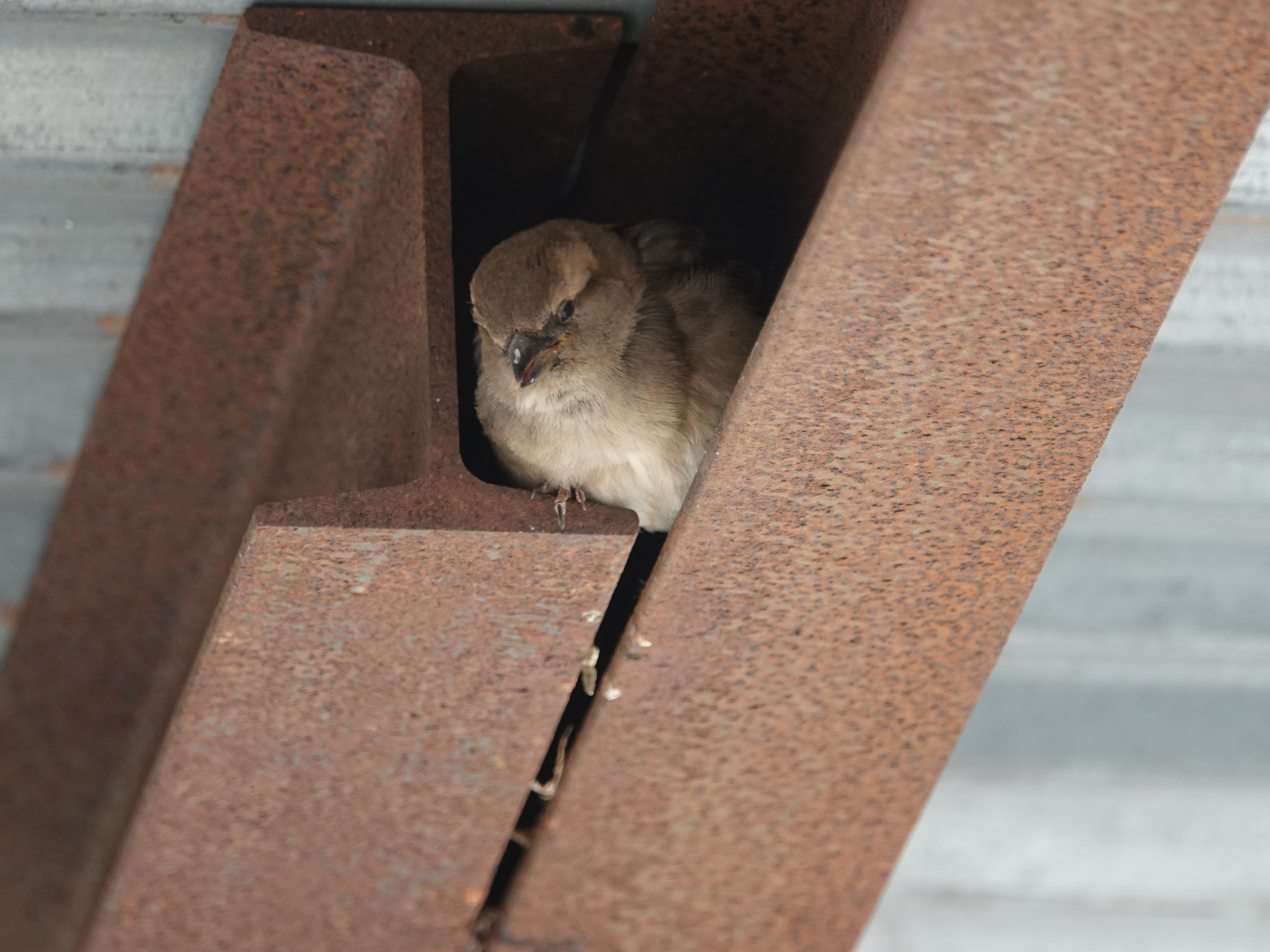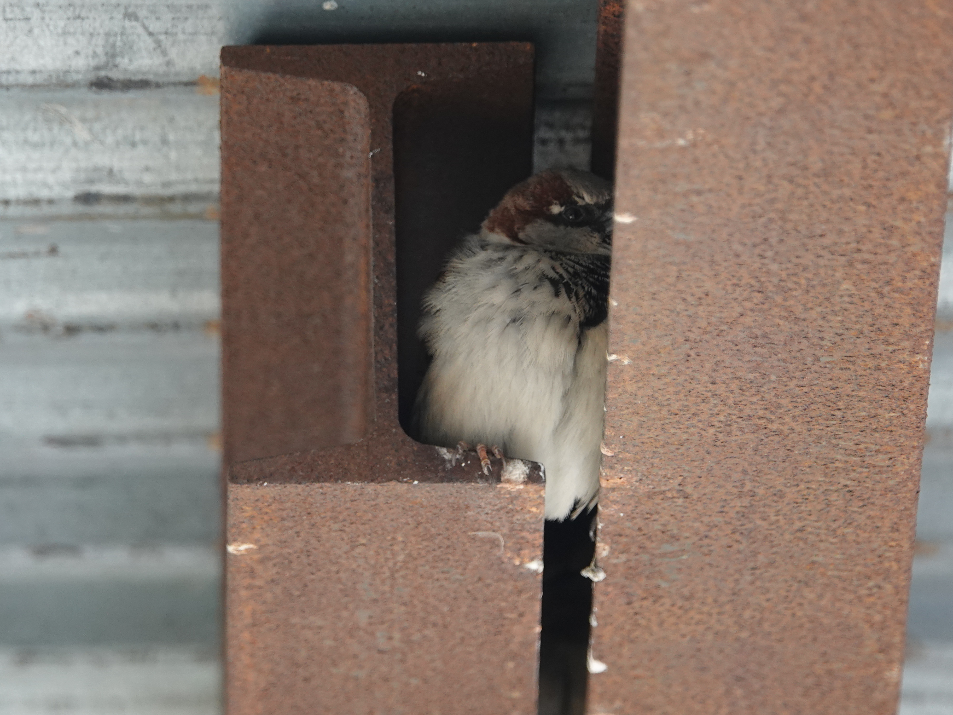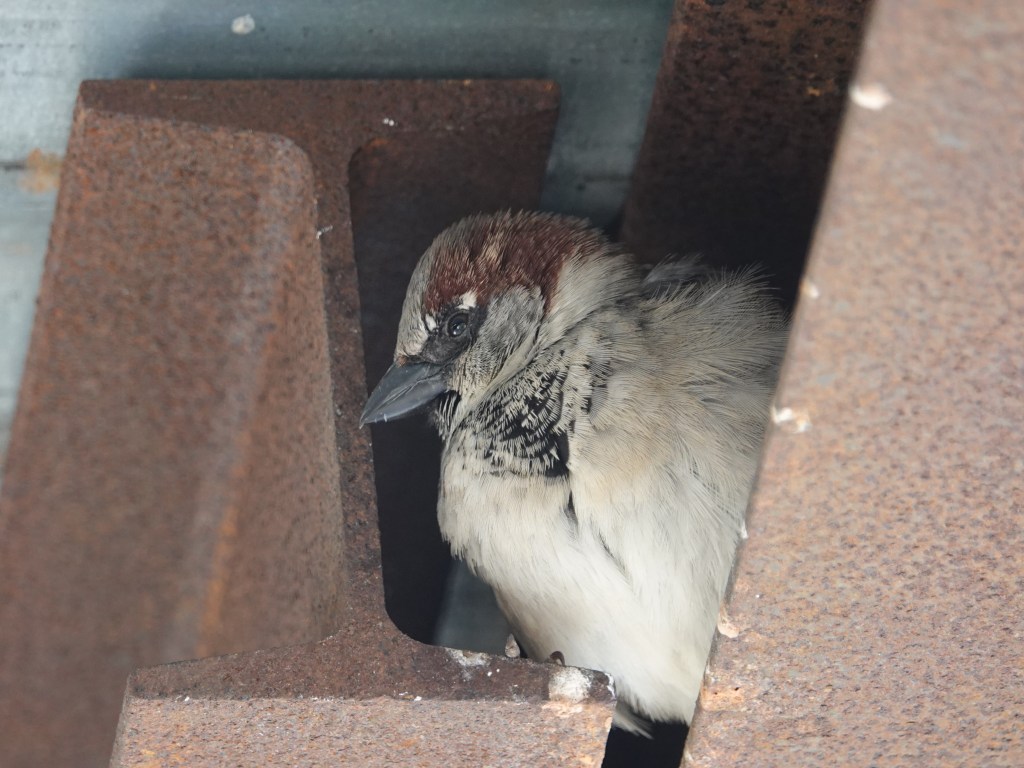 When our apartment building was surrounded by a “sidewalk shed,” or protective awning, for the duration of some work on the facade, House Sparrows started nesting in the space between the small I-beam supporting the corrugated roofing. This is another construction site on 5th Avenue. The nests here, presumably carryovers from last year, were suddenly jumping on February 1st.