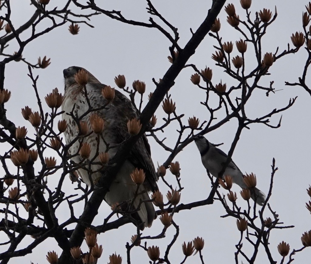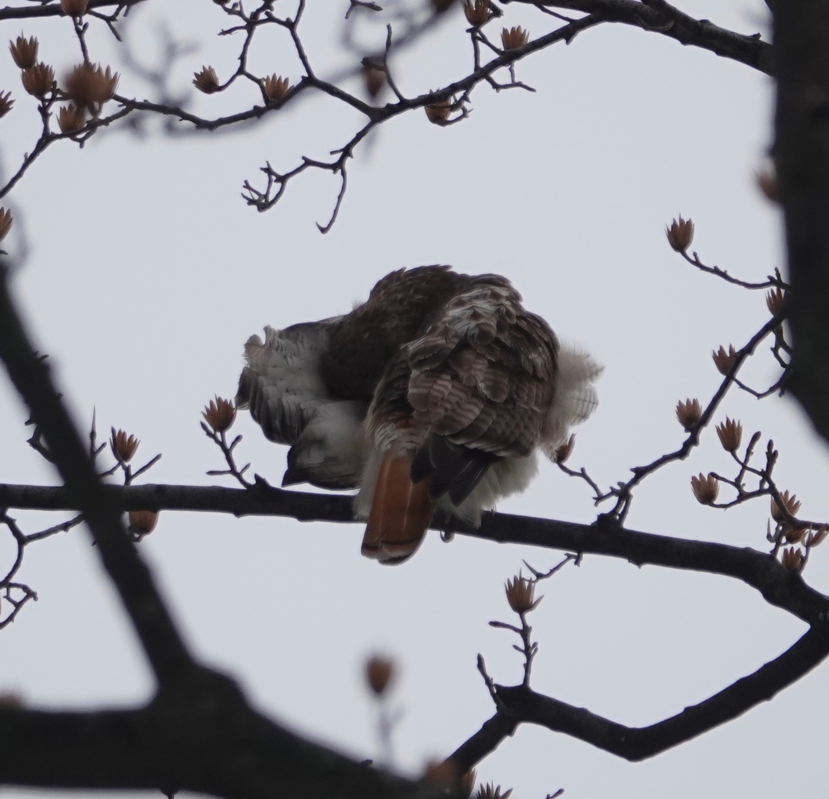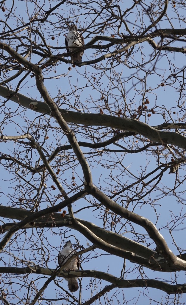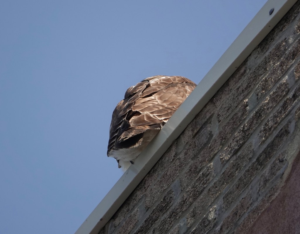 Two Red-tailed Hawks were near an unused nest built last year. One of the birds flew off, and then the local police came to harrying the one remaining.The botherers left and the hawk did some grooming.A couple of days earlier, a pair were in a tree across the street from my building.Then one of them was on my building.