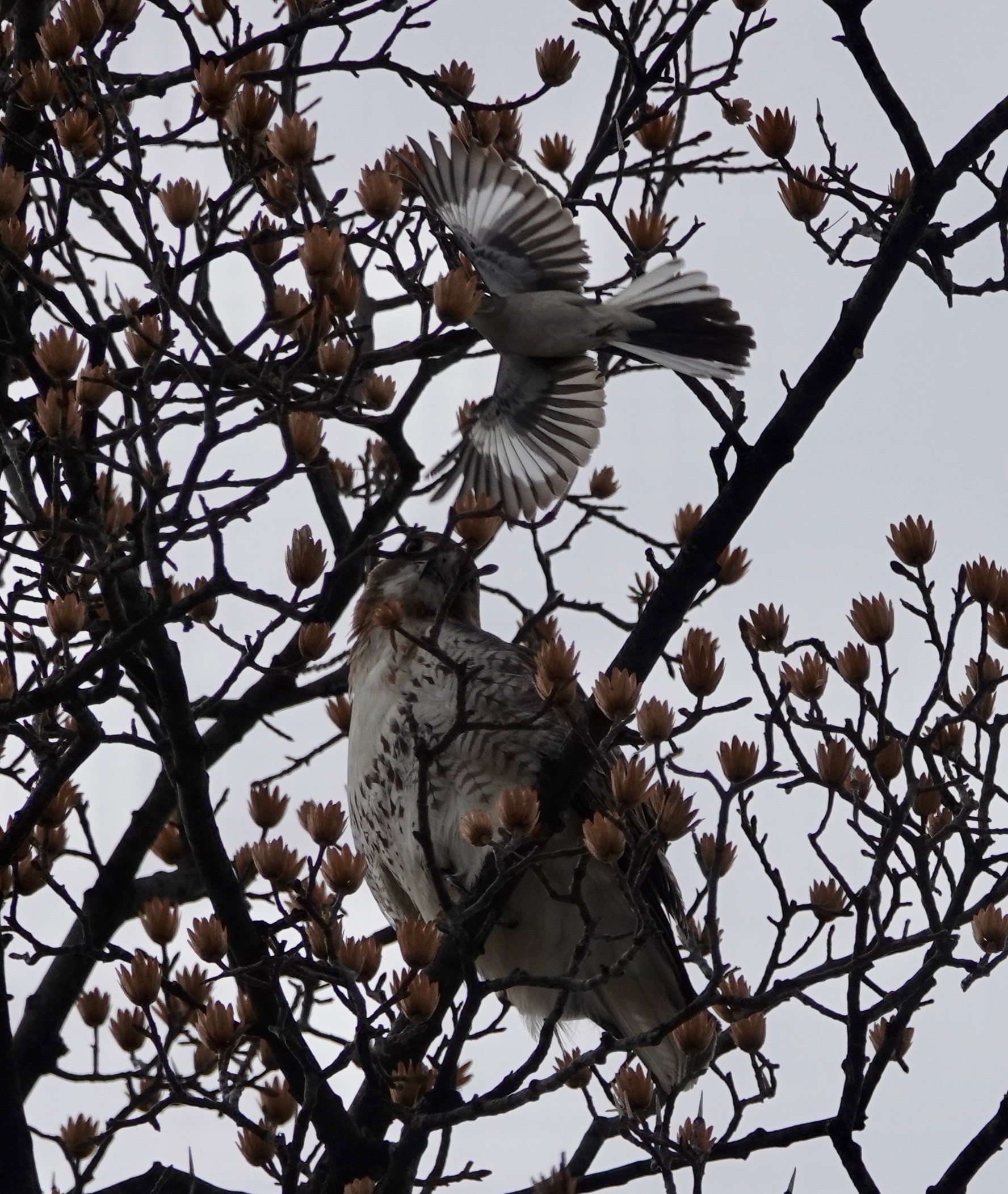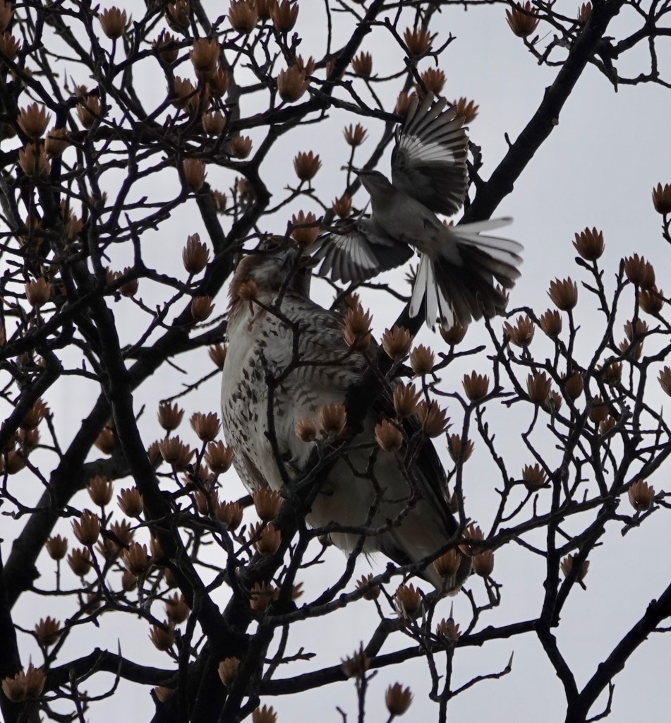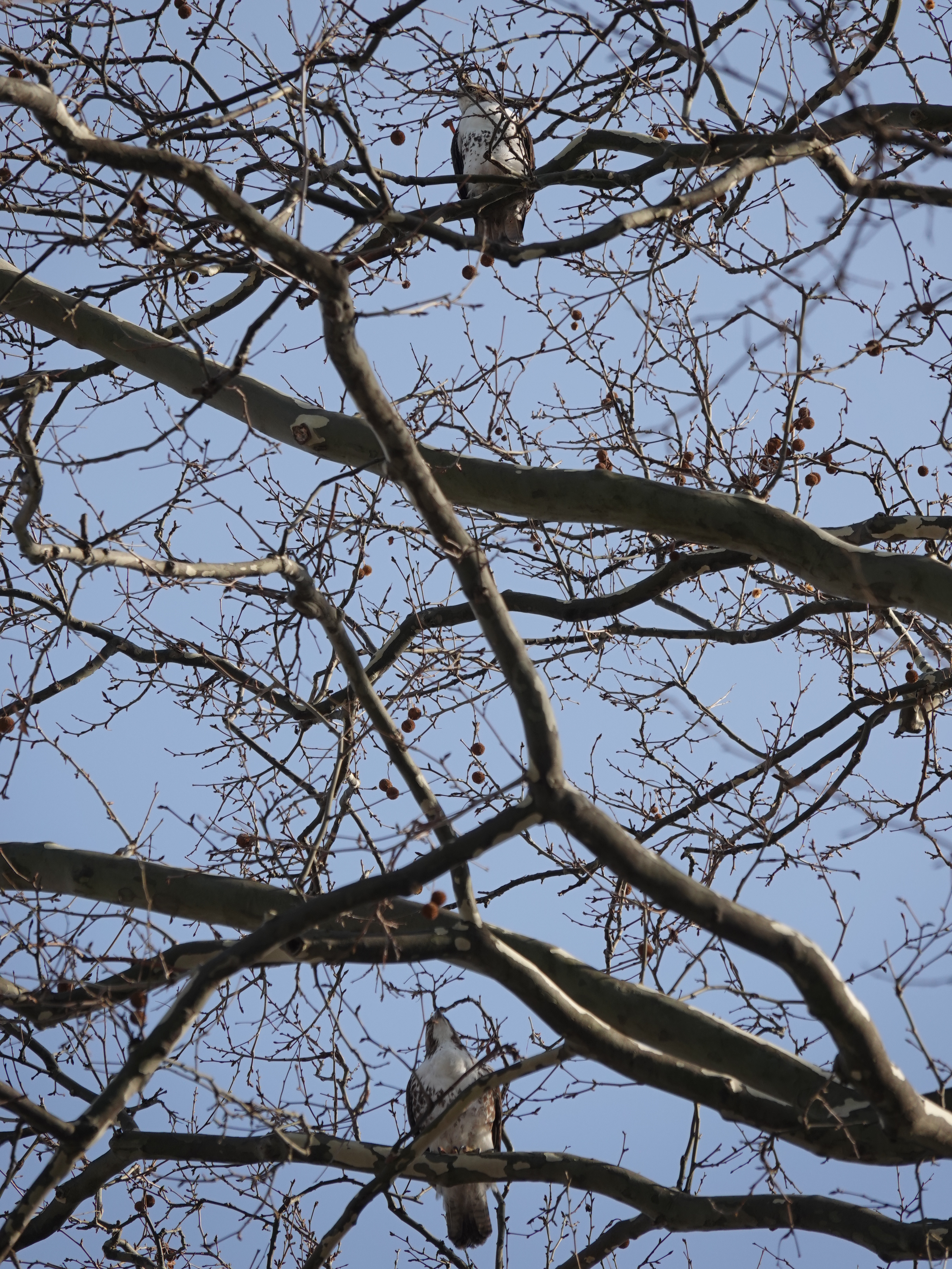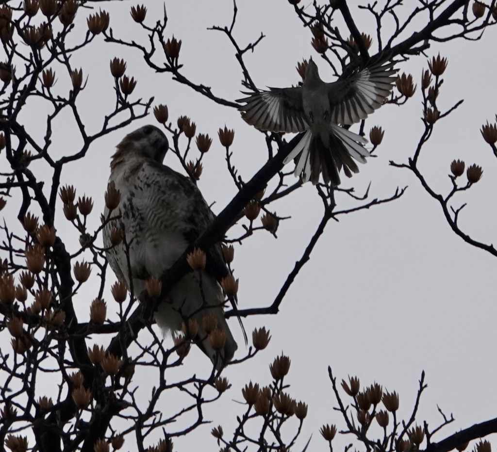 Two Red-tailed Hawks were near an unused nest built last year. One of the birds flew off, and then the local police came to harrying the one remaining.The botherers left and the hawk did some grooming.A couple of days earlier, a pair were in a tree across the street from my building.Then one of them was on my building.