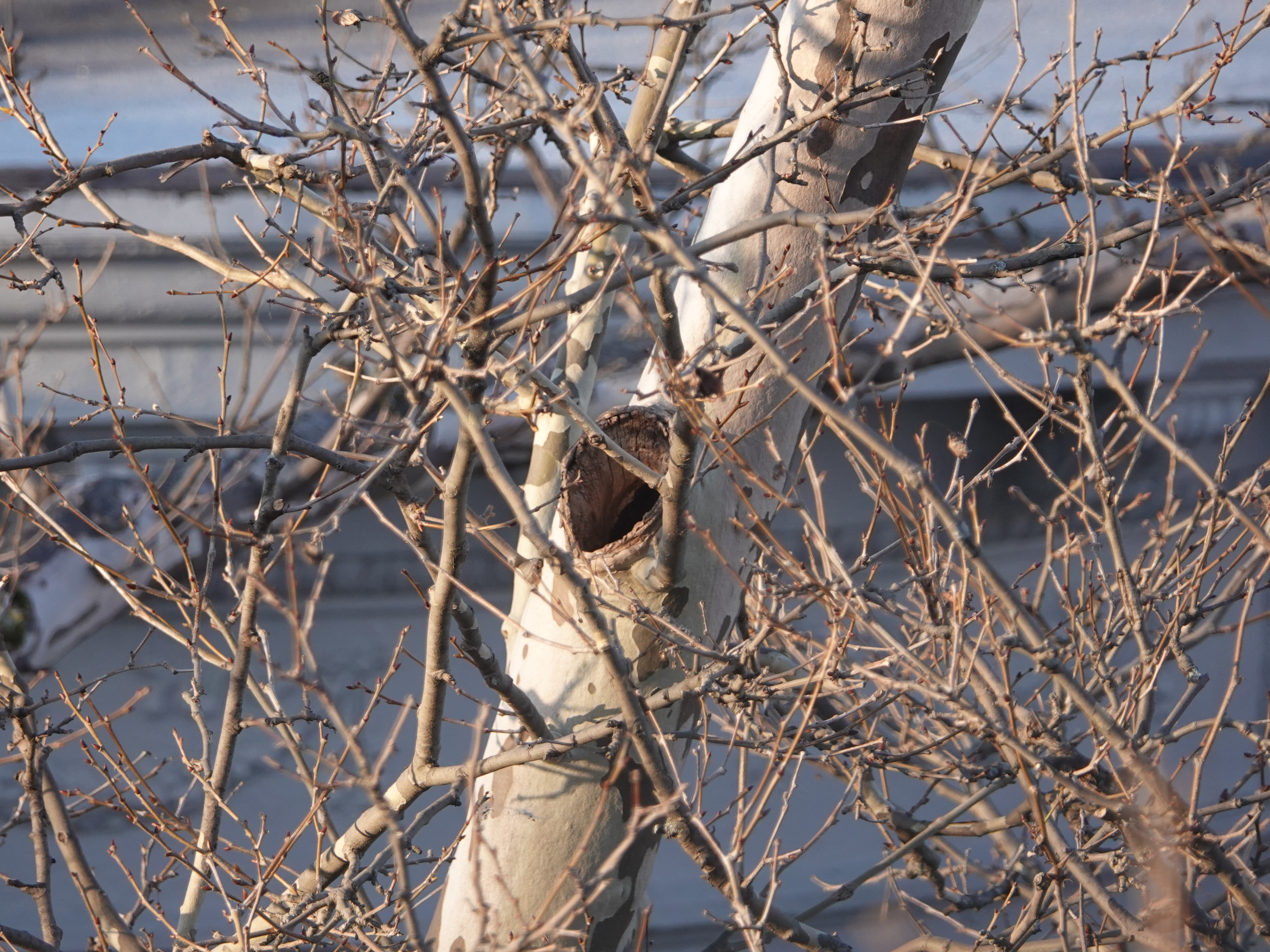 The tree is a London Plane, a very common street tree here in New York (as in many European cities). Platanus × acerifolia (also known as Platanus × hispanica) is a hybrid between P. orientalis and P. occidentalis, a tough little love-child able to tolerate compacted soil and bad air, thus becoming the city tree par excellence. This one isn’t in great shape. It used to host the local American Kestrels. They stashed food in other holes on the branches, and perched upon a bare, straight-up vertical post of a branch, since knocked down in a storm.