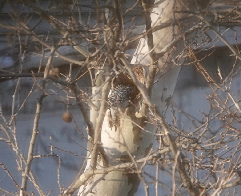 I’ve seen a female Red-bellied Woodpecker clamor into this hole a couple times this winter. She announces herself loudly when she arrives, looks into the hole, looks around outside, and then just pops right out of sight. This has been happening 20-45 minutes before sunset. It may be one of several night roosts for her.
