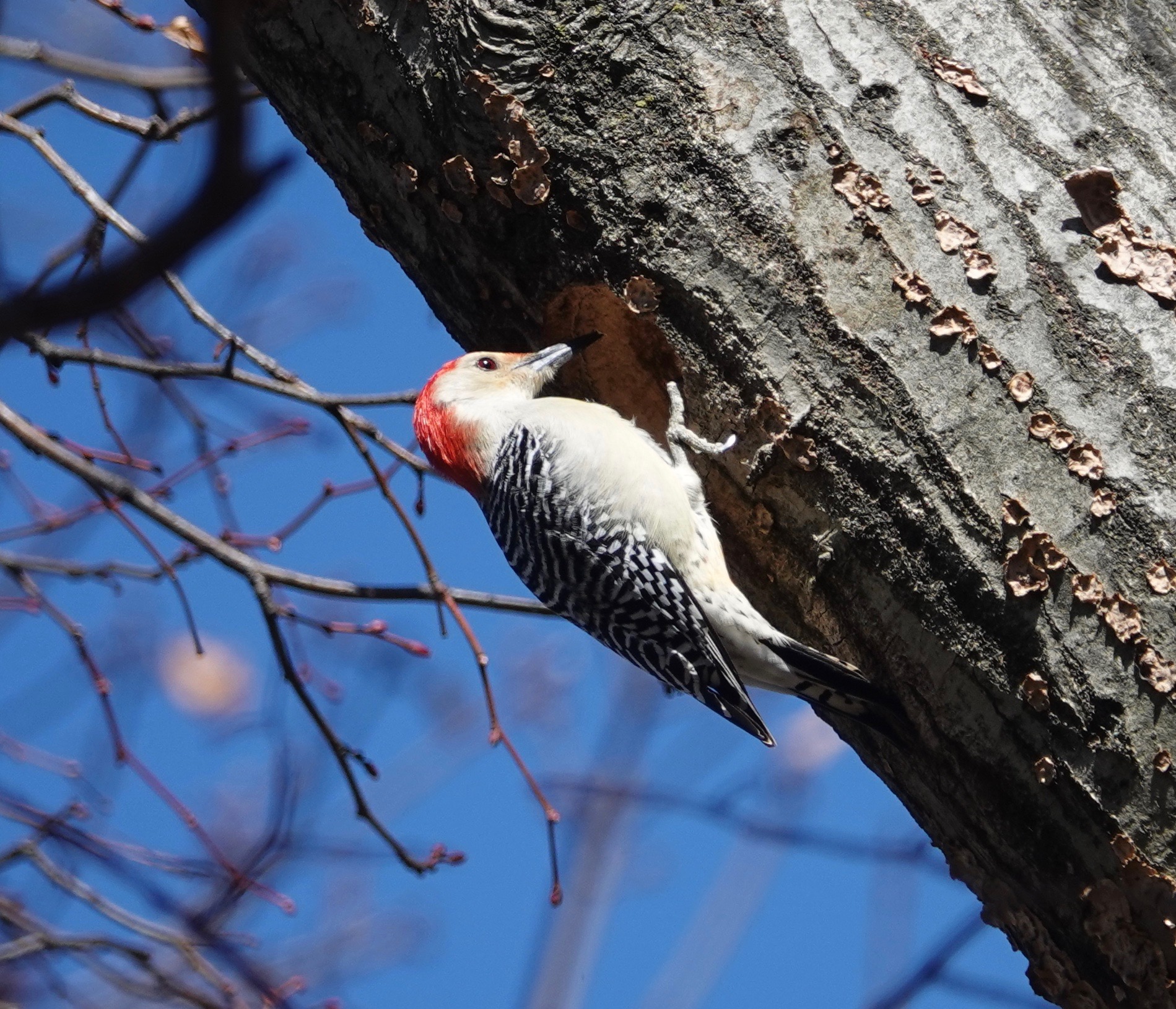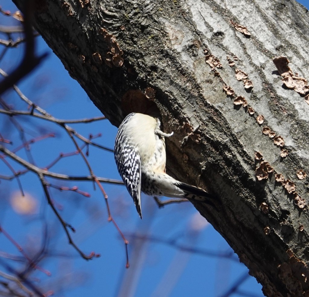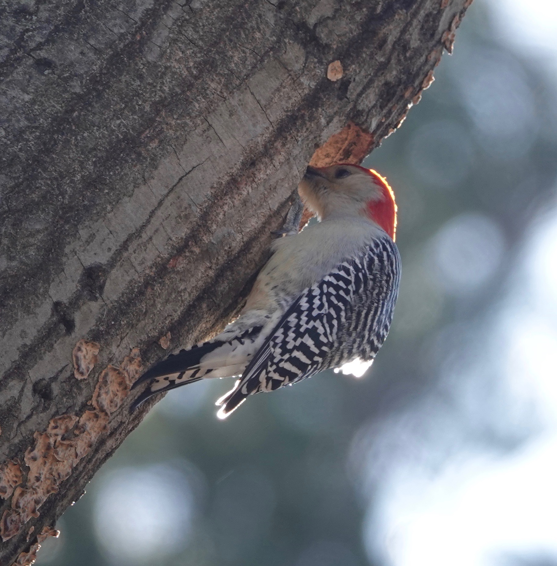 A male Red-bellied Woodpecker excavating a nest site.Note the fungi. This limb of an oak is rotting out. A change of angle on the proceedings.A female showed up and gave the tree a tap or two.