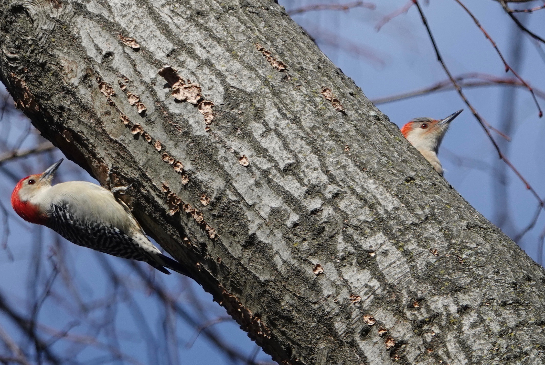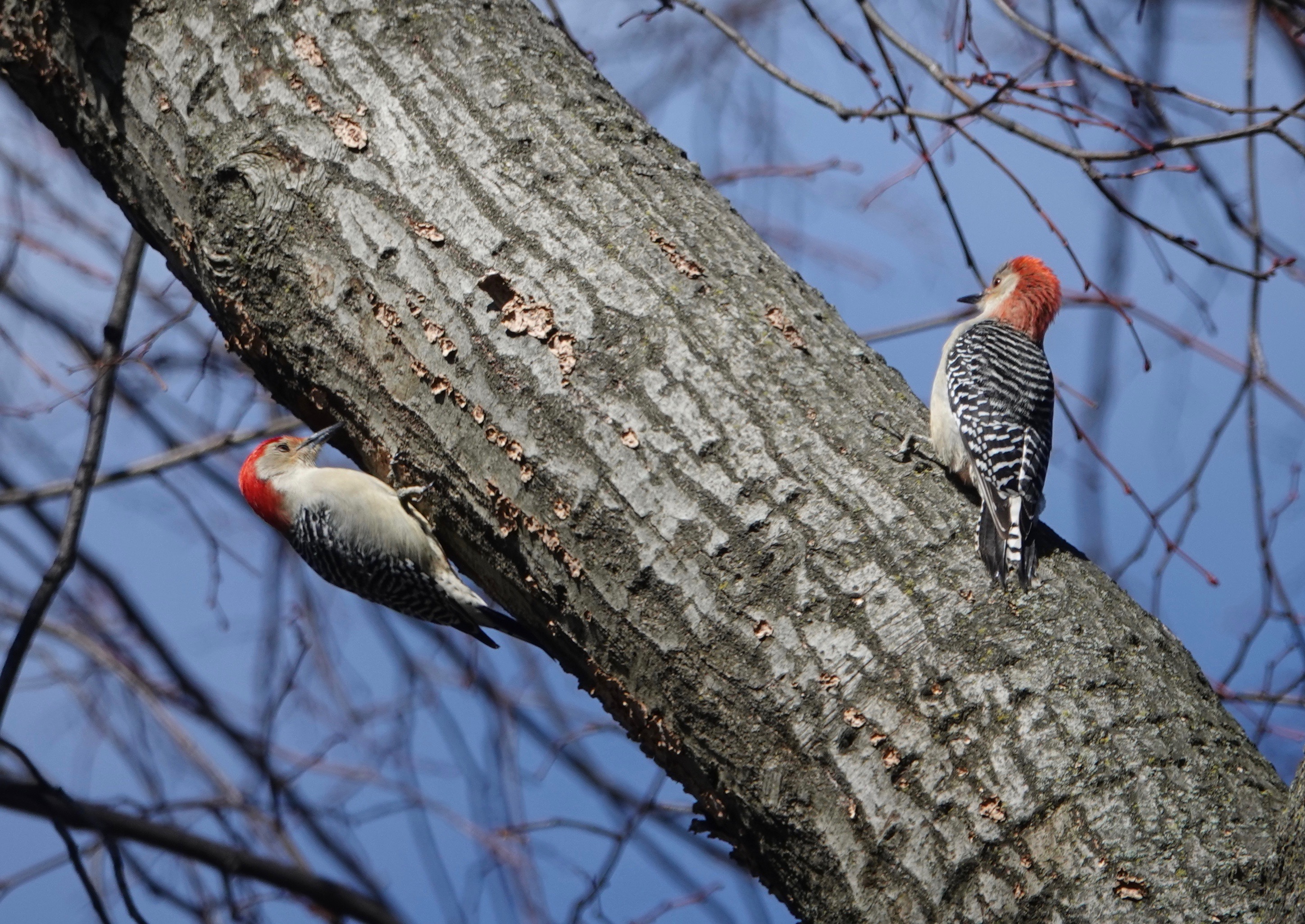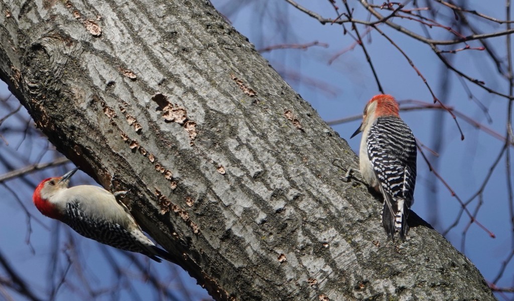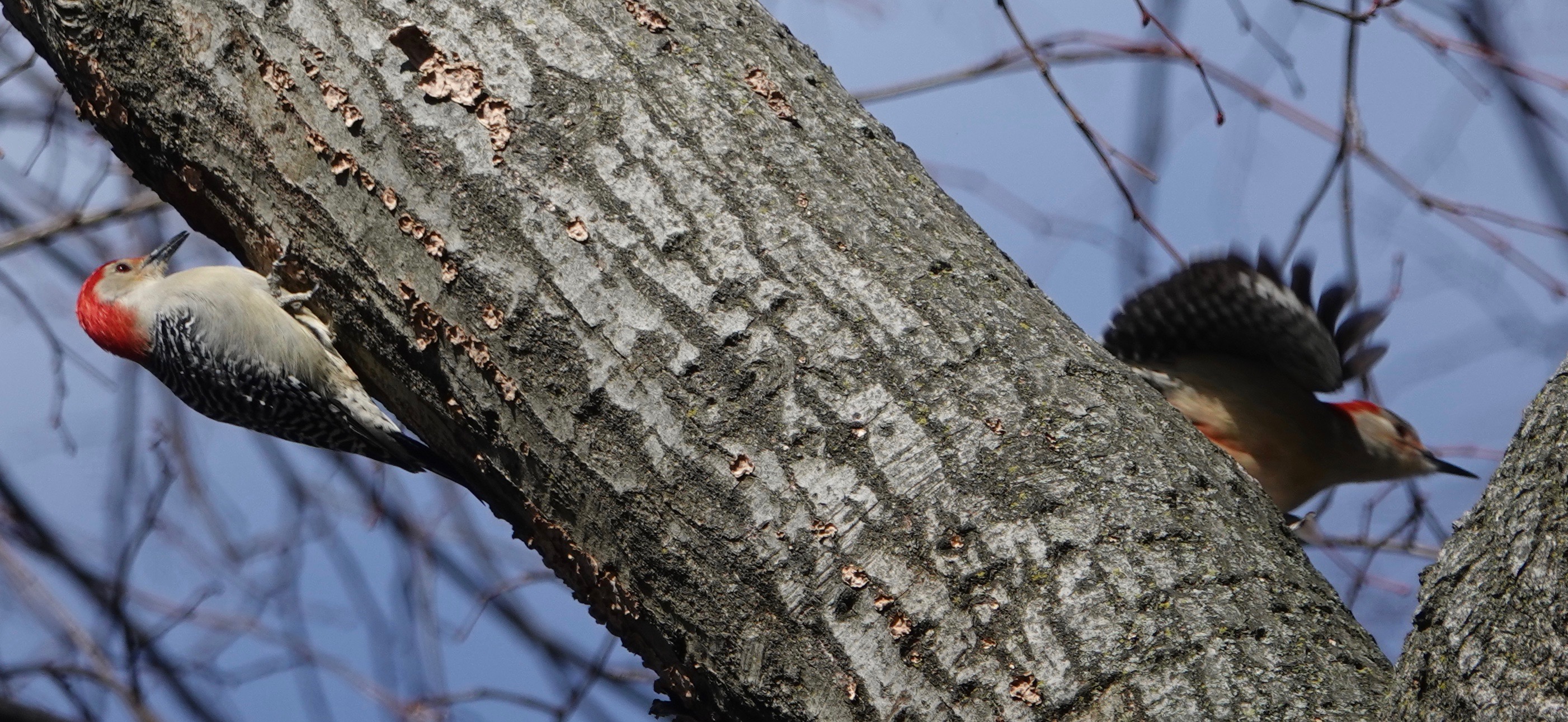 A male Red-bellied Woodpecker excavating a nest site.Note the fungi. This limb of an oak is rotting out. A change of angle on the proceedings.A female showed up and gave the tree a tap or two.