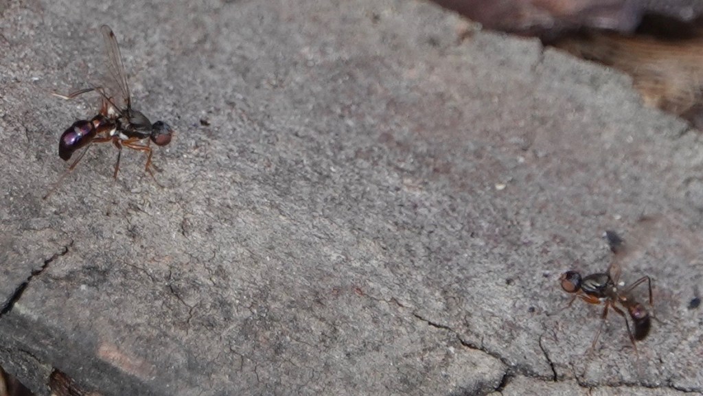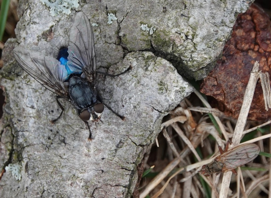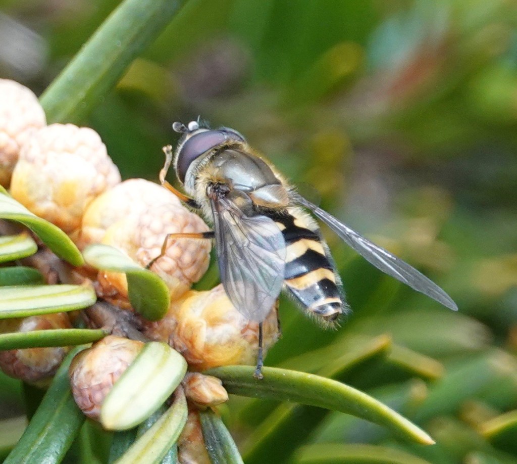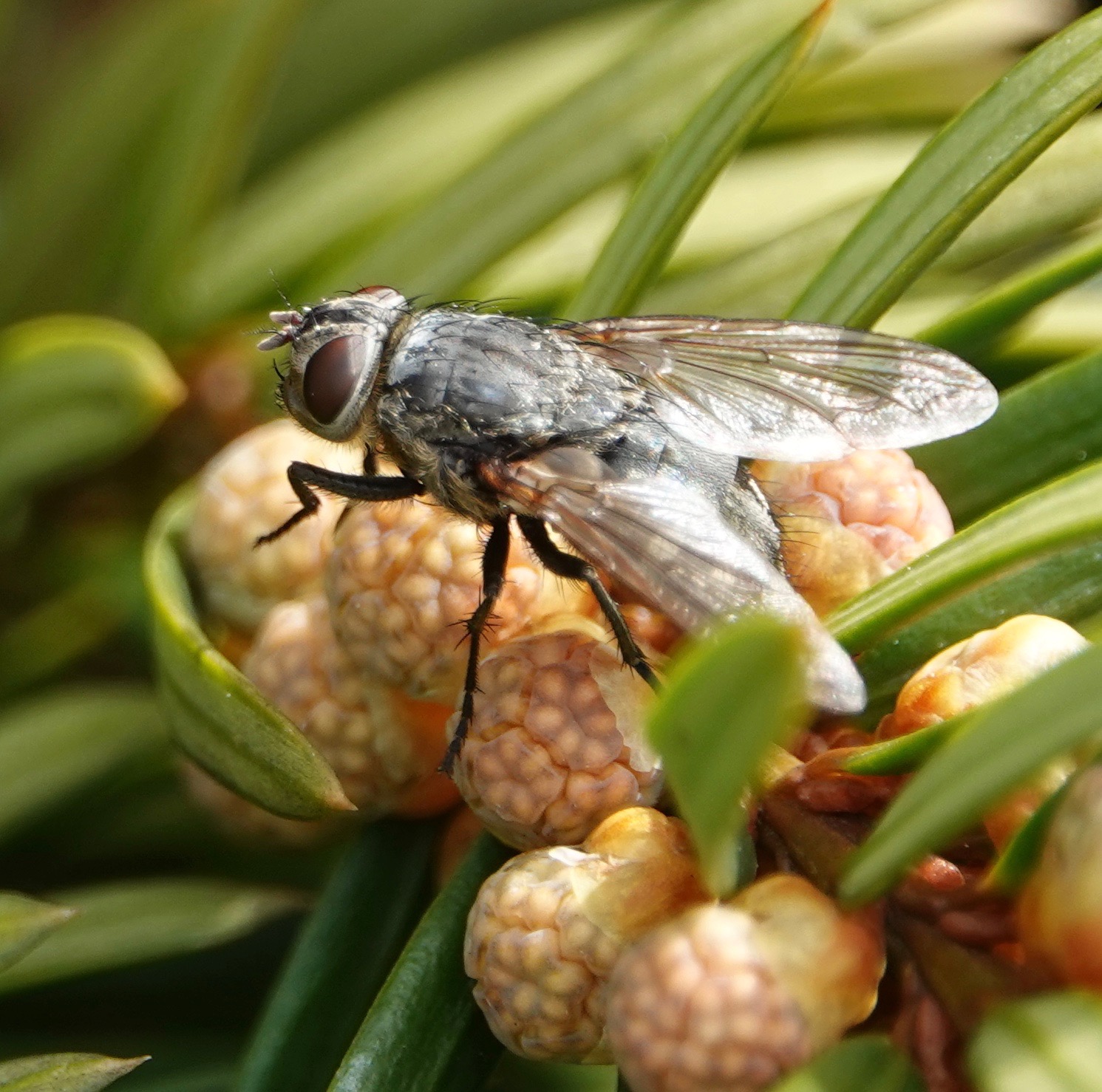 Monday was the warmest day of the year so far.The flies were out and about.These are Yew (Taxus) cones, btw, and where all the action was when it wasn’t around poop. Hey, flies gotta fly.