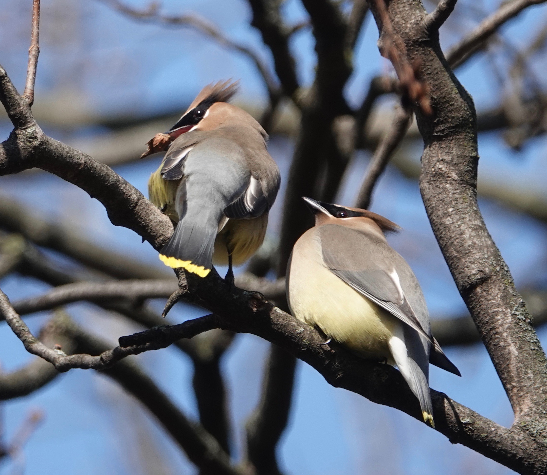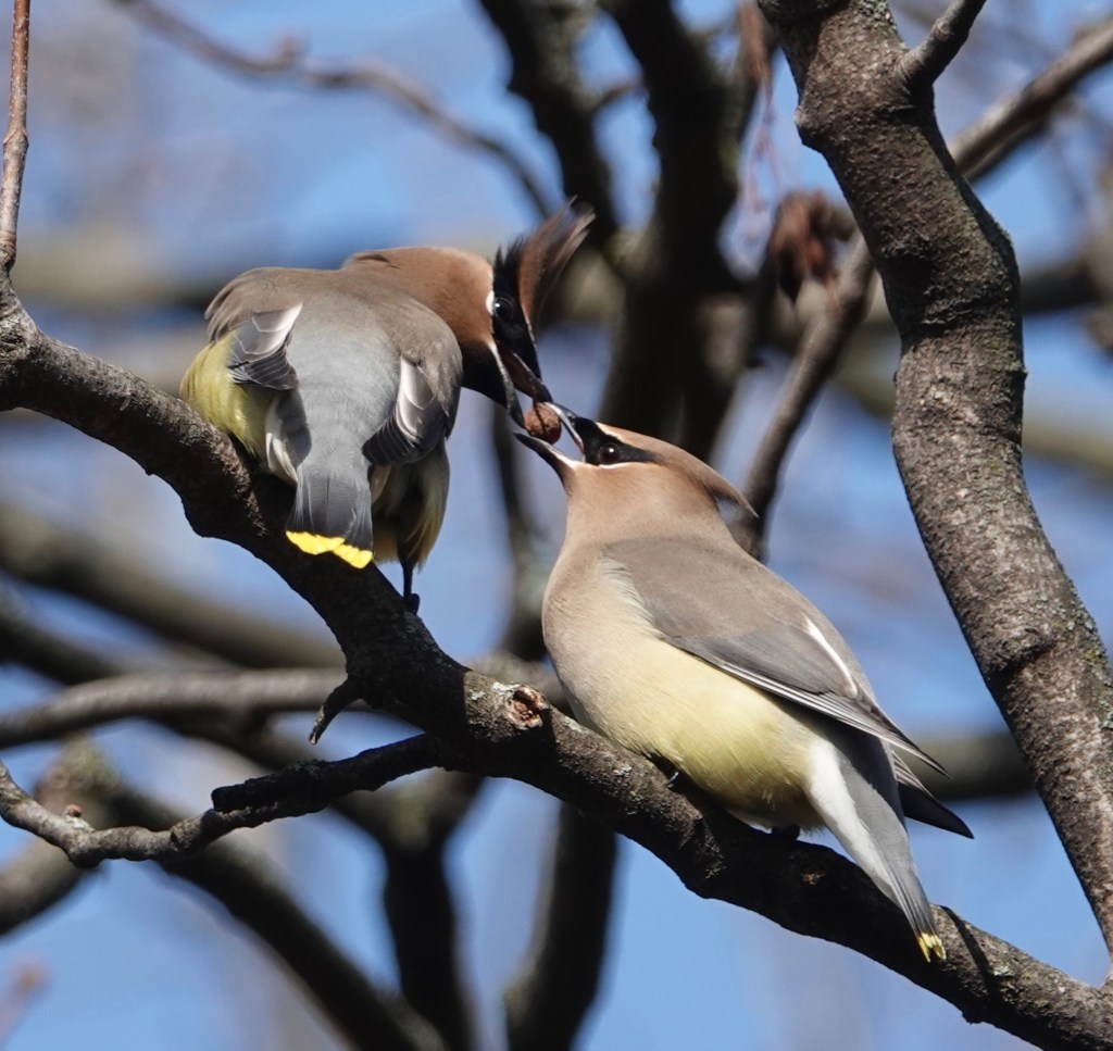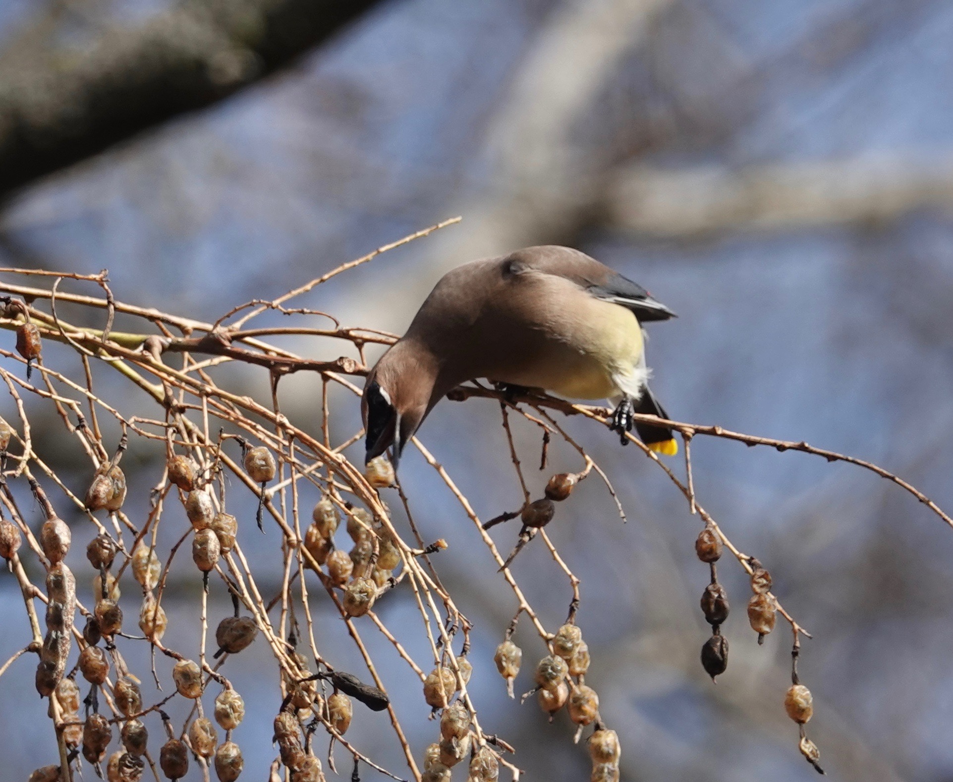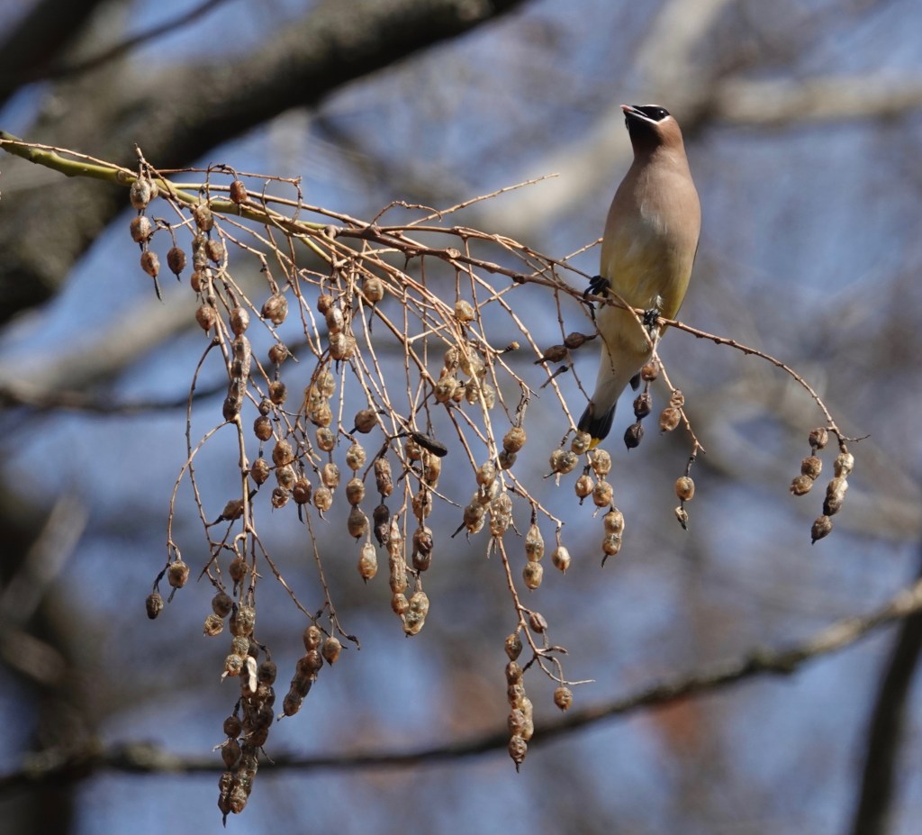 Amidst a flock of several dozen Cedar Waxwings, two were passing the meaty, seedy end of a Sycamore Maple samara back and forth.Most of the other CW’s were eating the bean pod-like seeds of Styphnolobium japonicum: