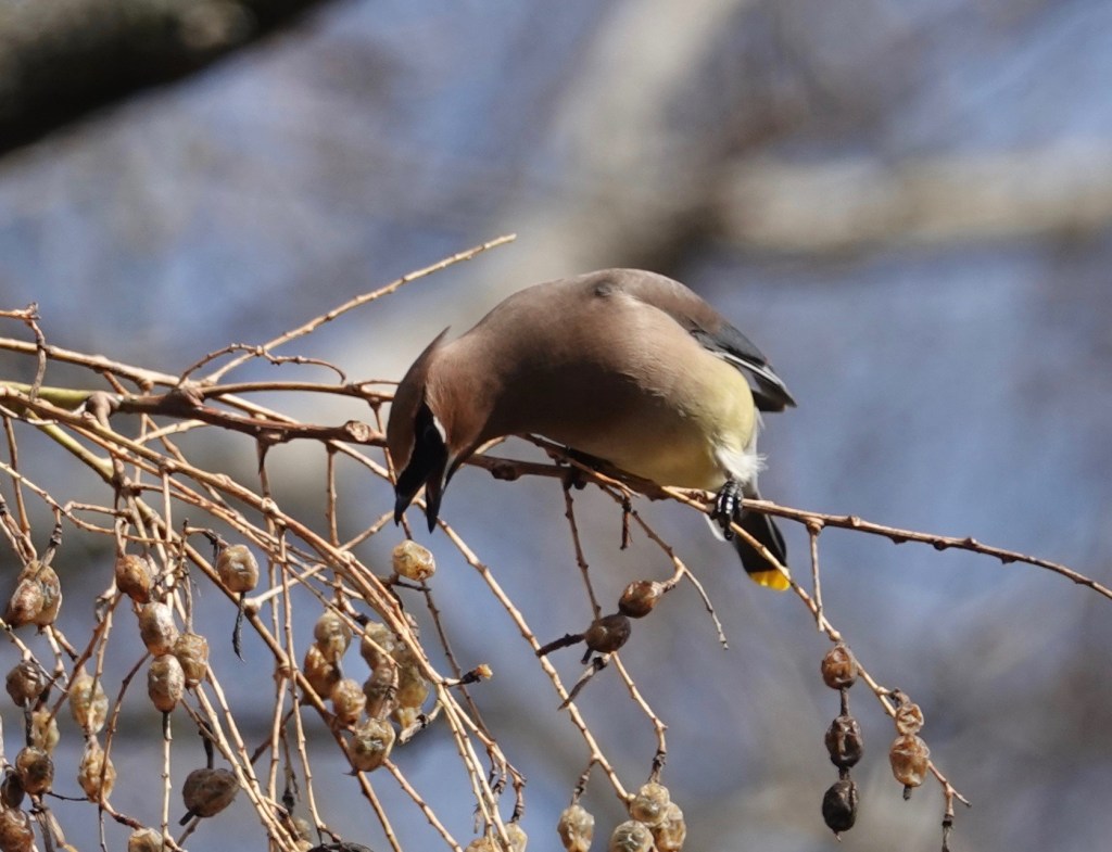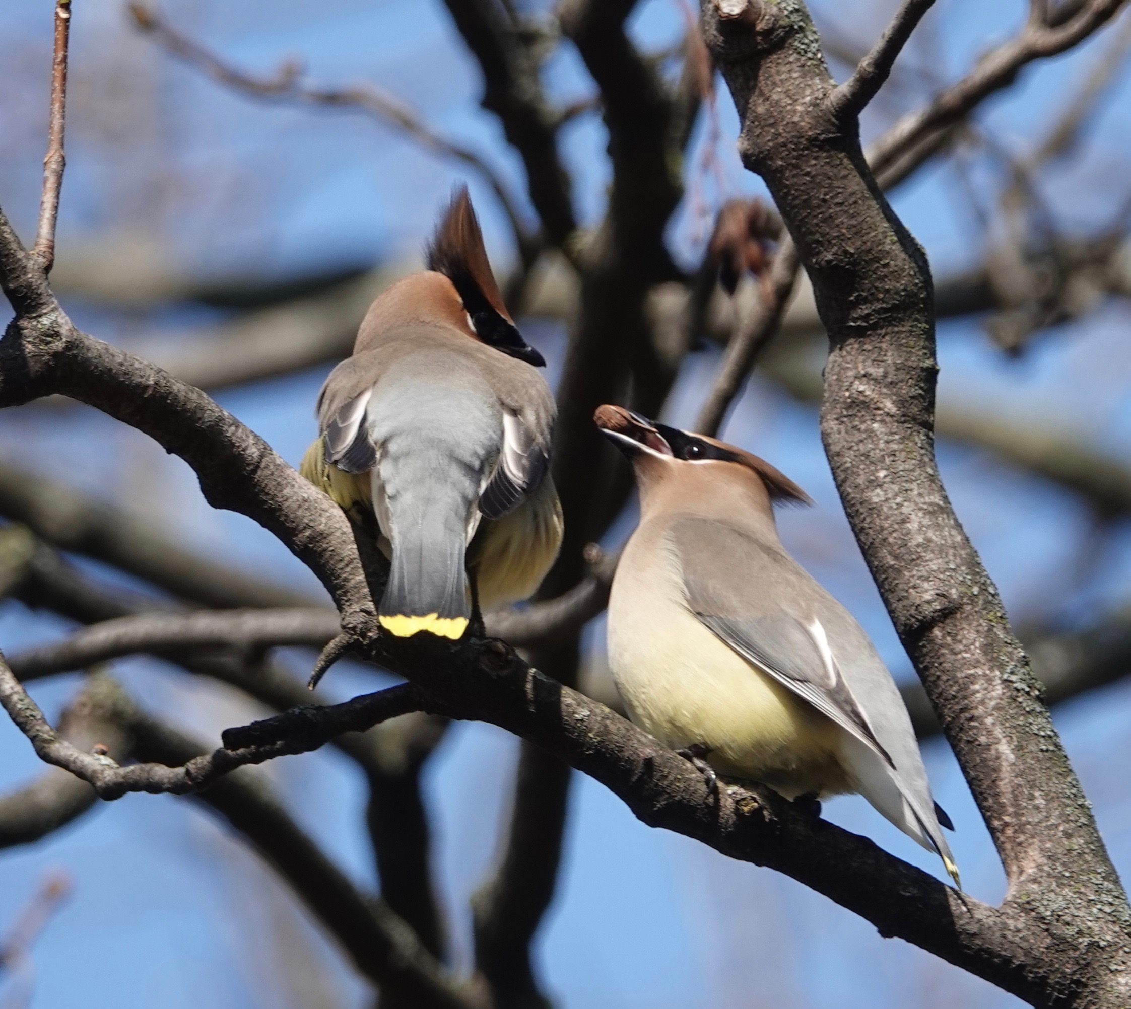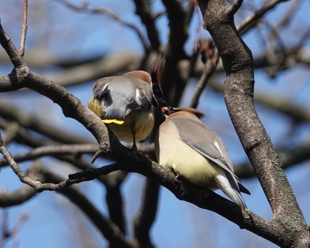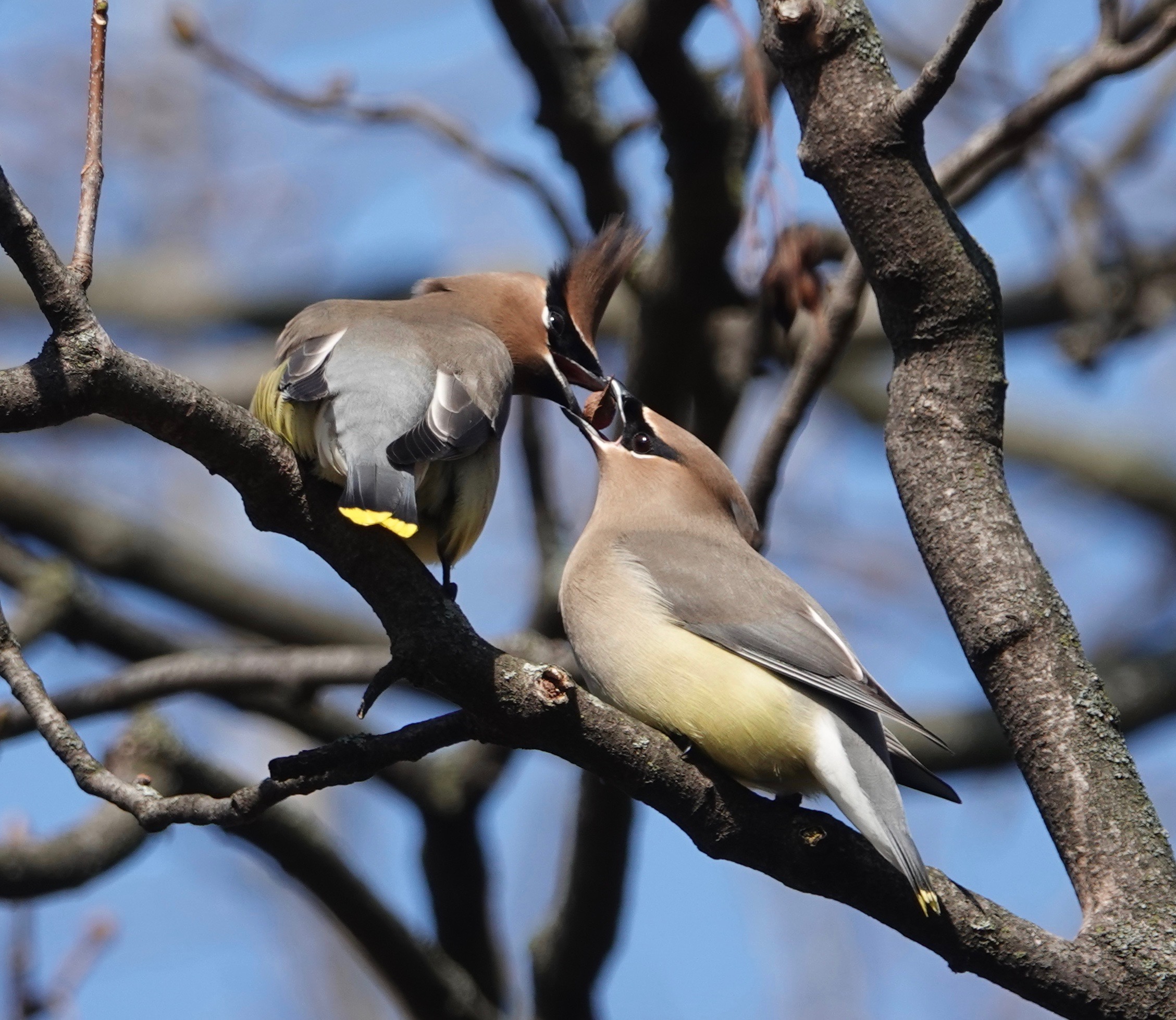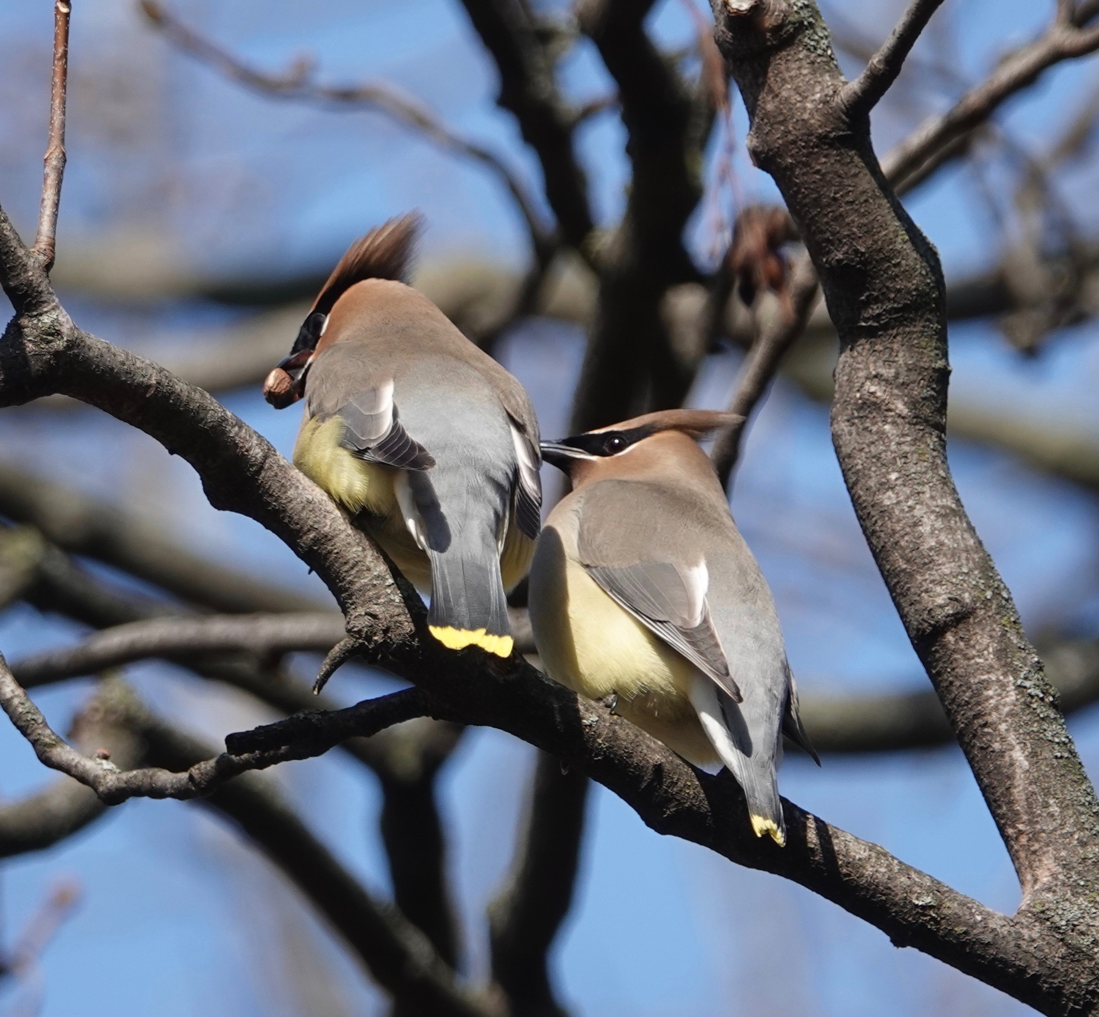 Amidst a flock of several dozen Cedar Waxwings, two were passing the meaty, seedy end of a Sycamore Maple samara back and forth.Most of the other CW’s were eating the bean pod-like seeds of Styphnolobium japonicum: