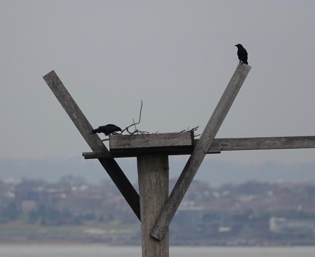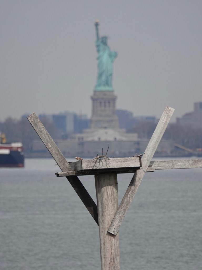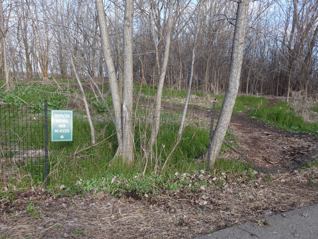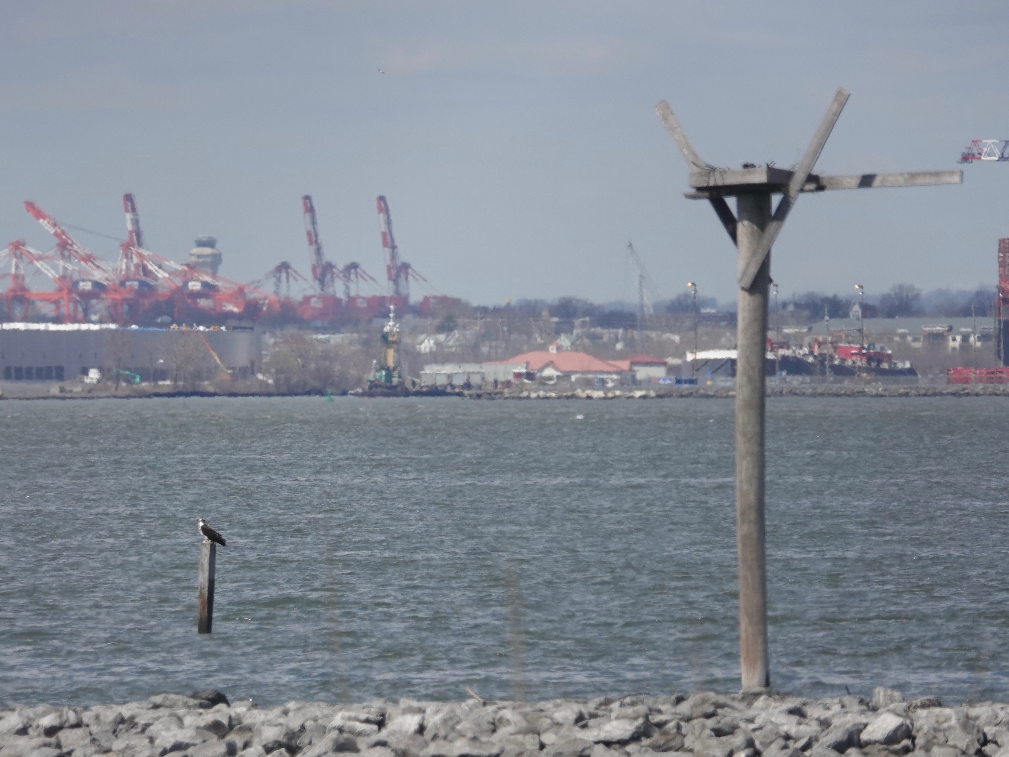 The last couple of times I’ve been down to Bush Terminal Park, an Osprey has been perched on the lone piling off-shore.And there were sticks in the nest platform for the first time since the park opened. A fact which intrigued these Fish Crows. I wondered if these two were going to take some of these sticks, perhaps for a nest of their own? They didn’t.This one was here the whole time the crows were on the platform. Hard to see here, but the bird has a fish in talons. An Osprey over Green-Wood, so perhaps a different bird. This past weekend, I heard that two were in fact seen in the Bush Terminal nest platform. It’s notable that Ospreys are using this platform while the jetty extending down towards it is closed for construction. (Gulls have also clustered on the now no-access structure, which I’m guessing they did at night when the park was closed.) People at the end of the jetty would be about 200 feet from the nest. On the other side, people can get to about 150 feet from the nest platform, even though this area is supposedly off-limits. The desire path on the right sure make a mockery of the sign on the left. People are in here to party, fish, run their unleashed dogs, and camp. There’s little to no enforcement n NYC parks, which get less of 1% of the city budget. This gap was fenced off with wooden slats more recently than this picture of 3/27, but then the wire fencing next to the new wood was immediately pushed down.