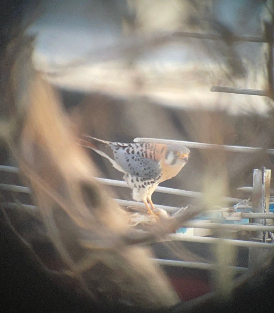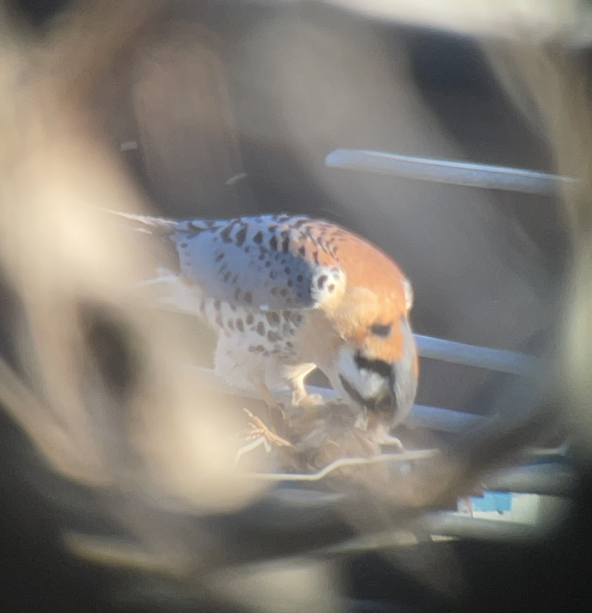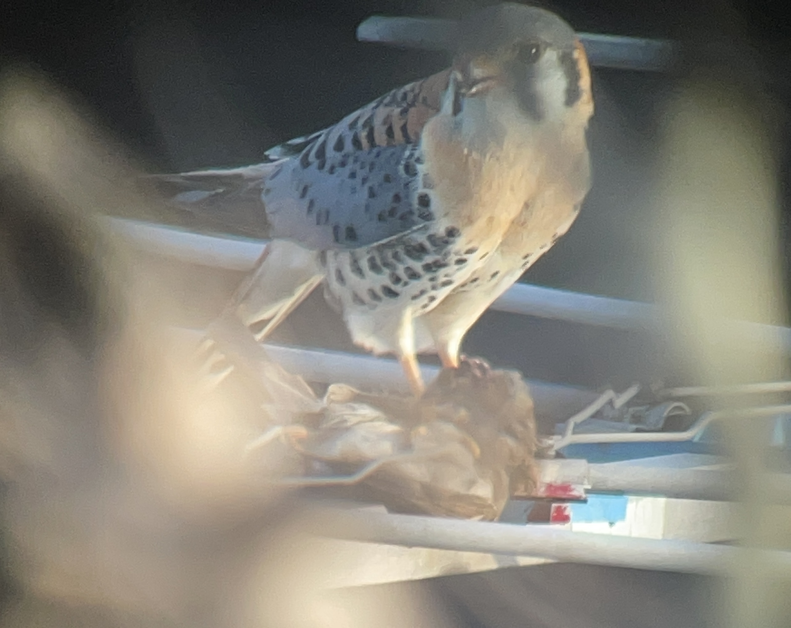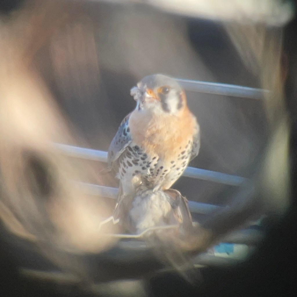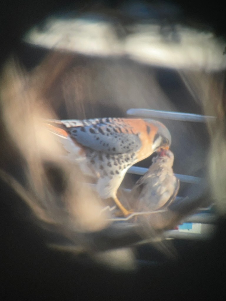 House Sparrow is a major part of the kestrel diet from early spring to late summer when big bugs, like dragonflies, offer a bit of variety. There seems to be a coincidence betwween fledging of the sparrows and hathing of nthe kestrel eggs. Then, when lots of food for the young is needed, there is an abundant crop of young, stupid and available meat for the parents to deliver.