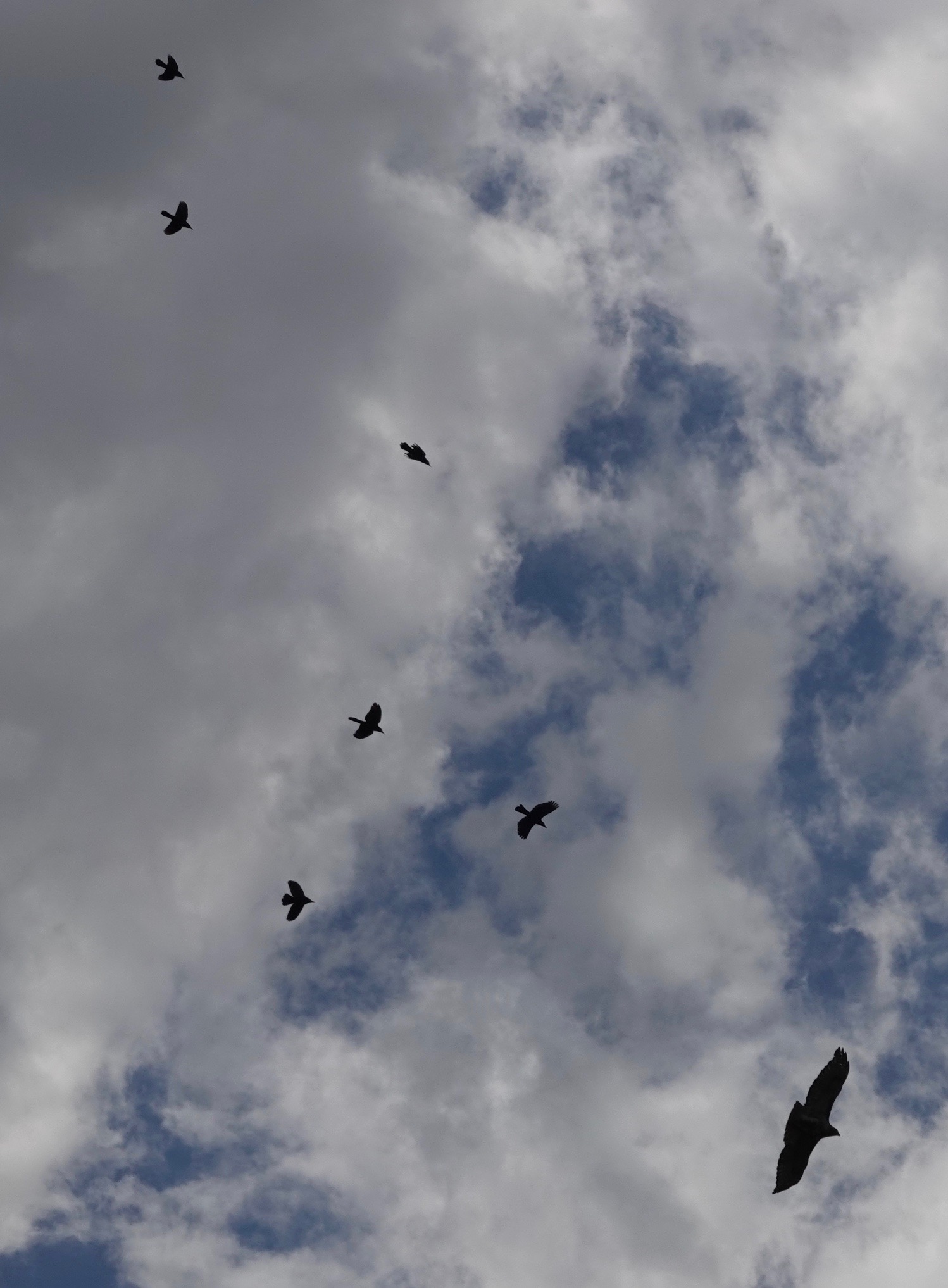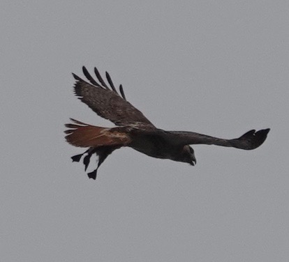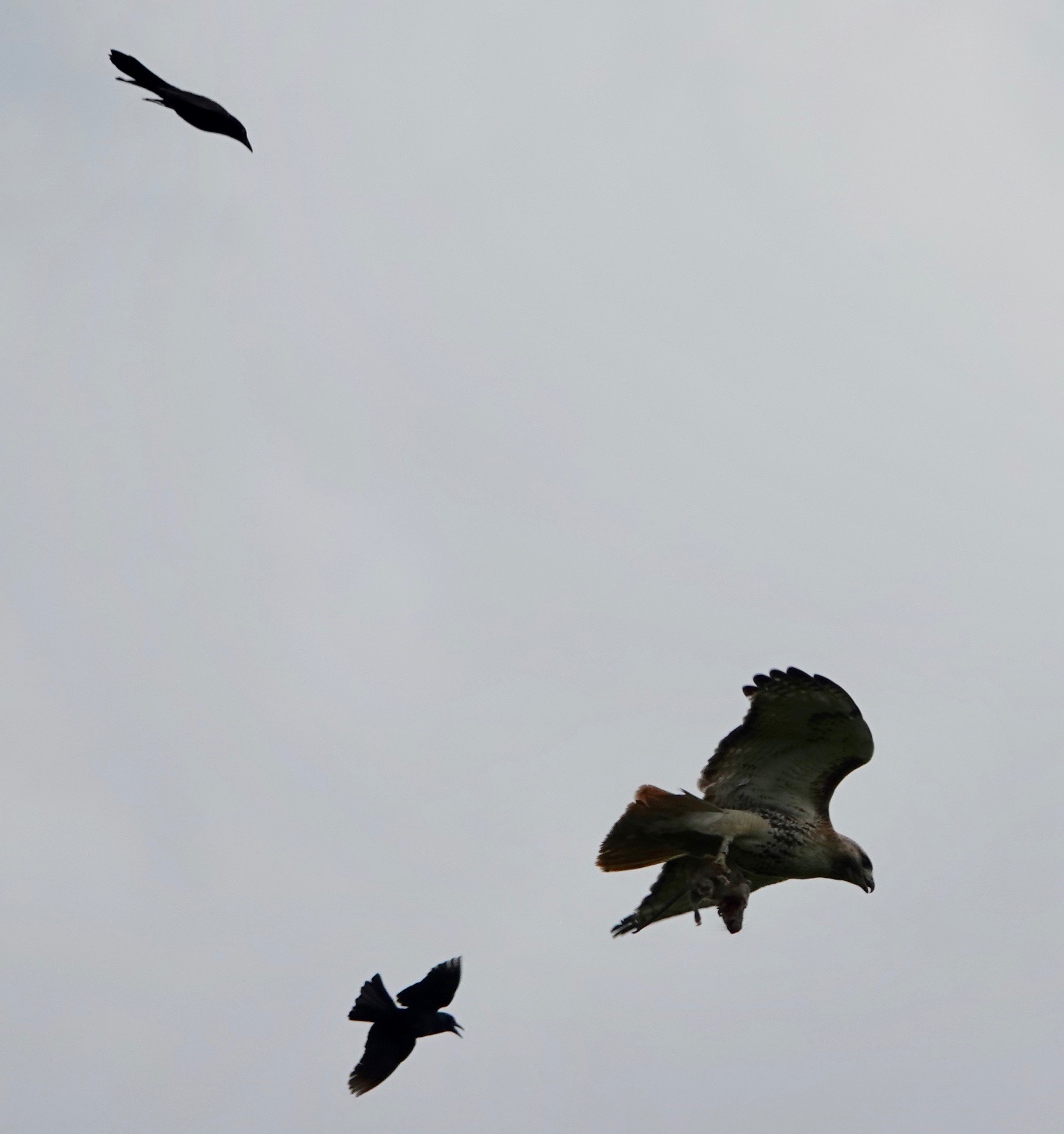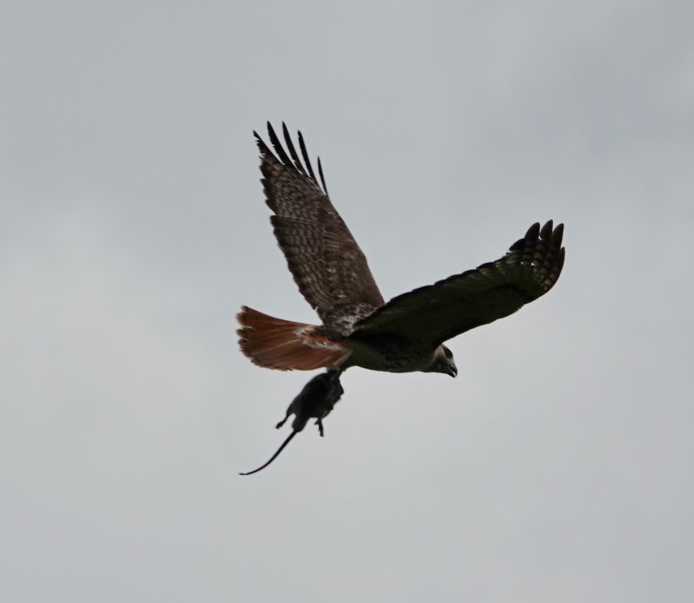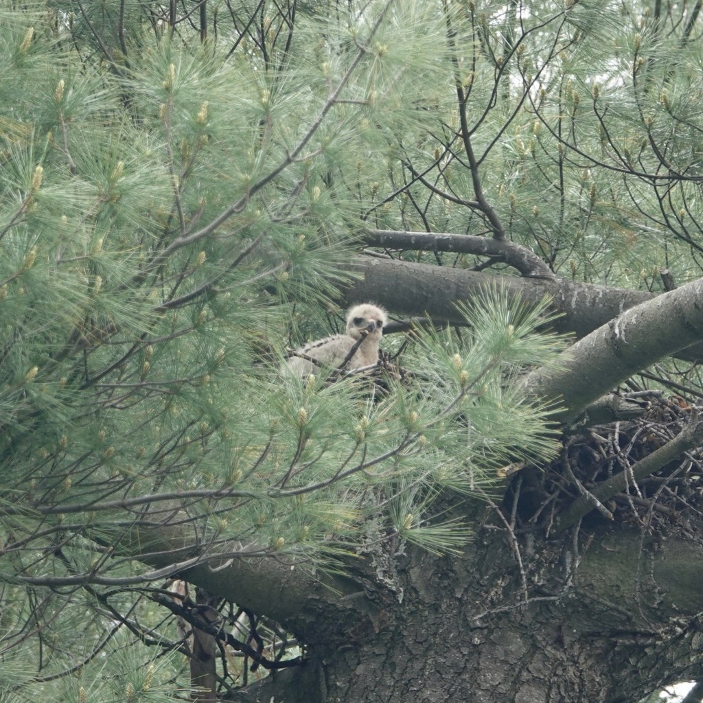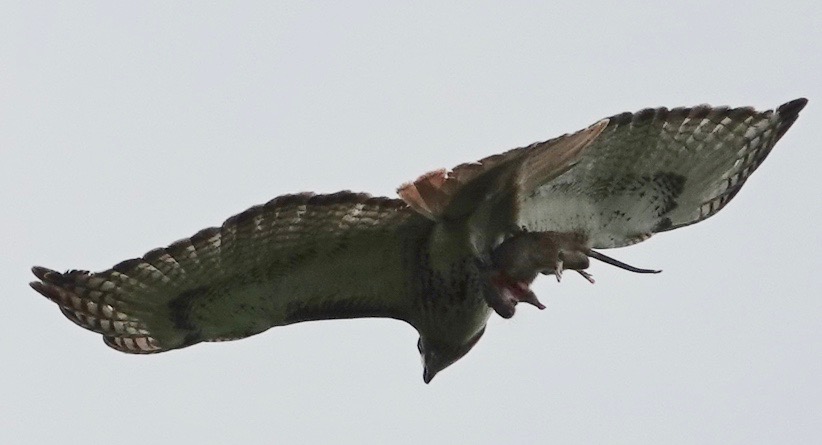A Red-tailed Hawk nestling seen this weekend.Probably one of the parents, seen the next day. And yes, that does look like a baby duckling, doesn’t it? And this, yesterday, seems to indicated Brown Rat is on the menu as well.Not that the Grackles were pleased about this.