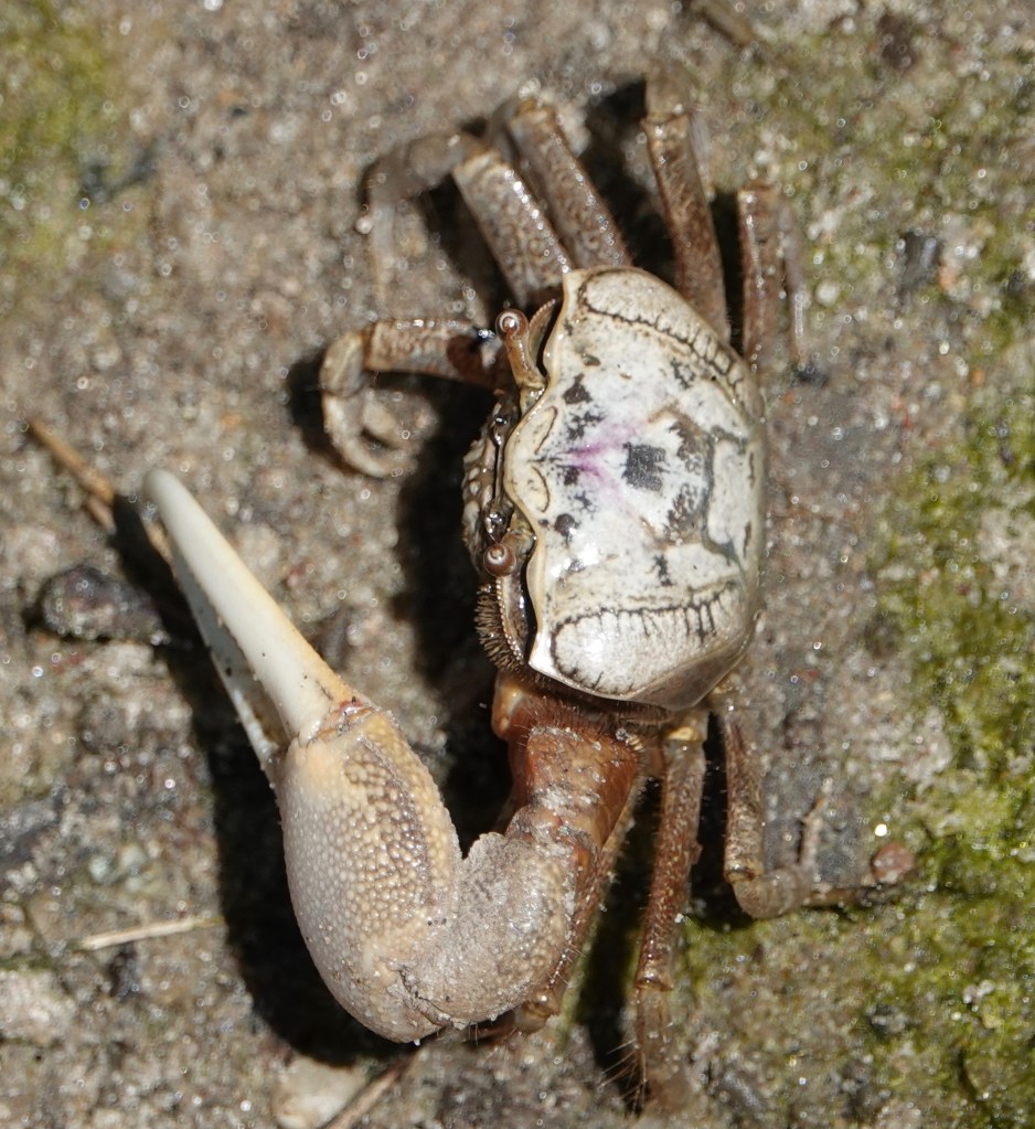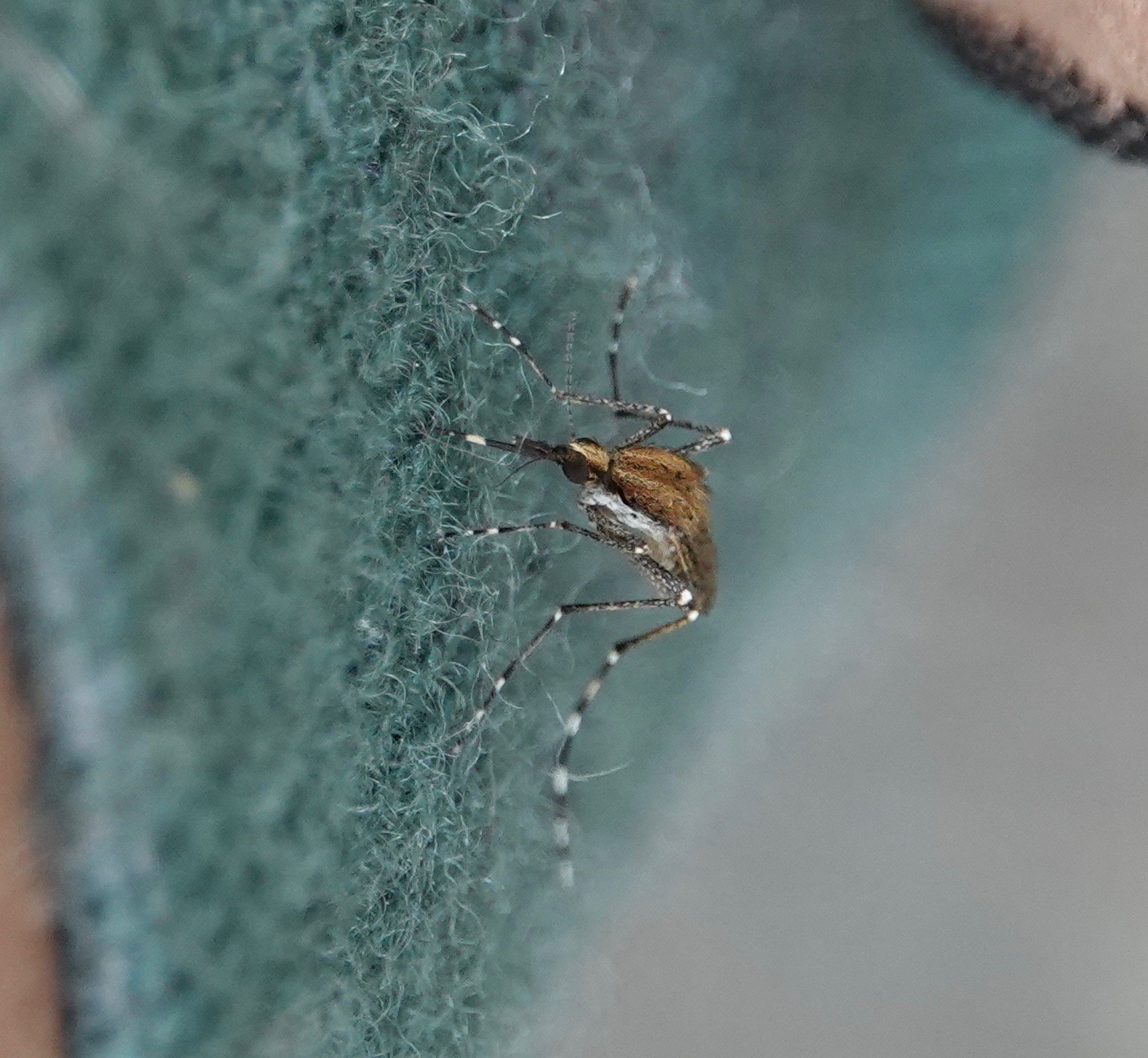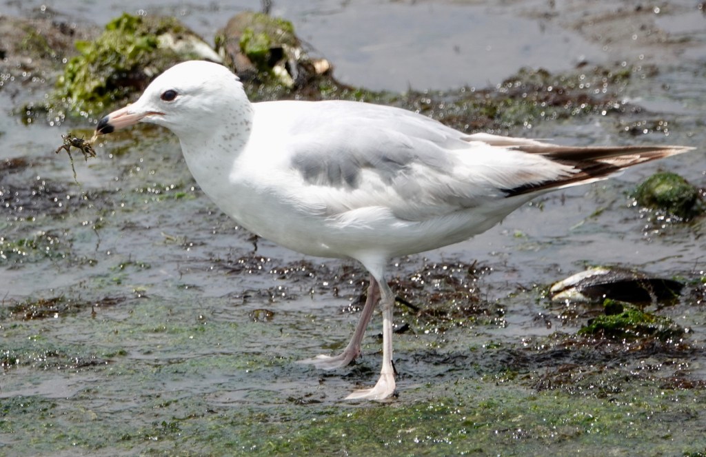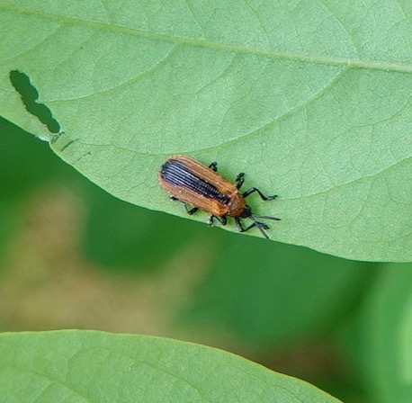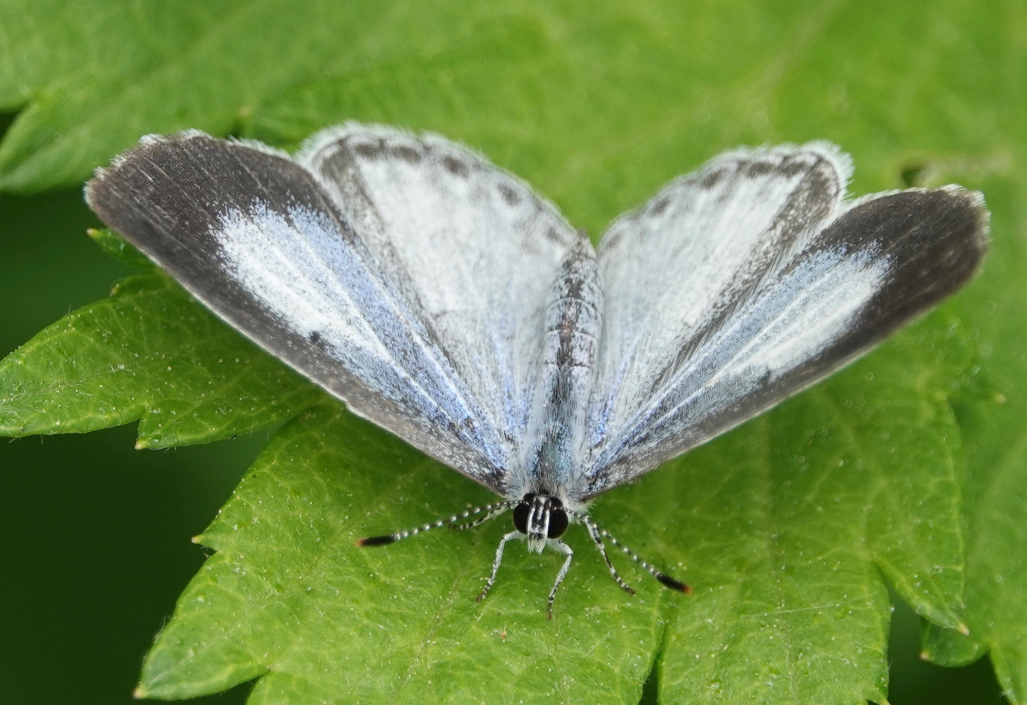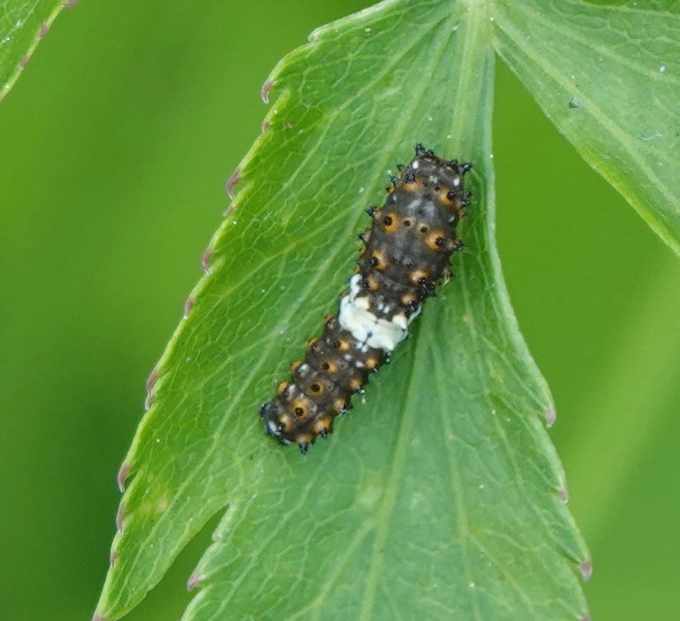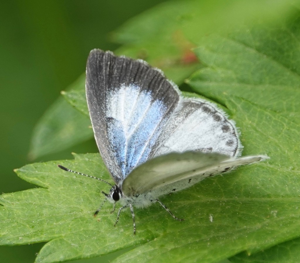 Ah, the Celastrina butterflies. This is a taxonomic bog I’m eminently not qualified to wade into. This one, it’s safer to say, is a female, and it’s still spring, so let’s say Spring Azure.. I rarely see these Azures with wings open. The iridescence of the blue is not adequetely conveyed by these photos. Last summer, I suddenly noticed a family of Eastern Kingbirds at a spot I pass through frequently and wondered where they’d come from. But this year, I’ve been seeing a couple around the same area, so I’m ready. New beetle (to me): Locust Leaf-miner (Odontota dorsalis) on a Black Locust leaflet. Developing Pignut Hickory nuts. Bird-turd stage of developing Black Swallowtail caterpillar. So many plant bugs, so little time.Crab for lunch. Nobody’s lunch.Grapholita… delineana? Making it the introduced Eurasian Hemp Moth (with a wee springtail on the leaf), a pot head if there ever was one.Photographed through this chainlink, meshed fence.There’s bare flesh an inch further up my ankle, but whatever.A recent sunset.