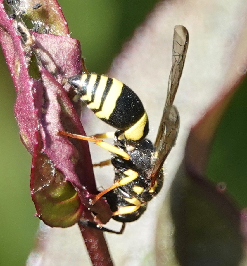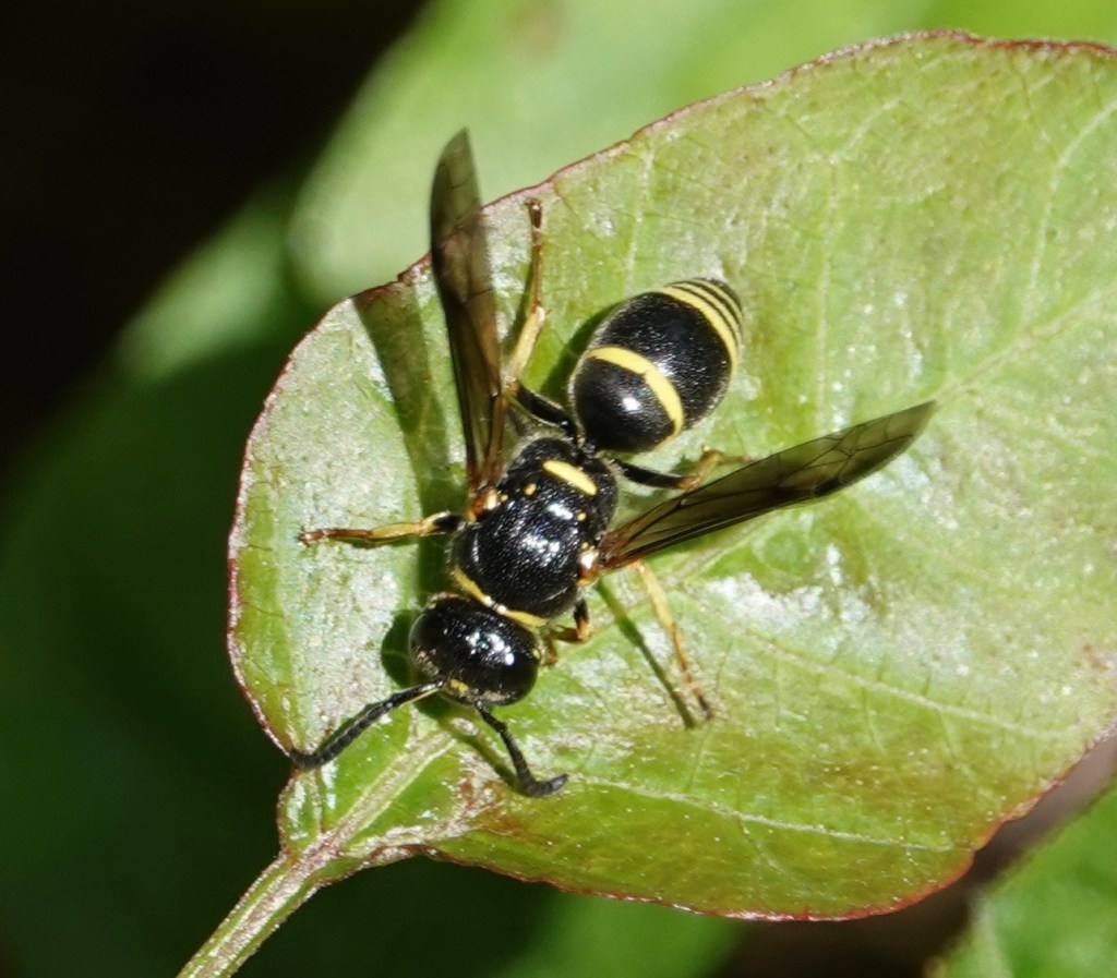 Three out of four of these Potter and Mason Wasps (Subfamily Eumeninae) don’t have common names, suggesting they are sadly under-known. The one that does is an introduced species that’s been in North America for at least 60 years. Potter wasps build free-standing nests out of mud. Mason wasps use mud to line and seal wooden cavities–they may well show up at your “bee hotel.” They all provision their larvae with caterpillars, sometimes beetle larvae. As in many carnivorous wasps species, the adults actually eat nectar. Two years ago, I observed some caterpillar-hunting action.