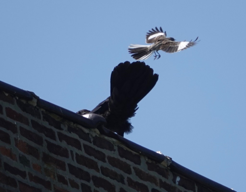 Even without the raven a mockingbird will put on a great show. I watched one sing it’s heart out for several minutes atop a building then fly up about ten feet doing flips and turns that would make an Olympic gymnast or diver envious. Then it landed on the same perch and began singing again. It was quite a show and it repeated several times. Definitely an eye-catcher. Those white patches in the wings and tail flashed brilliantly in bright sun and had to be visible for miles.