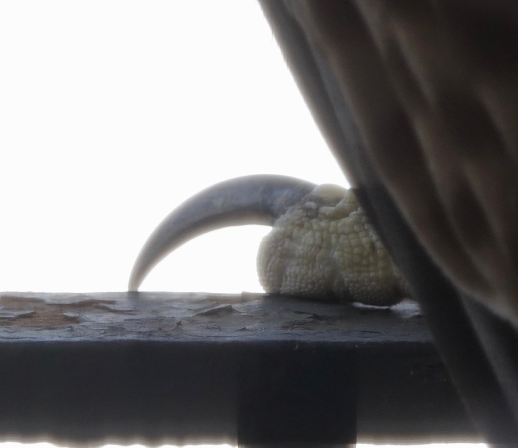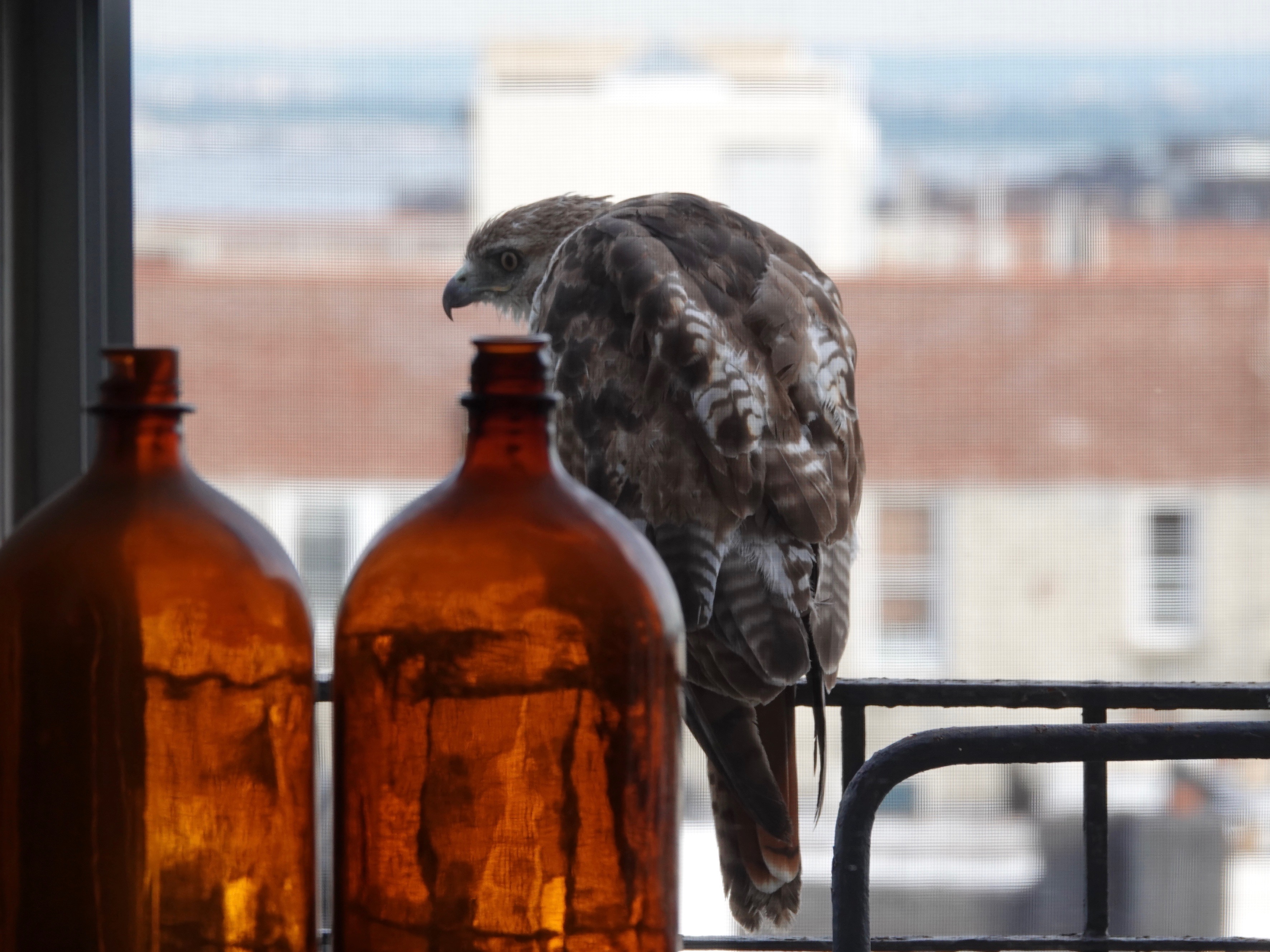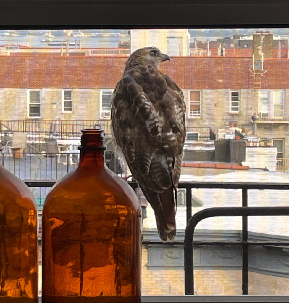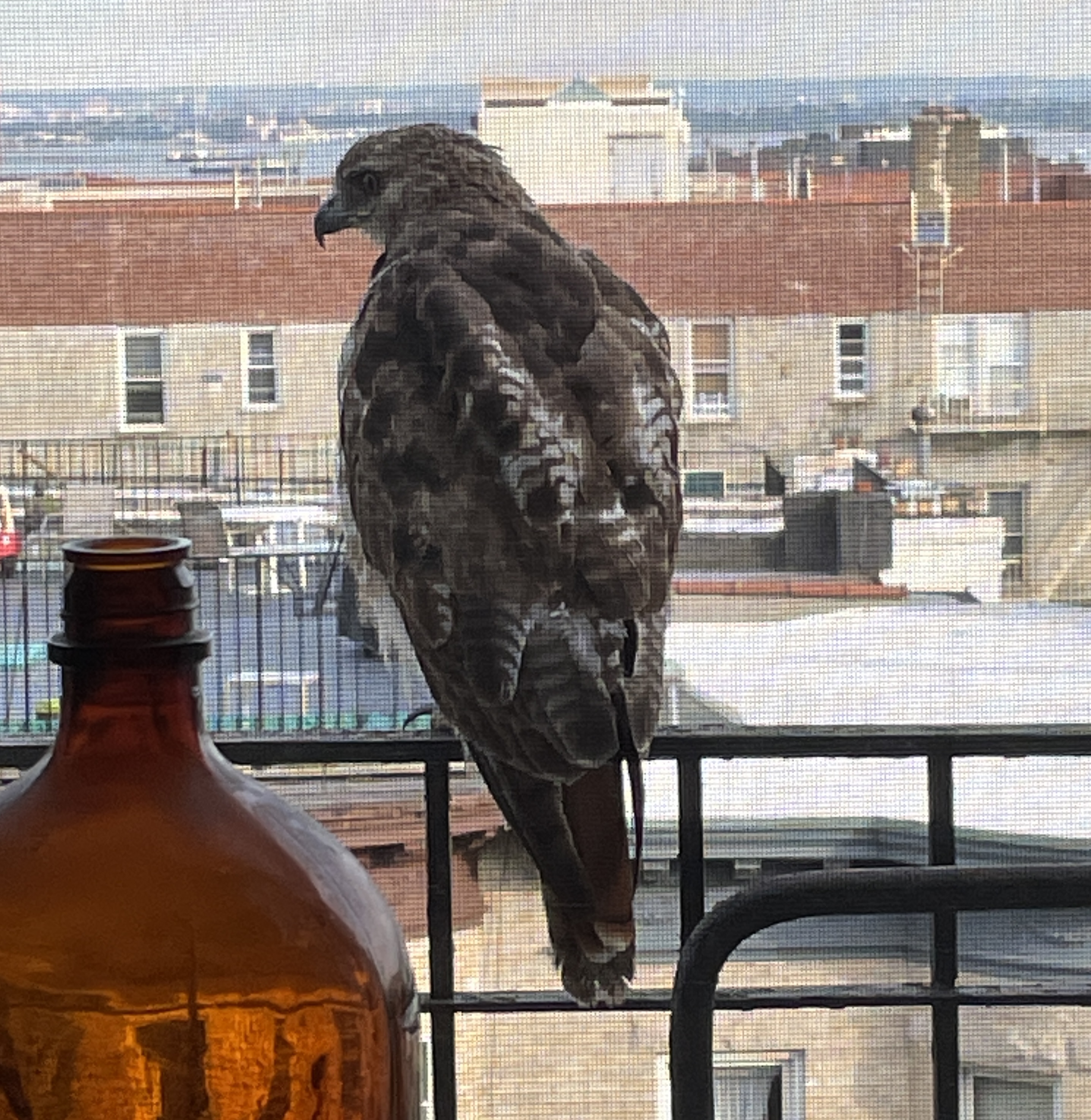 On the fire-escape recently. This is probably the young Red-tailed Hawk that has been all over Sunset Park, including our roof, this past winter and spring.I didn’t dare move the screened window, of course, so these all have a muted look.More so with the cell phone camera. Surprisingly, we haven’t seen raptors on this fire-escape all that much in the half dozen years we’ve lived here. Surprising, because, if you’ve followed along here, we see a lot of raptors around here, and the roof has had its share.Pigeons, House Sparrows, Starlings, Mourning Doves, of course. Even, once, a lost Rosy-faced Lovebird. Also, a male American Kestrel once cached a bit of bird prey leftovers in the corner…. This bird was born last year. Two red tail feather have come in so far. The rest will follow in the months ahead.Under many layers of paint, the old plaque on the fire-escape says “Any one placing any encumbrance on this balcony shall be fined ten dollars”. This building is about a century old and the sign may well be, too.