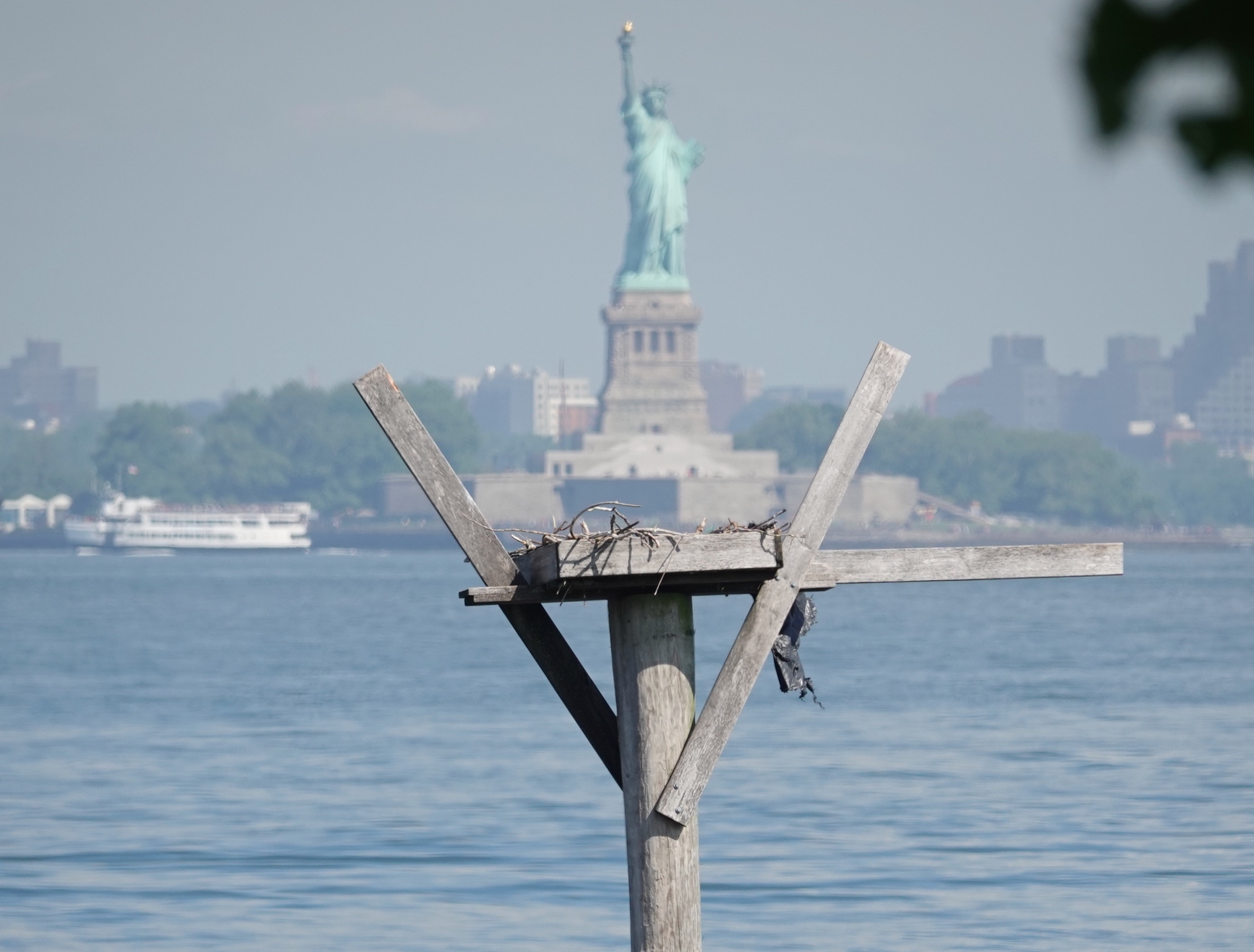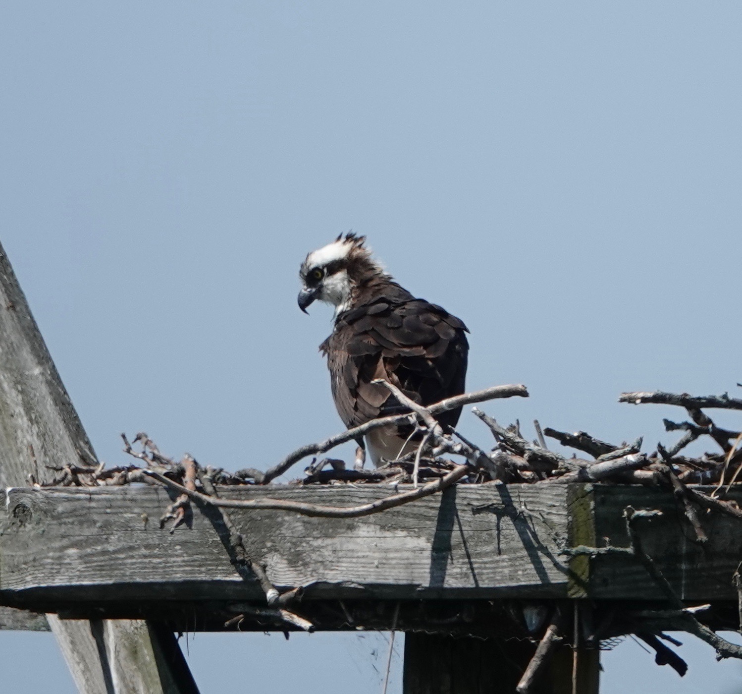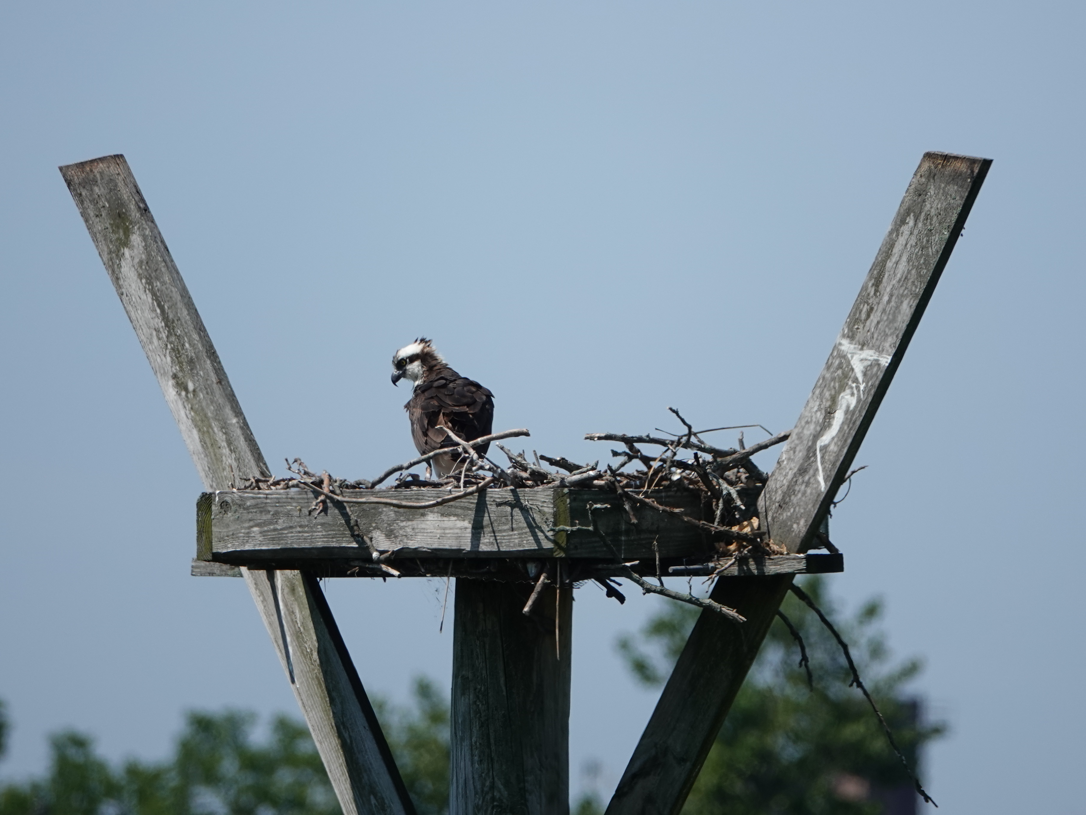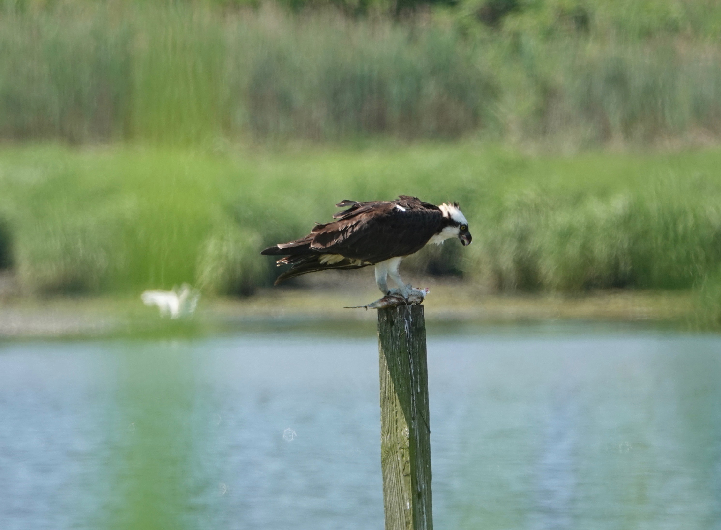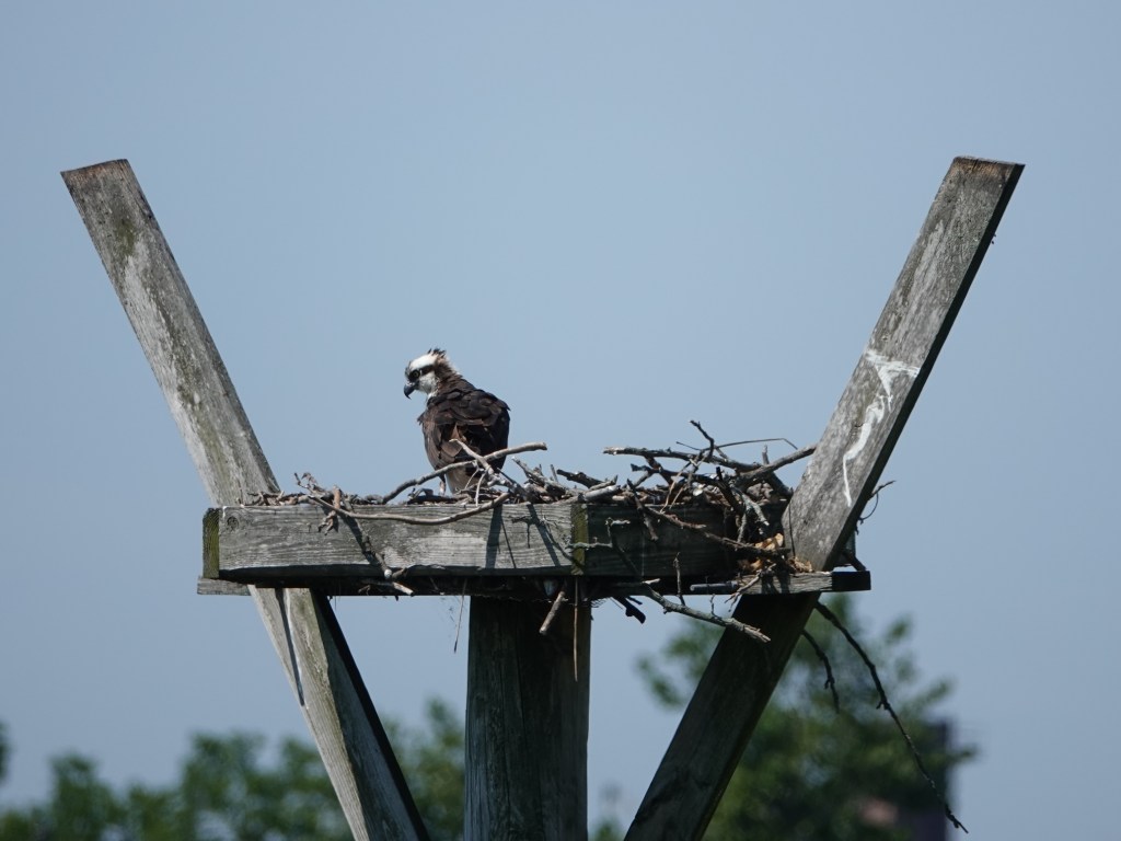 Last week there was a report that the Bush Terminal Osprey nest, the first attempt on this nesting platform, was abandoned. After more than two months’ effort. Have to wonder if this platform is just too close to people: on one side, a “wild” area (read: unmaintained by Parks) is regularly trampled through by dog walkers and others (Parks enforces nothing); on the other, a long pier closed for construction but full of equipment, and noise.One of the two nests at Marine Park looked to be ok this past weekend. No little heads yet, though.One of the parents feasting on fish nearby.