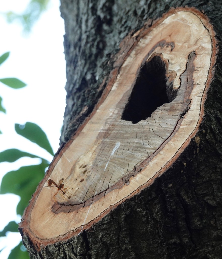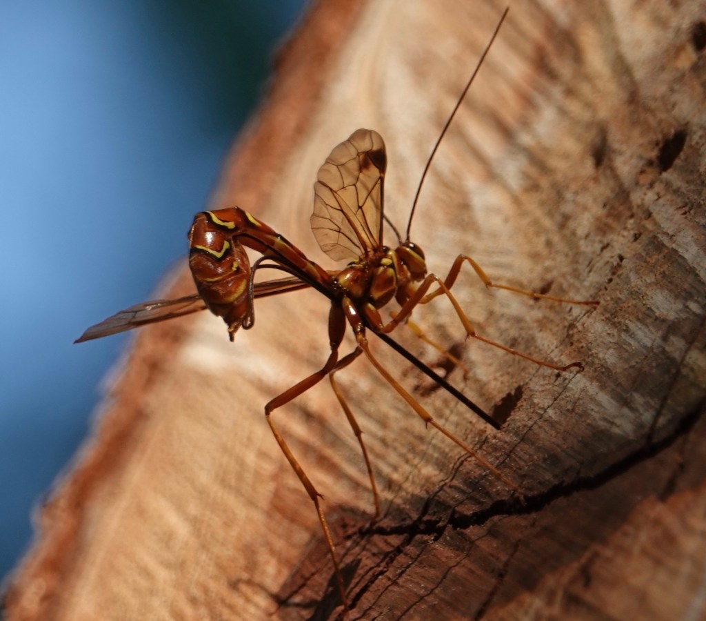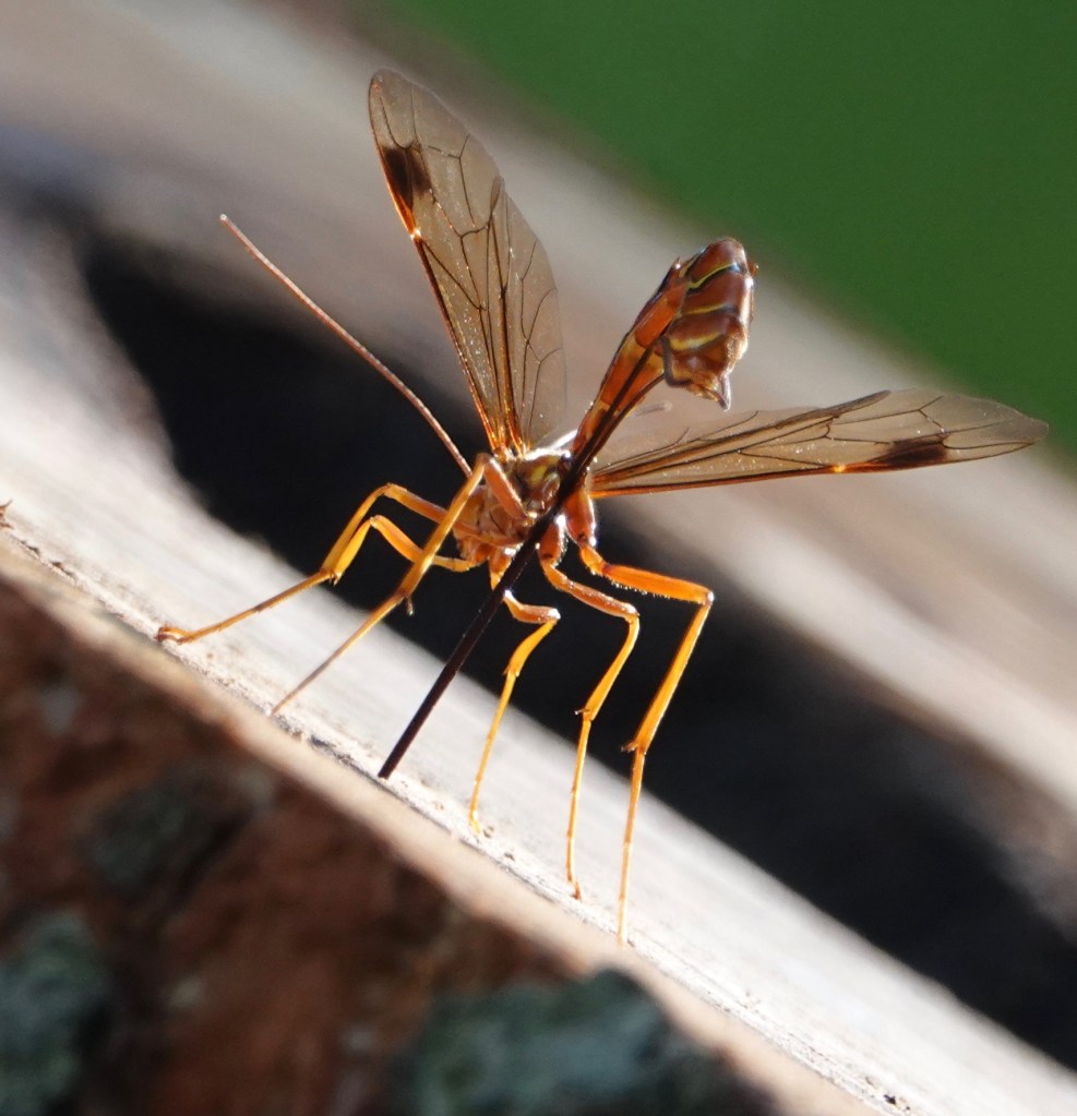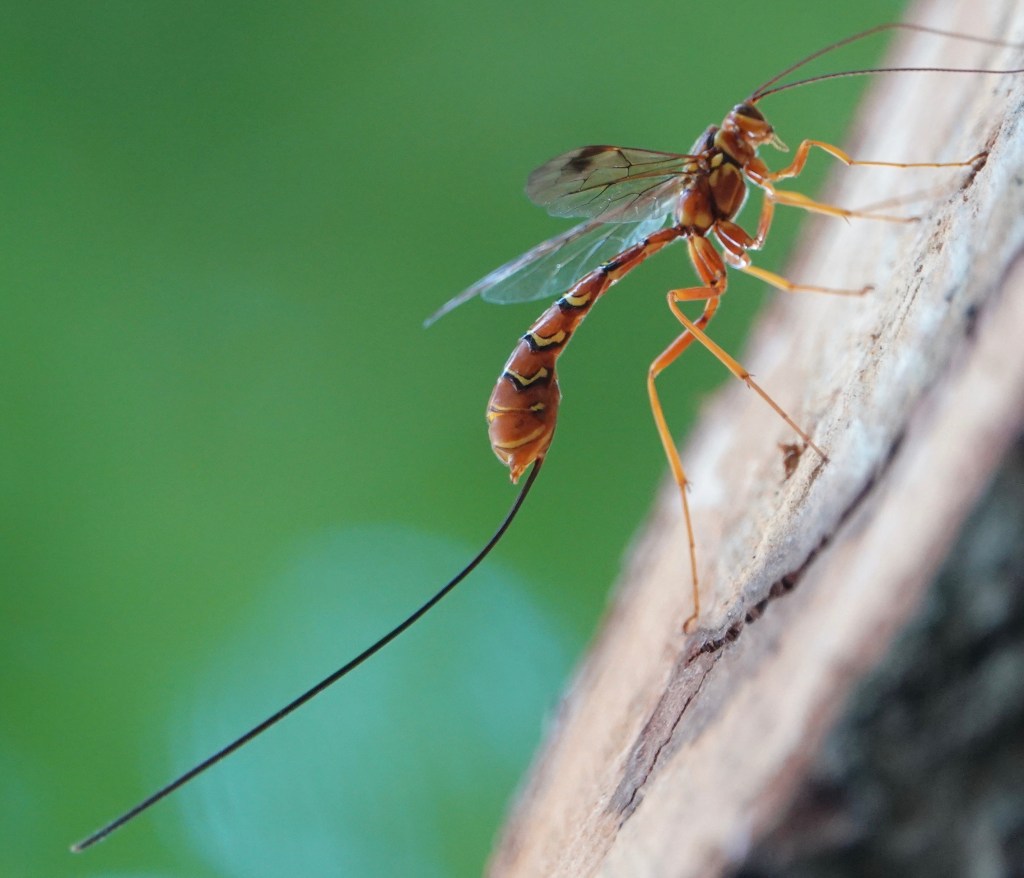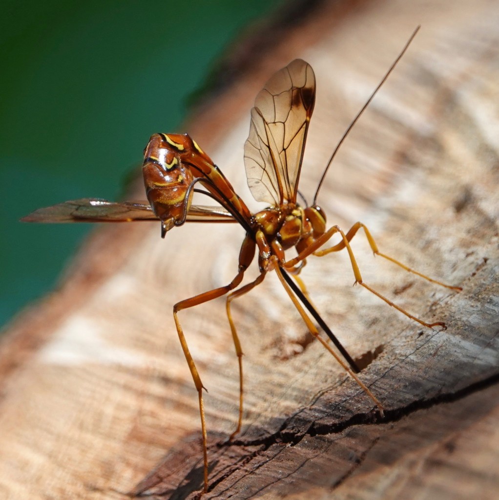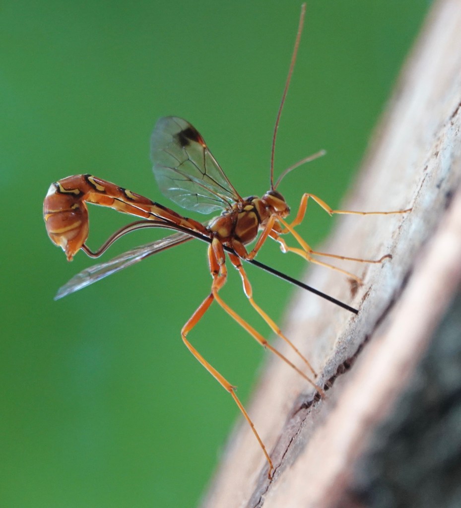 Last August, I watched a Long-tailed Giant Ichneumonid Wasp laying her eggs in the branch of a hickory in Green-Wood. (Spoiler: that’s not her above.)