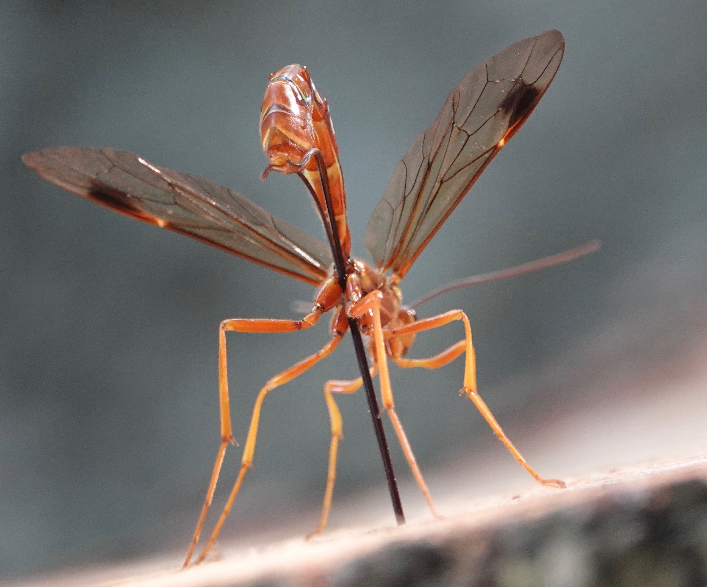 But when she pulled her ovipositor out (first image), I thought, well, that’s rather short, isn’t it? I mean, for these Megarhyssa macrurus beasts. That shorter ovipositor, and the wing pattern, show this to actually be another species of Megarhyssa. This is Greene’s Giant Icnheumonid, M. greenei.