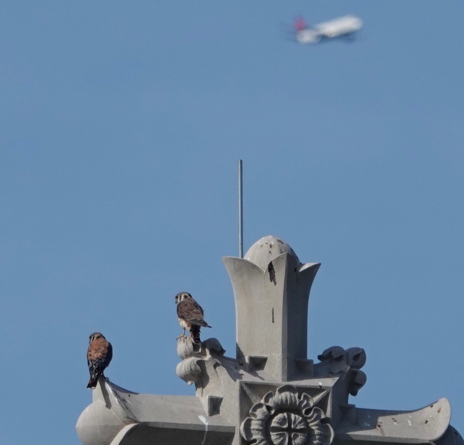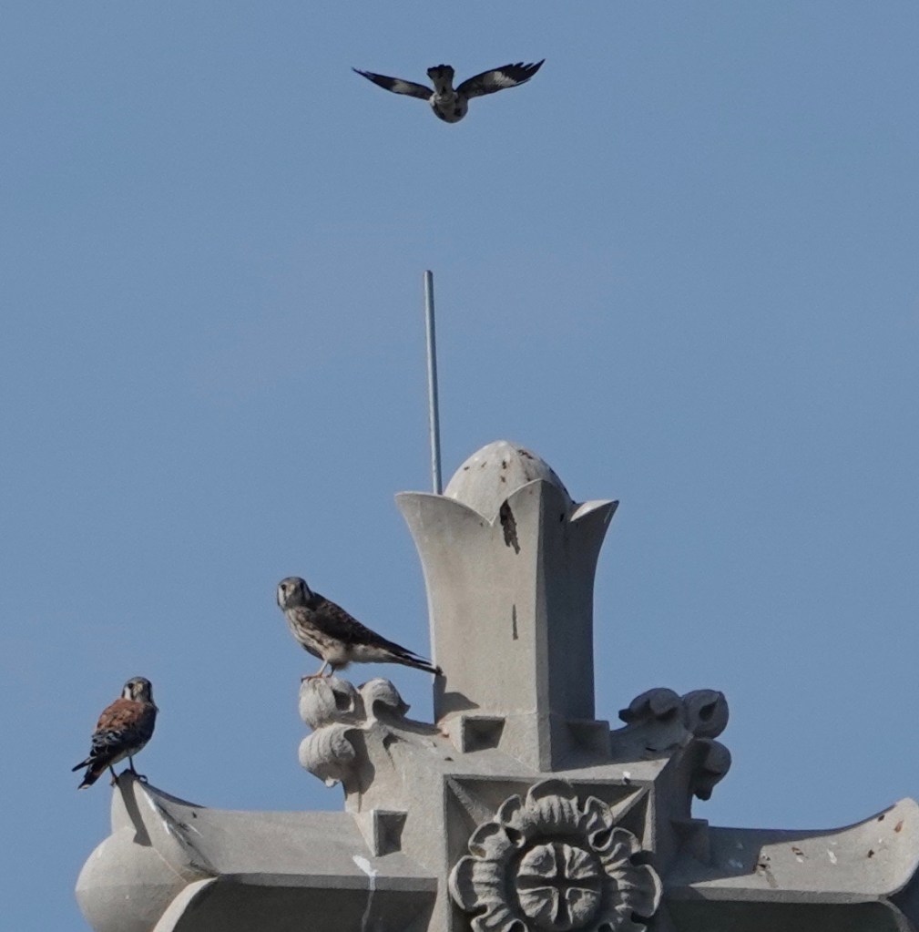 A male and female American Kestrel spotted recently together atop the Green-Wood Chapel. I’m not the only one who saw them. This Northern Mockingbird took exception to their presence. Later, two Eastern Kingbirds, who have been nesting nearby, dove at one of the little falcons atop a pine.