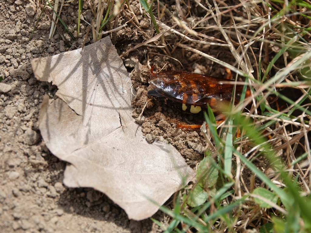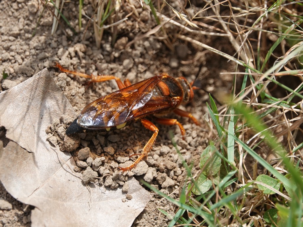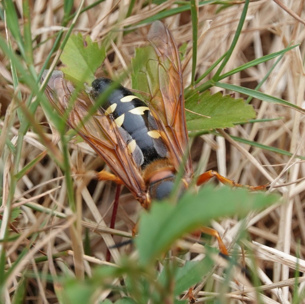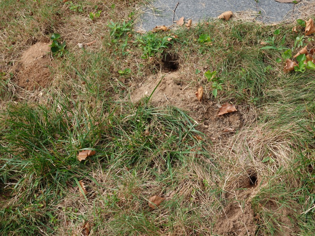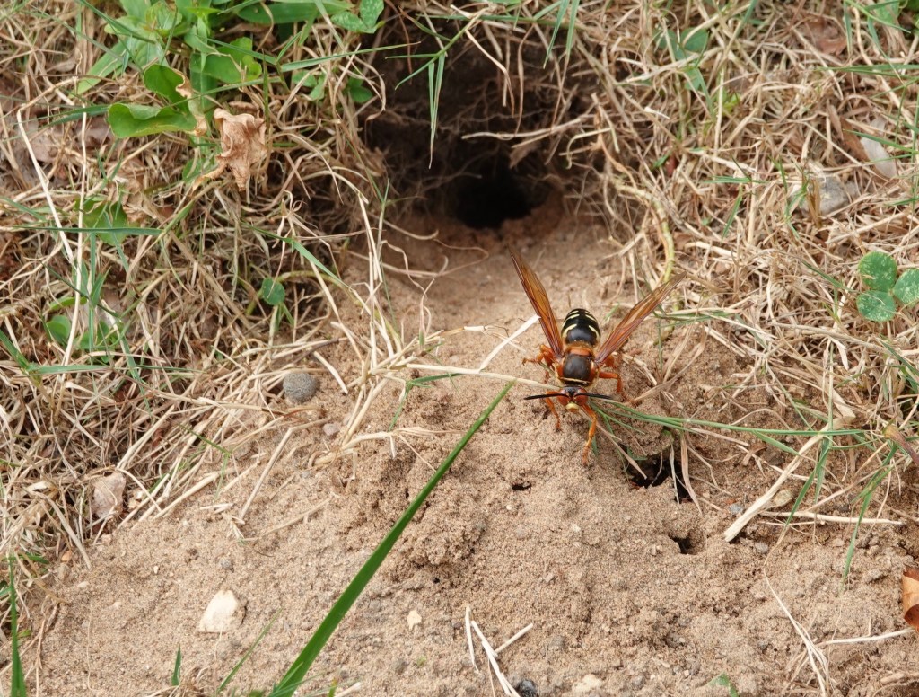 The Cicada-killer Wasps are out and about. They’ll take whole grassy knolls as their right and privilege. They’re so big you can easily see the variations of patterning and coloring on them. Insects are often taxed with looking exactly alike, but not if you look carefully.The females, notably larger than the males, excavate tunnels for their nests. These they pack with paralyzed cicadas as food for their larvae. Here’s one backing out, kicking back dirt as she goes.A wider view of one patch, with about seven nests. But not all these are necessarily Eastern Cicada-killer Wasp (Sphecius speciosu); buzz back tomorrow to see who else likes to nest in such surroundings.