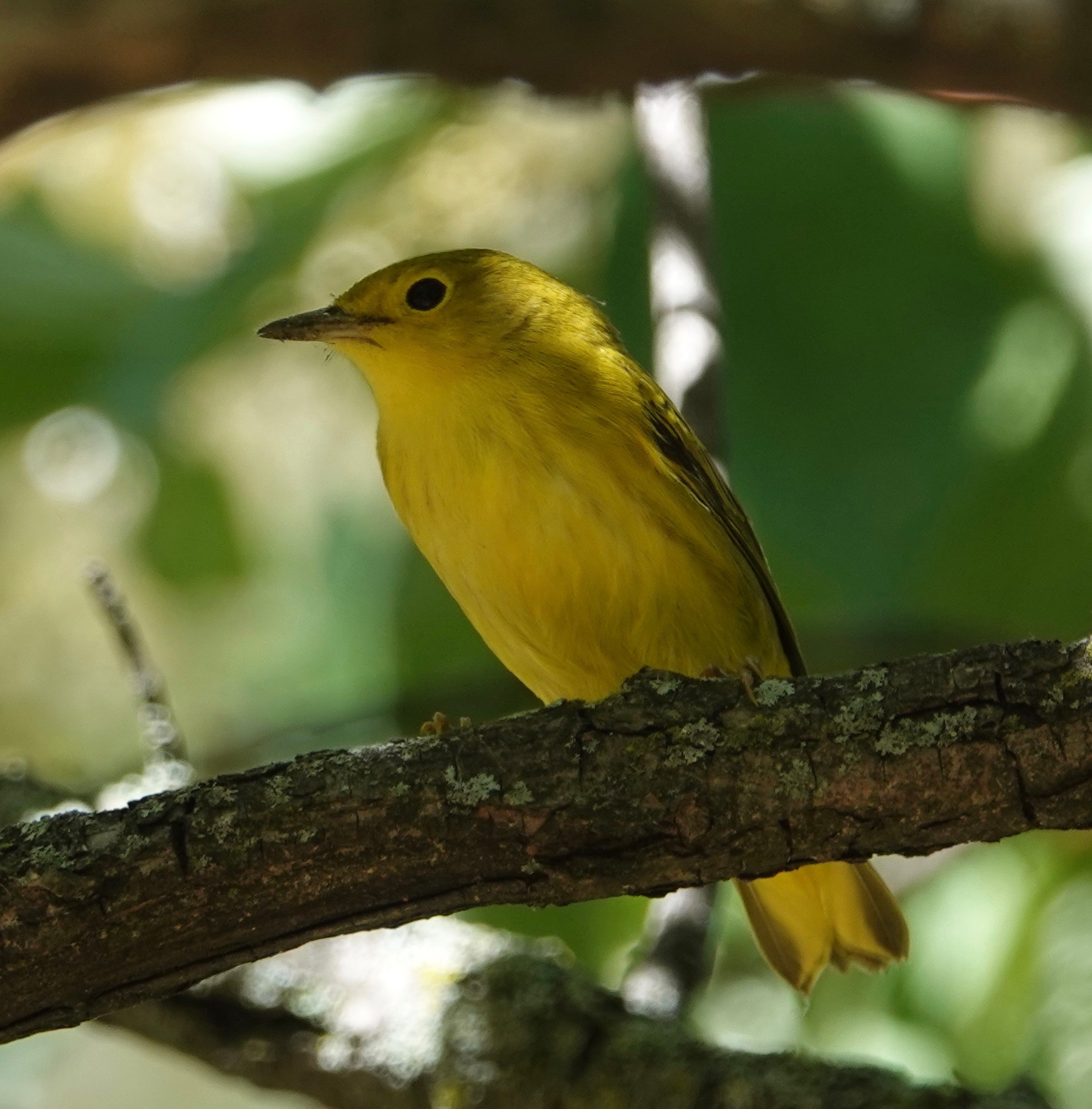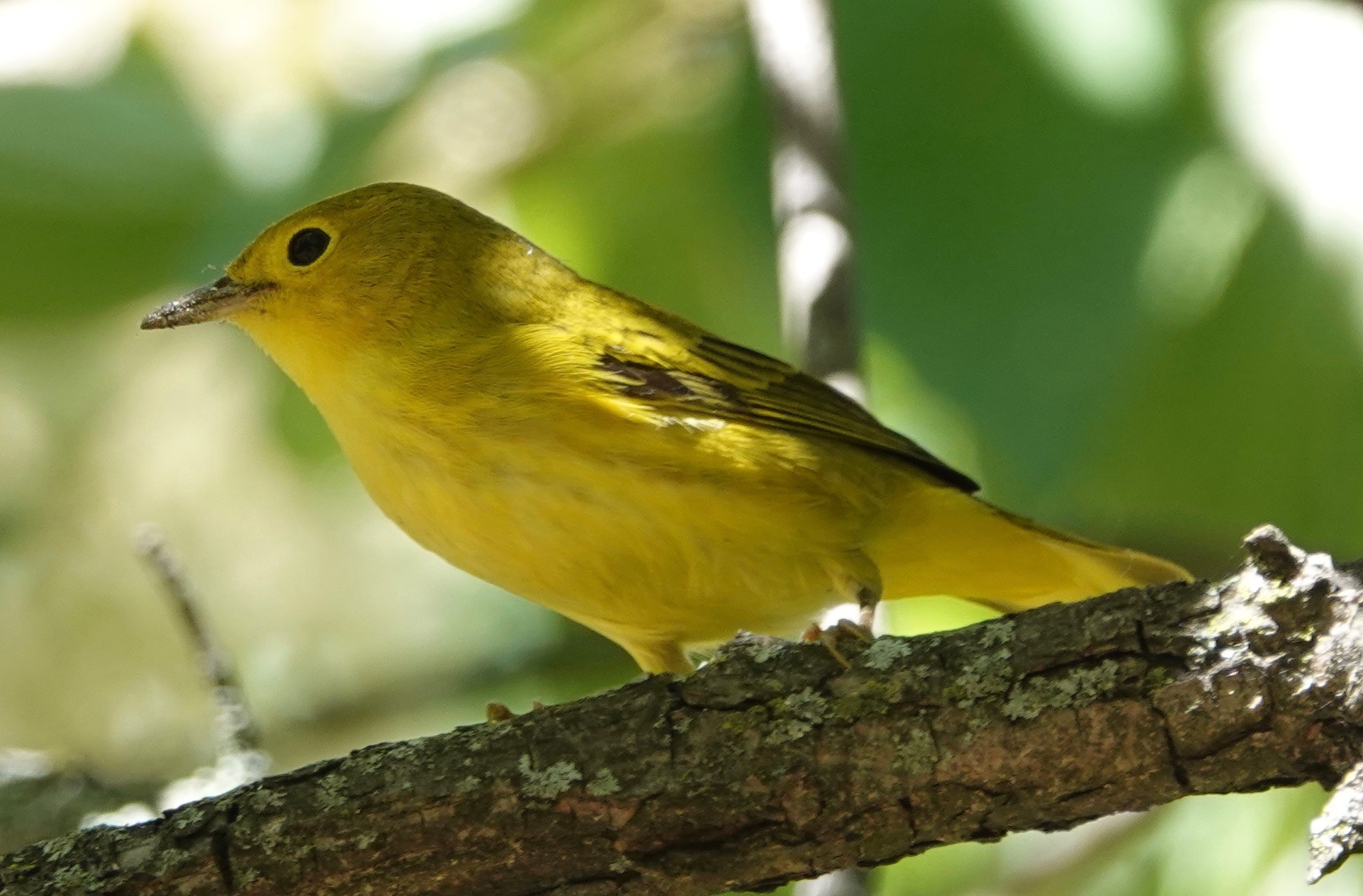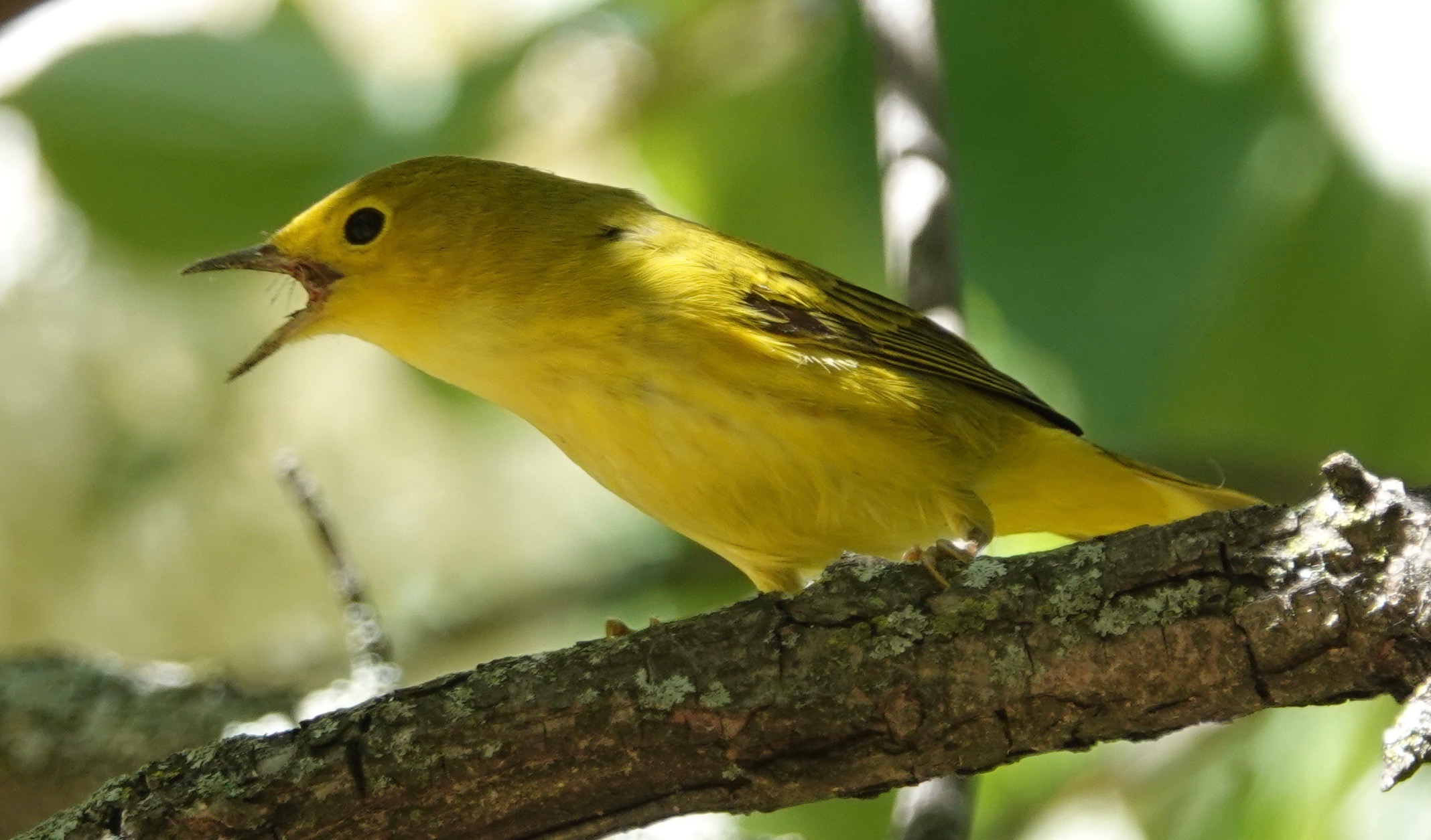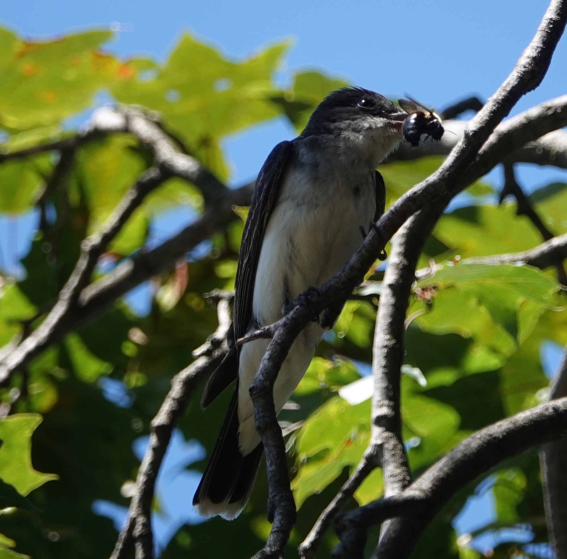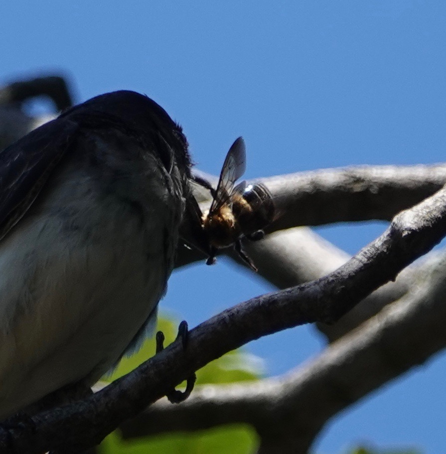 Now, this Yellow Warbler could be a local. They breed in Brooklyn. Or is it an early migrant? Either way, it’s just finished off an insect in the first image.Same place, around a blooming panicle hydrangea aswarm with pollinators, a young Eastern Kingbird, probably born nearby, is dispatching a Virginia Carpenter Bee.