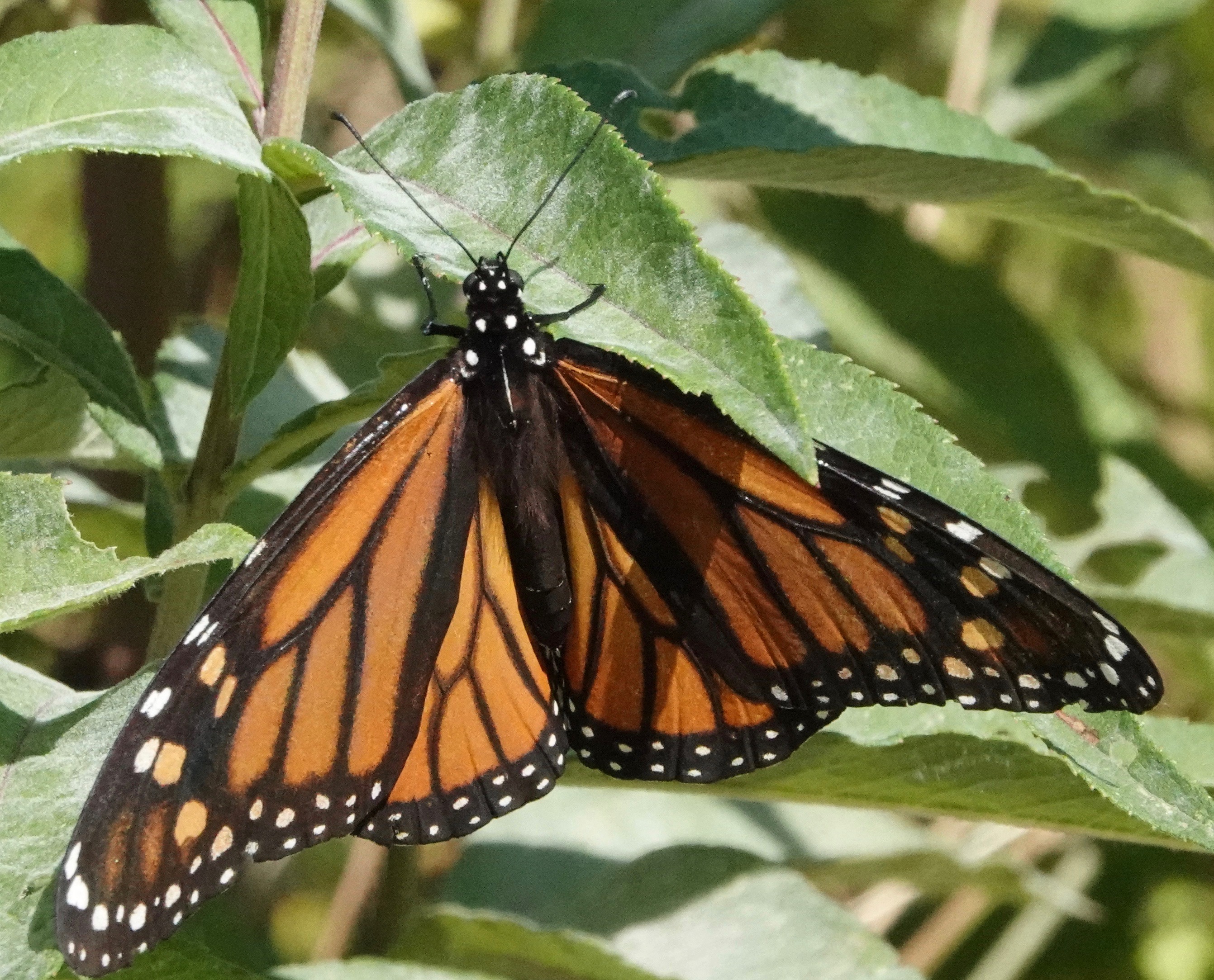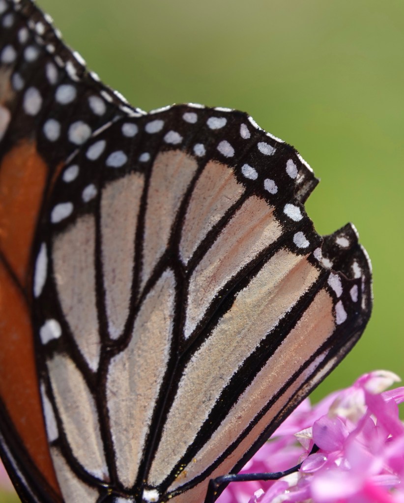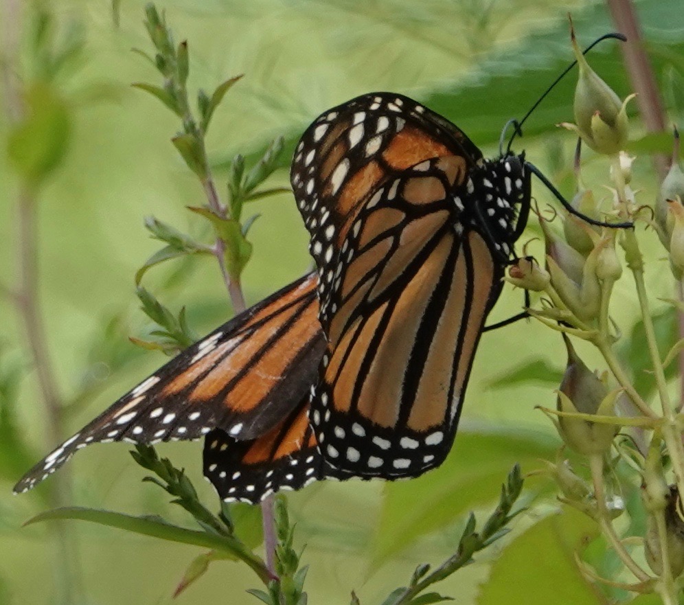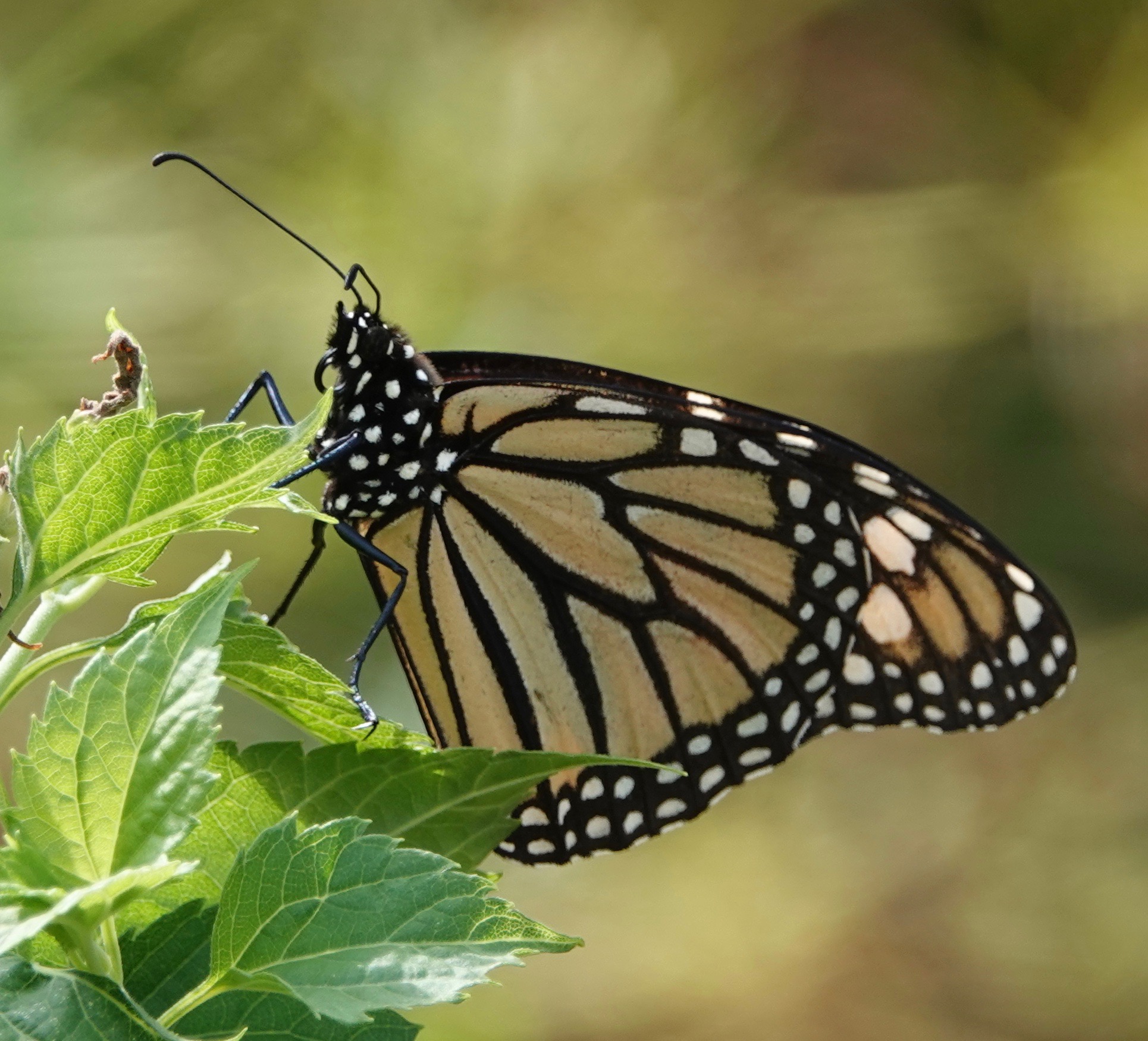 Individual Monarchs seen in the last few weeks, with detail of the notched wings of one of them.And one found dead, without an abdomen, which was probably eaten by something.