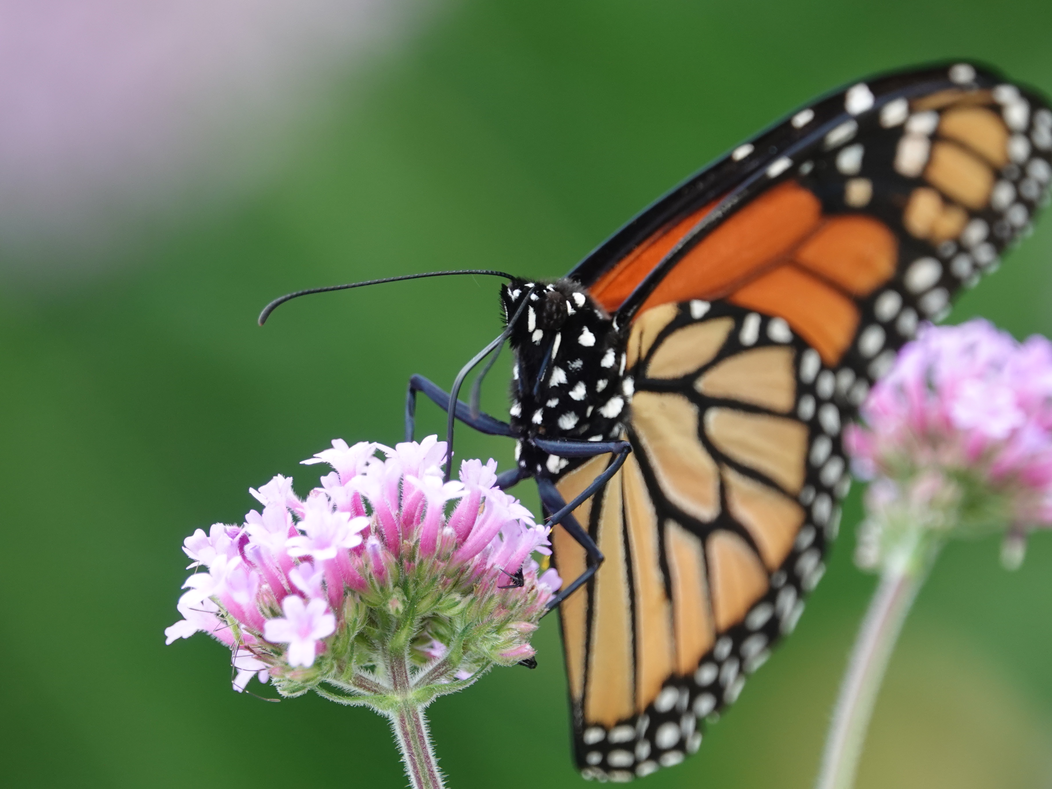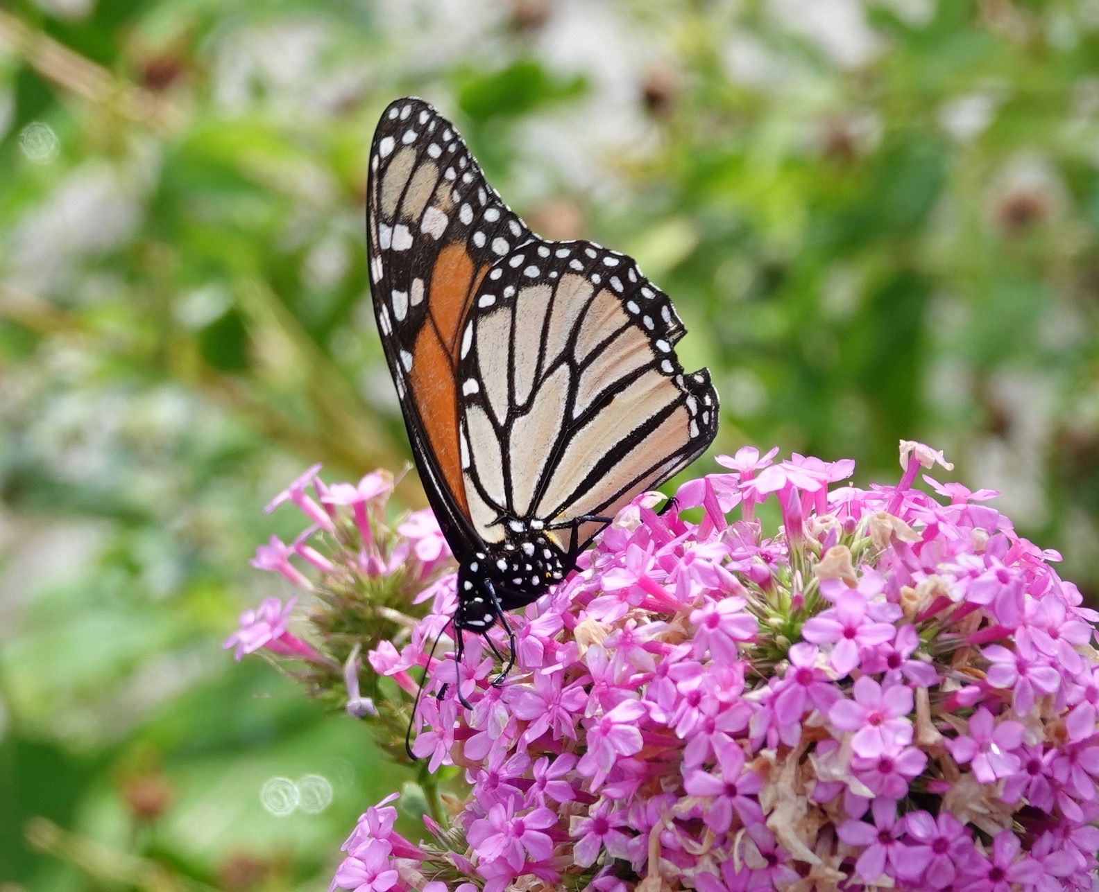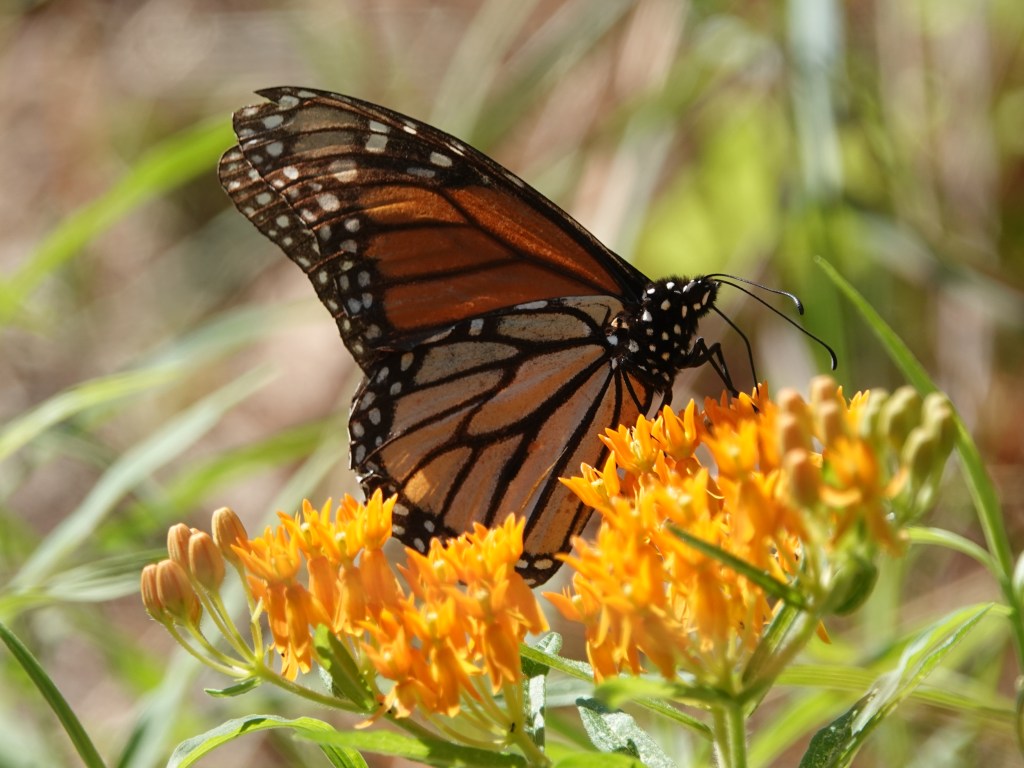 Individual Monarchs seen in the last few weeks, with detail of the notched wings of one of them.And one found dead, without an abdomen, which was probably eaten by something.