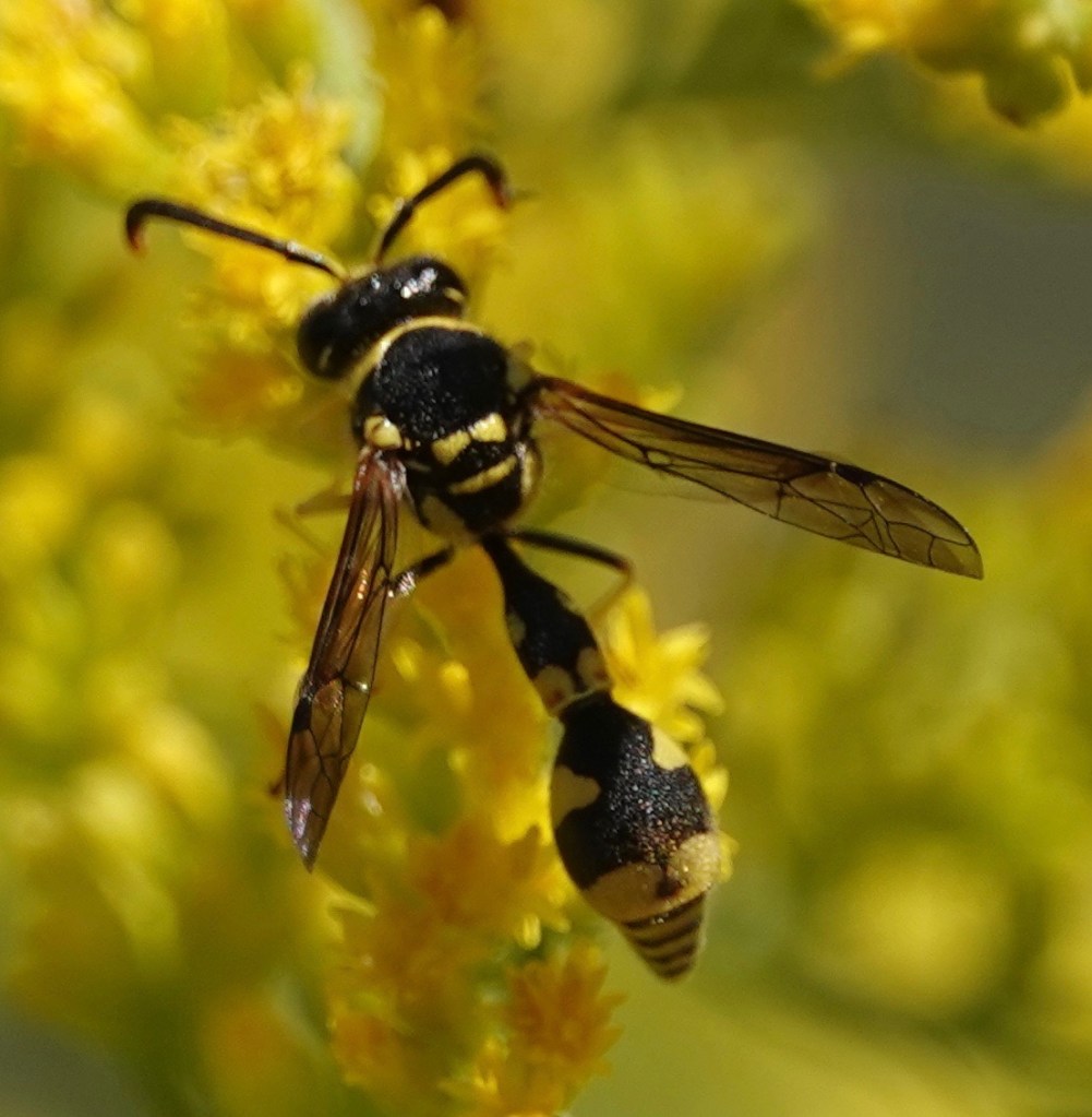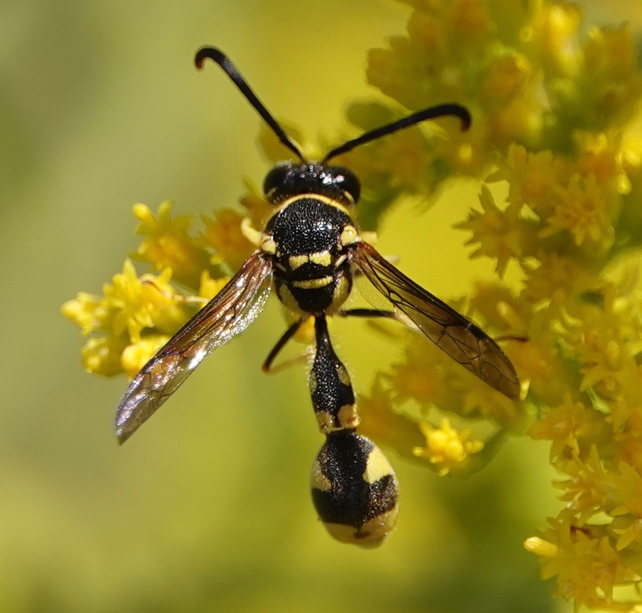 Photographing a small potter wasp on a wind-blown goldenrod is a challenge. But getting all the Eumenes mediterraneus down on INaturalist is a good thing. This European species somehow made it over the Atlantic fairly recently. I don’t see these in great numbers — one or two a day is usual–so far. Two years ago, I sent one of these to a wasp specialist in Canada to help cement the ID. Here’s that story.