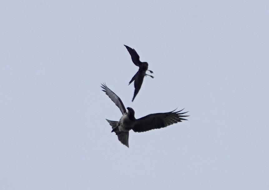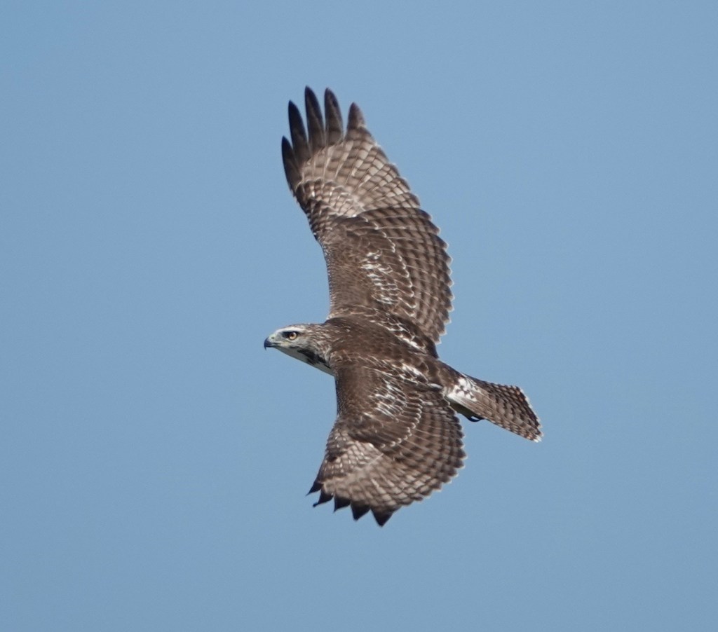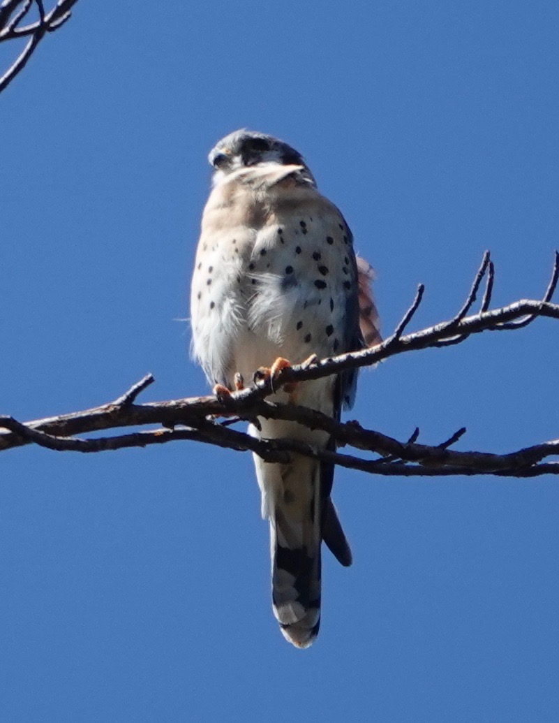 A familiar silhouette. Cooper’s Hawks do now breed in Brooklyn, but I haven’t seen one since the spring.Last week, a local or an early migrant passing through went after one of three Red-tails in the air. Two of these RTs were youngsters, the other an adult, so they were probably the pine nest family of the cemetery’s flatlands. And, on the other side of the cemetery, where one young Red-tail fledged, this could be the bird.Meanwhile, seeing this male American Kestrel atop this Beech pretty frequently.