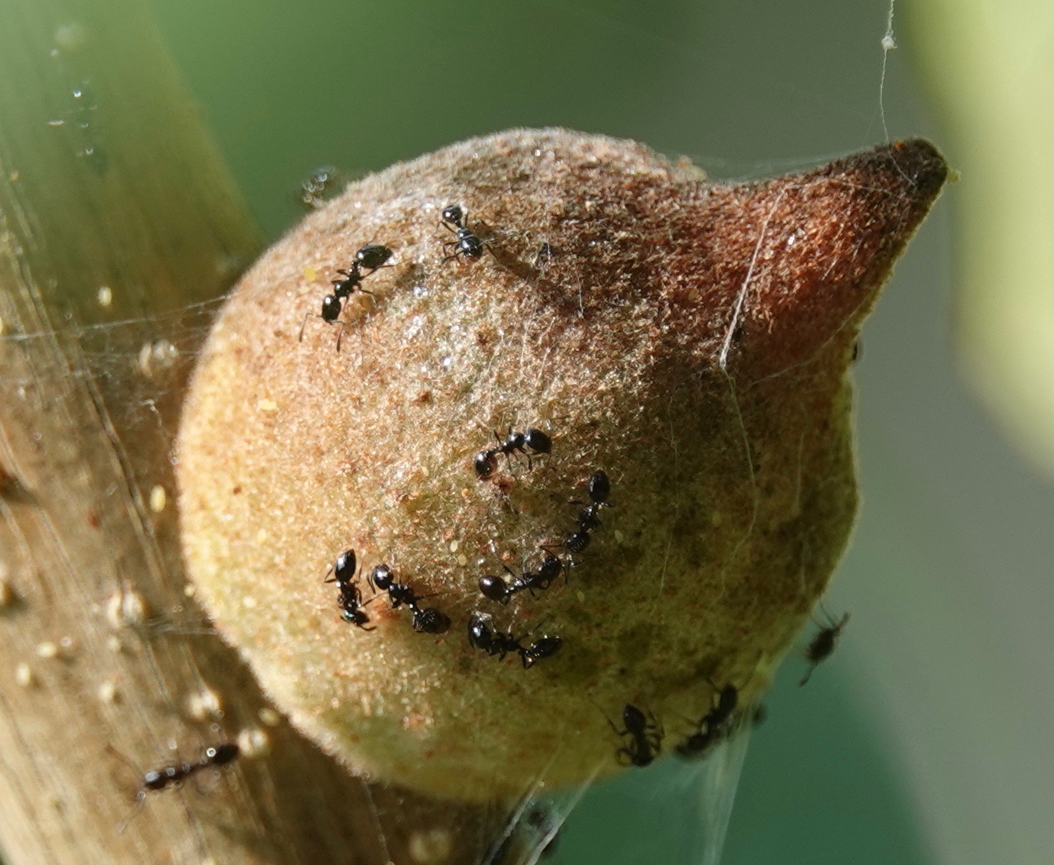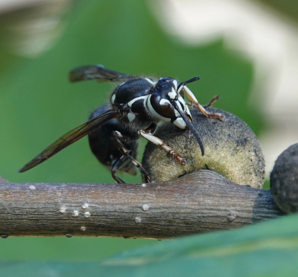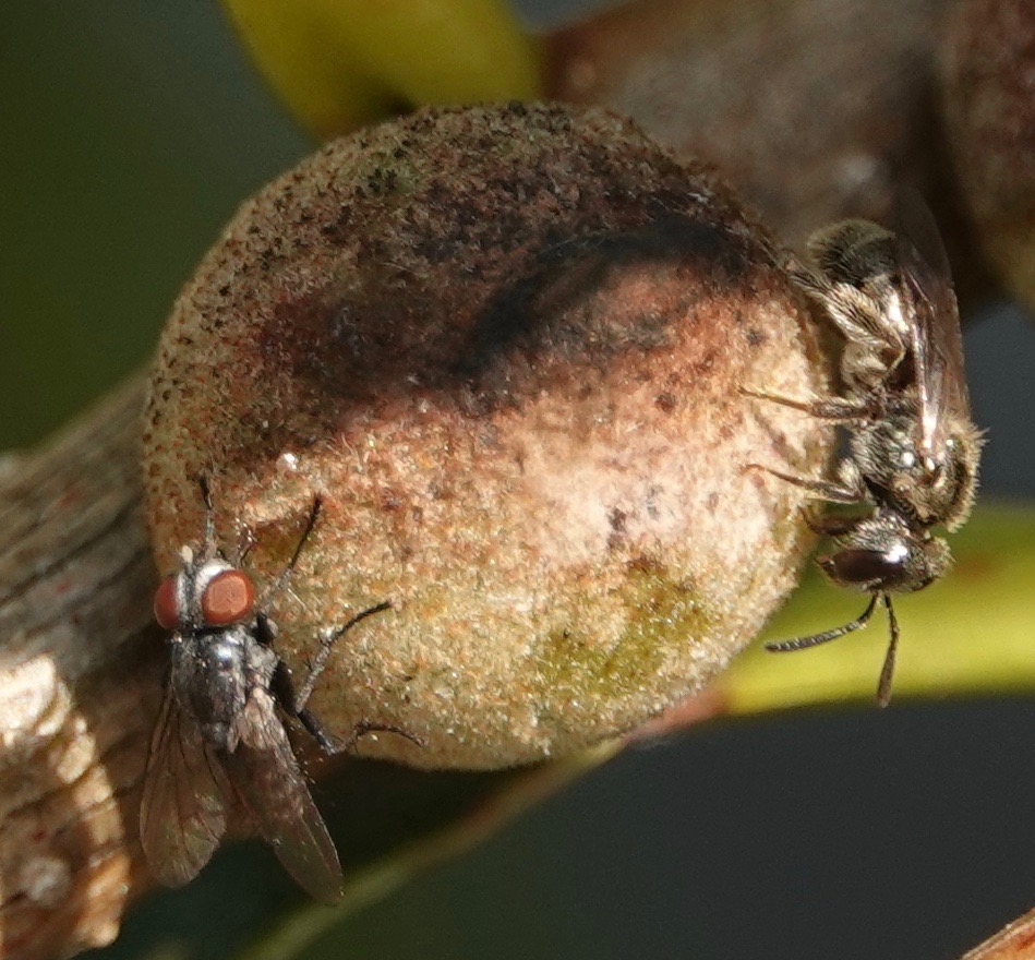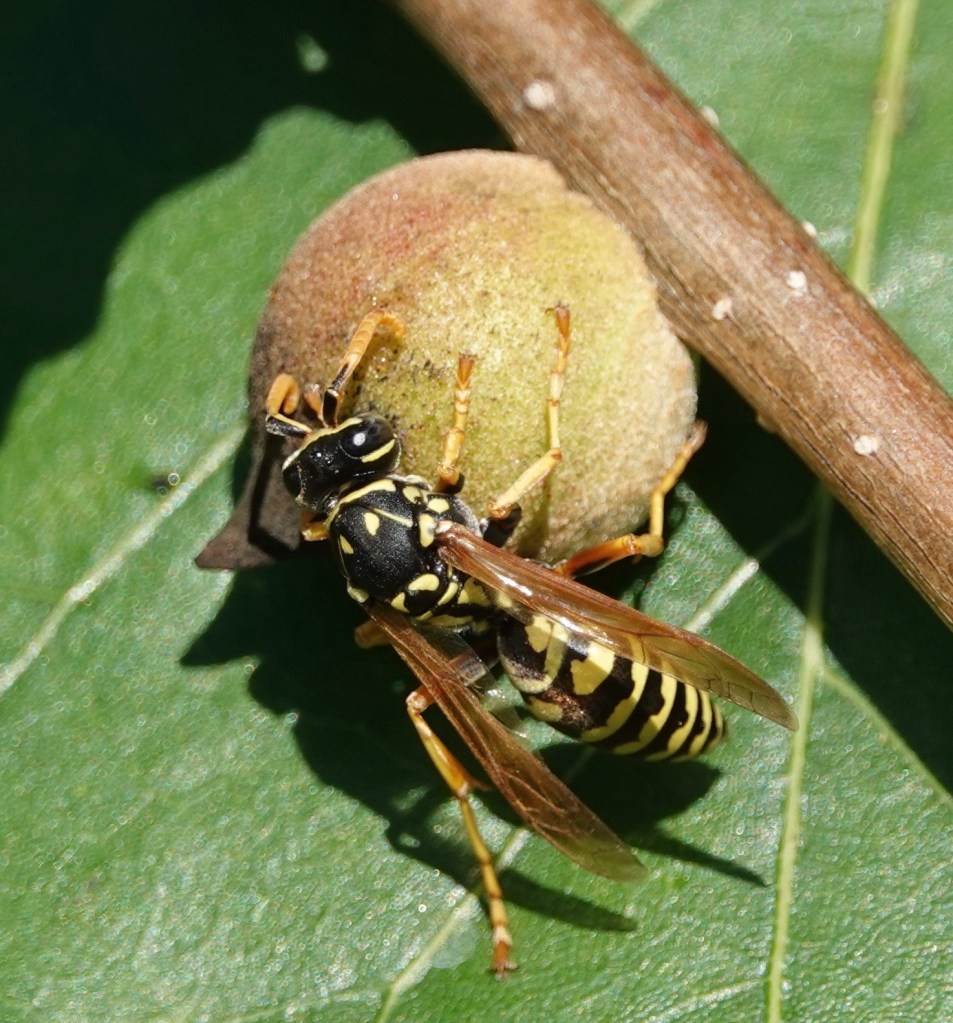 Oak Rough Bullet Gall wasps ( Disholcaspis quercusmamma) create stem galls on some species of white oaks. In Brooklyn, I find them on Swamp White Oaks (Quercus bicolor) with some frequency. Unusually for galls, these structures are also extrafloral nectaries, producing the sweet stuff that attracts ants, bees, flies, wasps, butteries, and other insects. (This thesis says 35 species of gall wasps, out of some 1300 Cynipidae species, have extrafloral attributes). It’s hypothesized that this helps protect the gall-inducers within from parasitoids and inquilines (which may or may not kill the host).