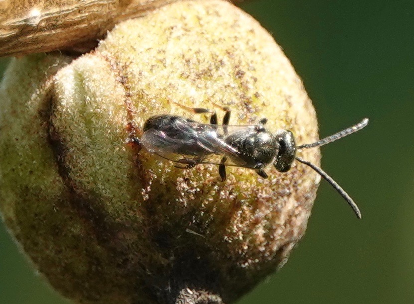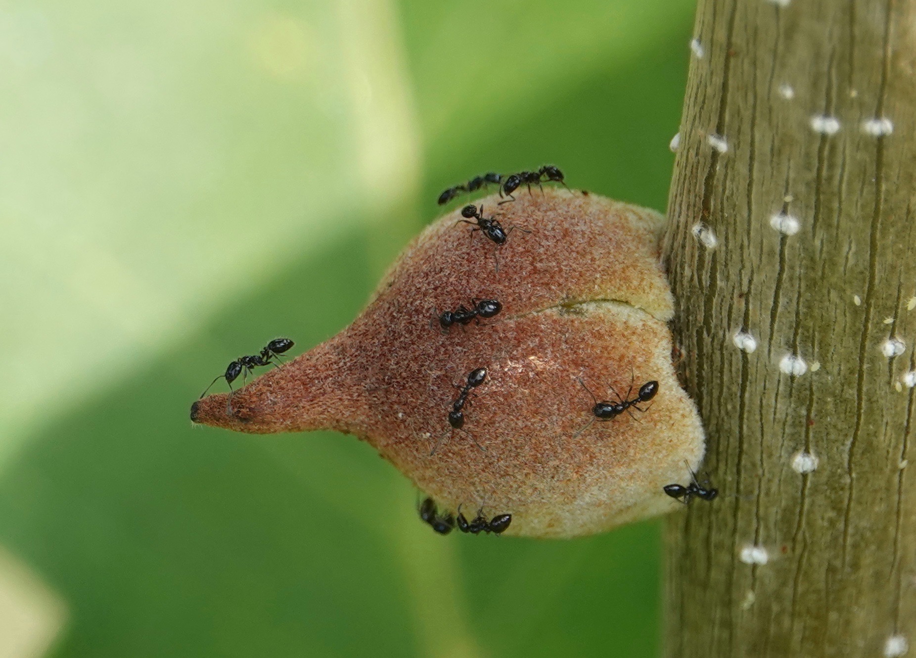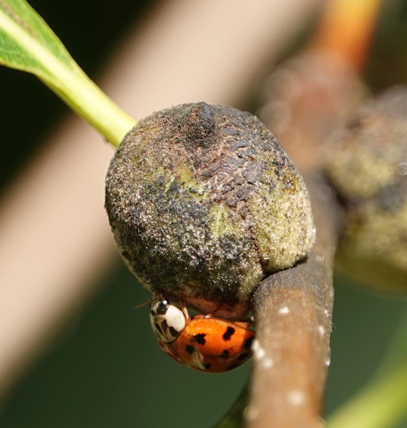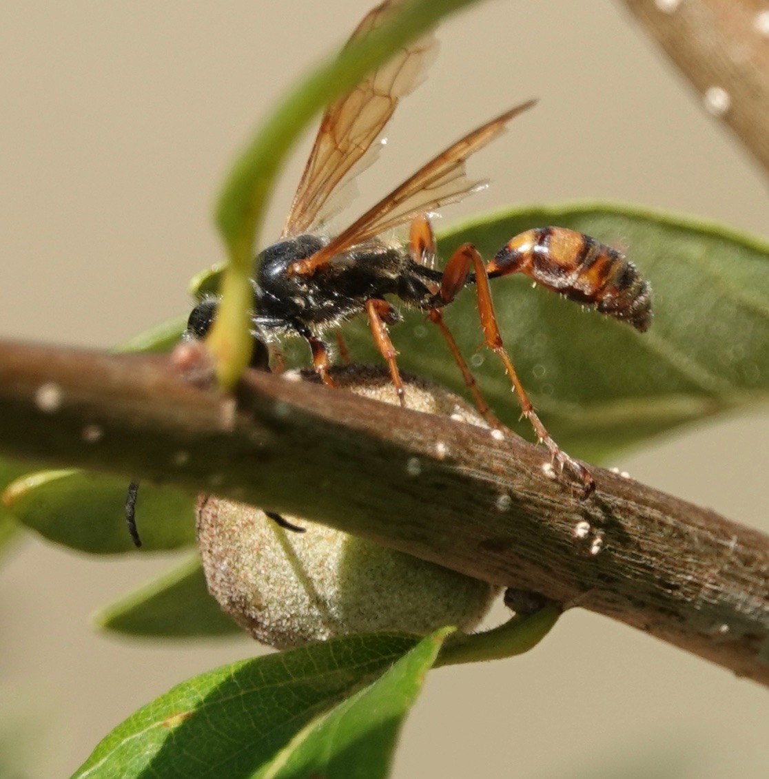 Oak Rough Bullet Gall wasps ( Disholcaspis quercusmamma) create stem galls on some species of white oaks. In Brooklyn, I find them on Swamp White Oaks (Quercus bicolor) with some frequency. Unusually for galls, these structures are also extrafloral nectaries, producing the sweet stuff that attracts ants, bees, flies, wasps, butteries, and other insects. (This thesis says 35 species of gall wasps, out of some 1300 Cynipidae species, have extrafloral attributes). It’s hypothesized that this helps protect the gall-inducers within from parasitoids and inquilines (which may or may not kill the host).