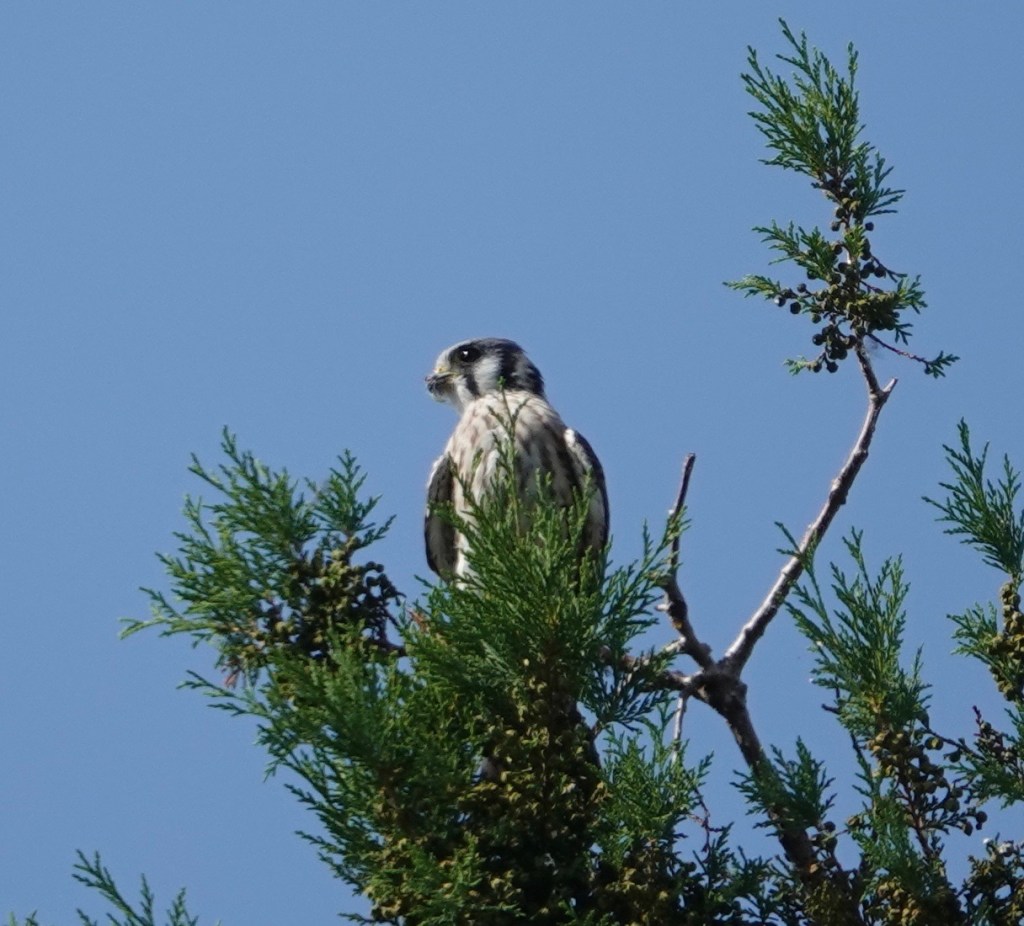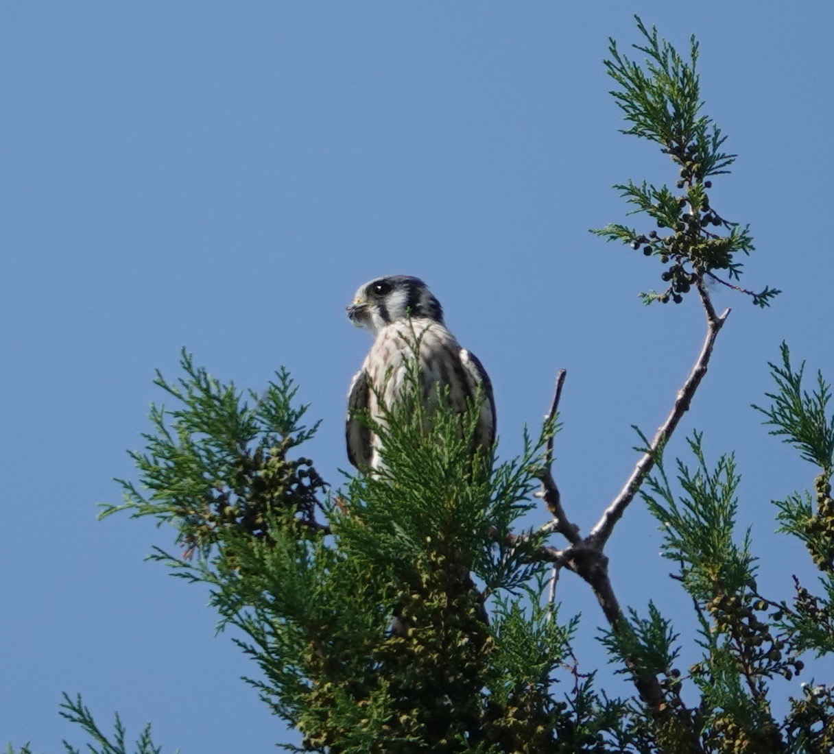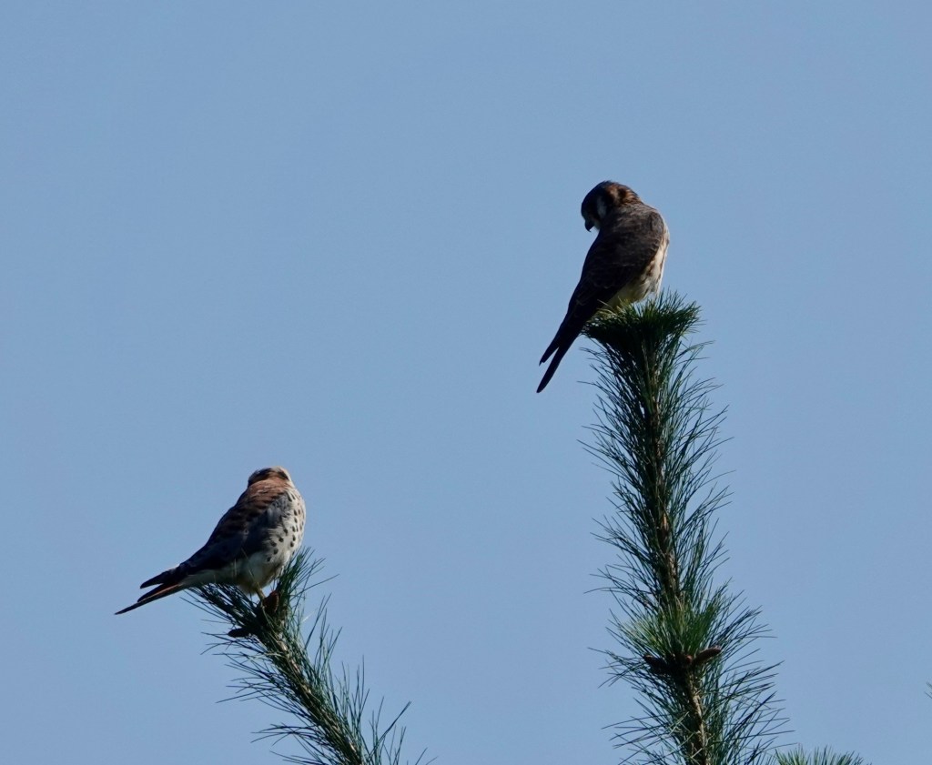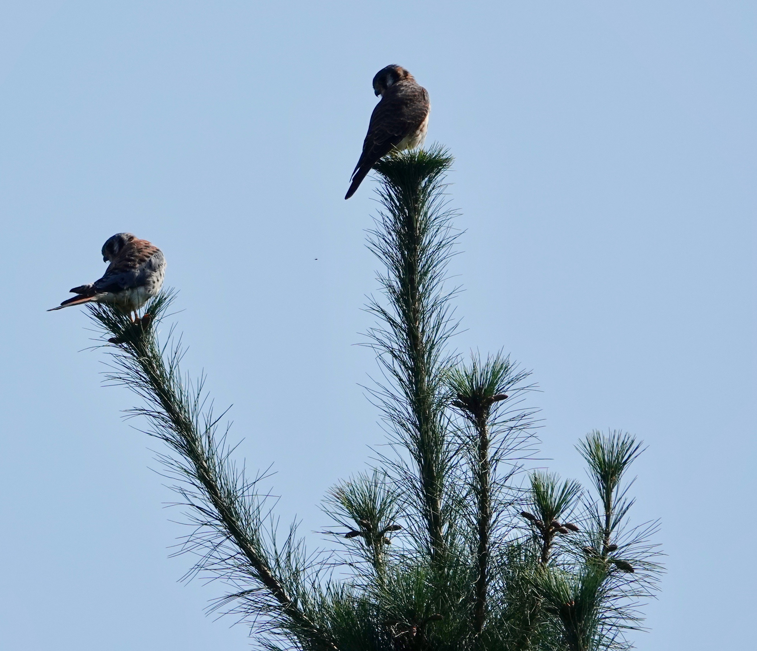A male American Kestrel at one end of Green-Wood. A different male American Kestrel in the middle of Green-Wood. While photographing this one, I heard two others.And soon found them: male on the left, female on the right.About twenty minutes later, the female had some prey.